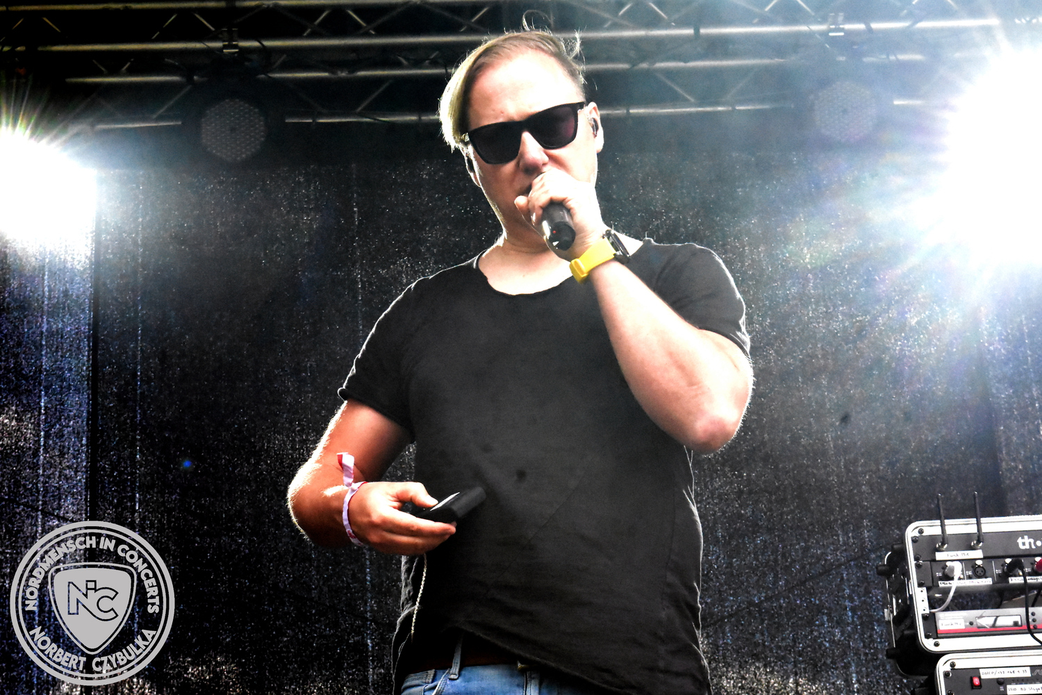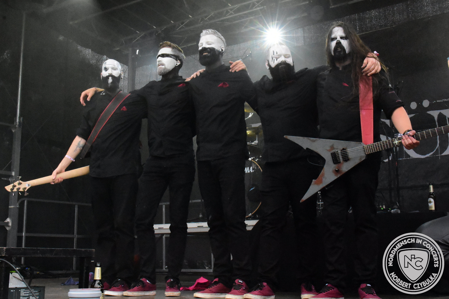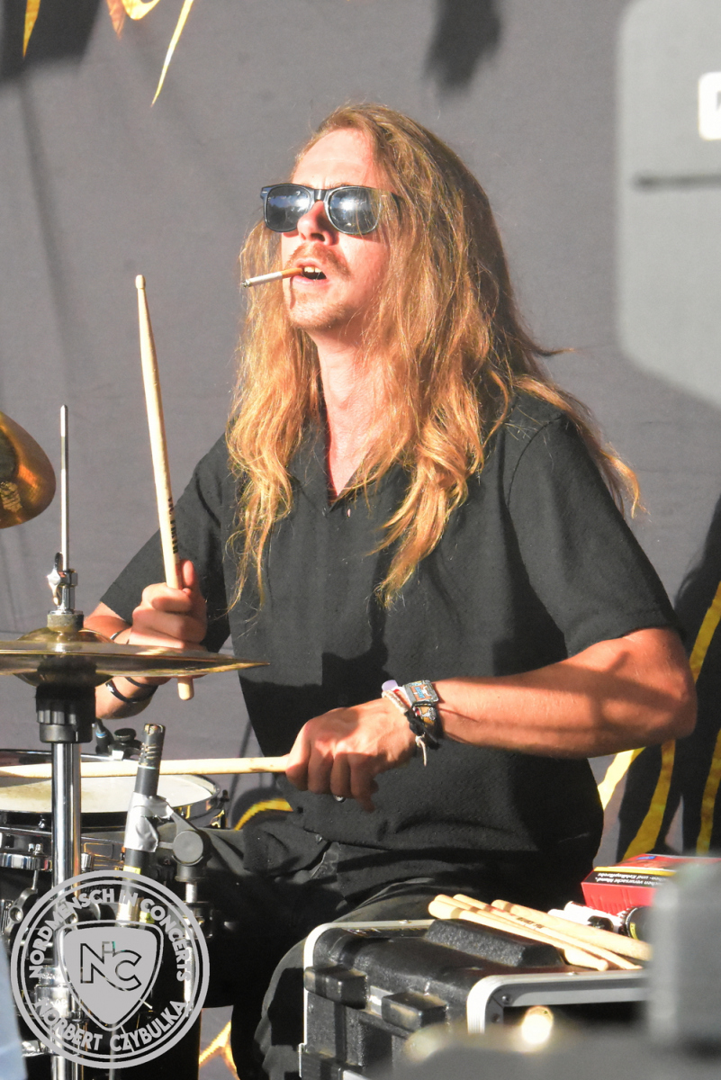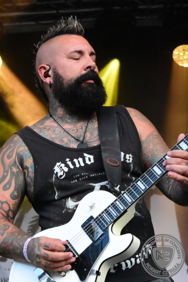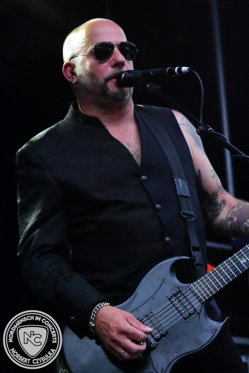 Um 20:30 Uhr dann das Highlicht dieses Festival-Wochenendes. Mono Inc. beendeten gerade erst ihre Symphonic-Tour und mussten wenige Wochen vor der Festival-Tour den Ausstieg von Bassmann Val Perun verkraften. Mit wem kommen die Monos nun auf Tour? Ein fester neuer Bassist oder eine Aushilfe? Beim Soundcheck dann die Auflösung. Als (erstmal) Aushilfe steht Ilja John Lappin von der Artcore/Progressive-Band The Hirsch Effekt auf der Bühne. Mit einem lauten Knall beginnt die Show. Die Monos sind die einzige Band, die wie bei Arabia oder After The War Feuersäulen auf die Bühne bringen. Im Festival-Set auch zwei Cover. Mit „Sleeping My Day Away“ steht mein Lieblingssong der Kopenhagener Band D-A-D (Disneyland After Dark) sowie mit „After The War“ einer der größten Hits von Gary Moore auf dem Programm. In Martin Englers Acoustic-Solo-Teil verwurstet er „Mein Gott Walter“ von Mike Krüger, „Hallelujah“ von Leonard Cohen sowie „Passenger“ von Iggy Pop. Nach dem obligatorischen Drum-Battle dürfen die beiden Überhits „Voices Of Doom“ sowie „Children Of The Dark“ nicht fehlen. Sie beenden das Konzert und somit das Festival. Der Platz leert sich rasend schnell. Während der große Strom in Richtung Campground wandert, füllt sich auch der Club wieder.