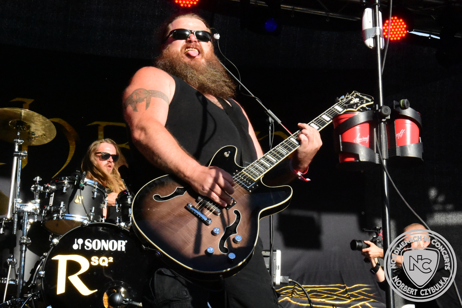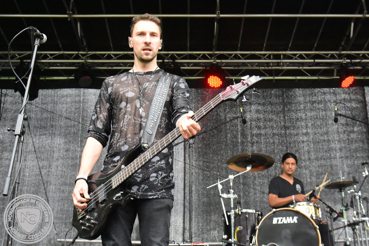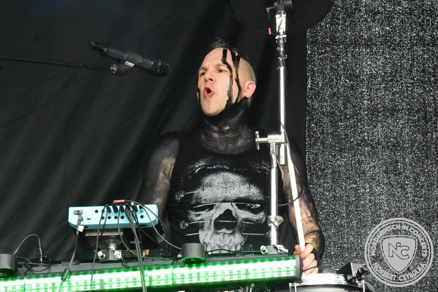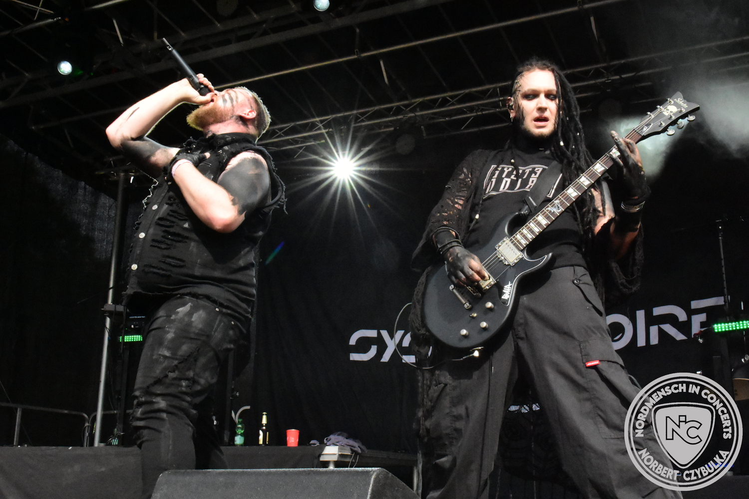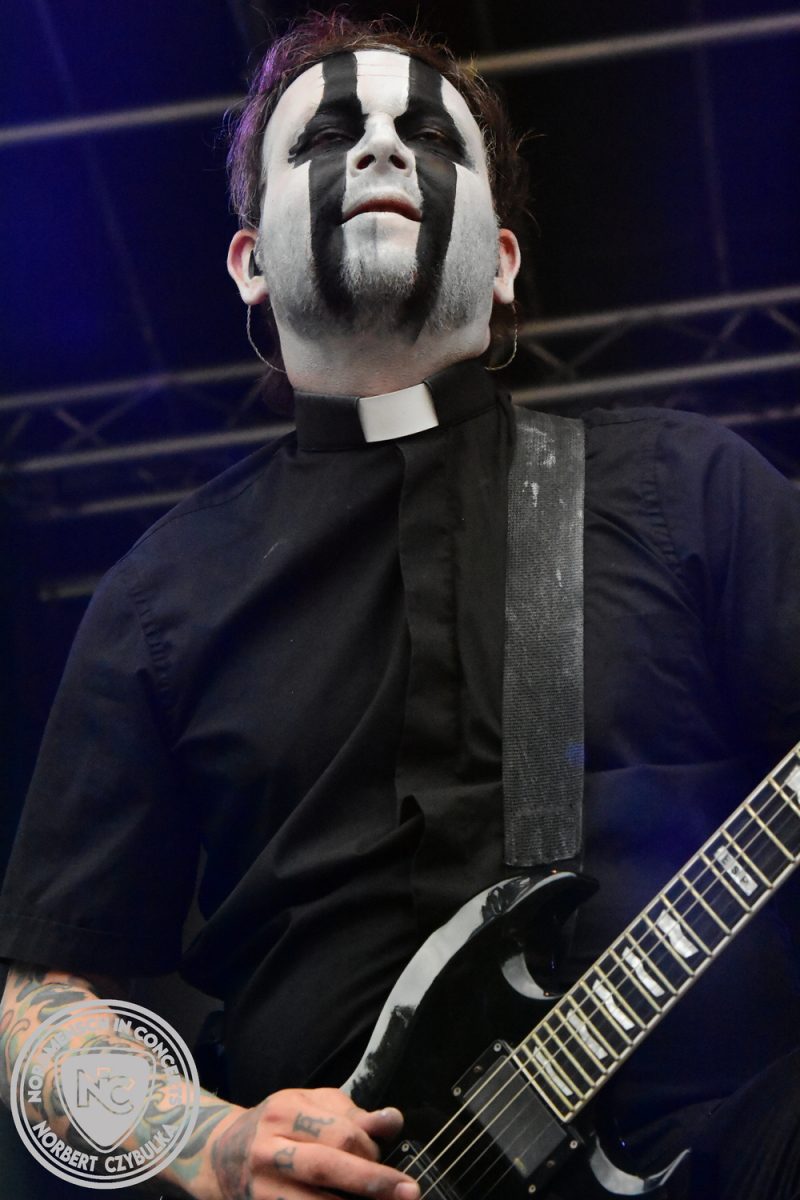 Um 20:30 Uhr dann das Highlicht dieses Festival-Wochenendes. Mono Inc. beendeten gerade erst ihre Symphonic-Tour und mussten wenige Wochen vor der Festival-Tour den Ausstieg von Bassmann Val Perun verkraften. Mit wem kommen die Monos nun auf Tour? Ein fester neuer Bassist oder eine Aushilfe? Beim Soundcheck dann die Auflösung. Als (erstmal) Aushilfe steht Ilja John Lappin von der Artcore/Progressive-Band The Hirsch Effekt auf der Bühne. Mit einem lauten Knall beginnt die Show. Die Monos sind die einzige Band, die wie bei Arabia oder After The War Feuersäulen auf die Bühne bringen. Im Festival-Set auch zwei Cover. Mit „Sleeping My Day Away“ steht mein Lieblingssong der Kopenhagener Band D-A-D (Disneyland After Dark) sowie mit „After The War“ einer der größten Hits von Gary Moore auf dem Programm. In Martin Englers Acoustic-Solo-Teil verwurstet er „Mein Gott Walter“ von Mike Krüger, „Hallelujah“ von Leonard Cohen sowie „Passenger“ von Iggy Pop. Nach dem obligatorischen Drum-Battle dürfen die beiden Überhits „Voices Of Doom“ sowie „Children Of The Dark“ nicht fehlen. Sie beenden das Konzert und somit das Festival. Der Platz leert sich rasend schnell. Während der große Strom in Richtung Campground wandert, füllt sich auch der Club wieder.
