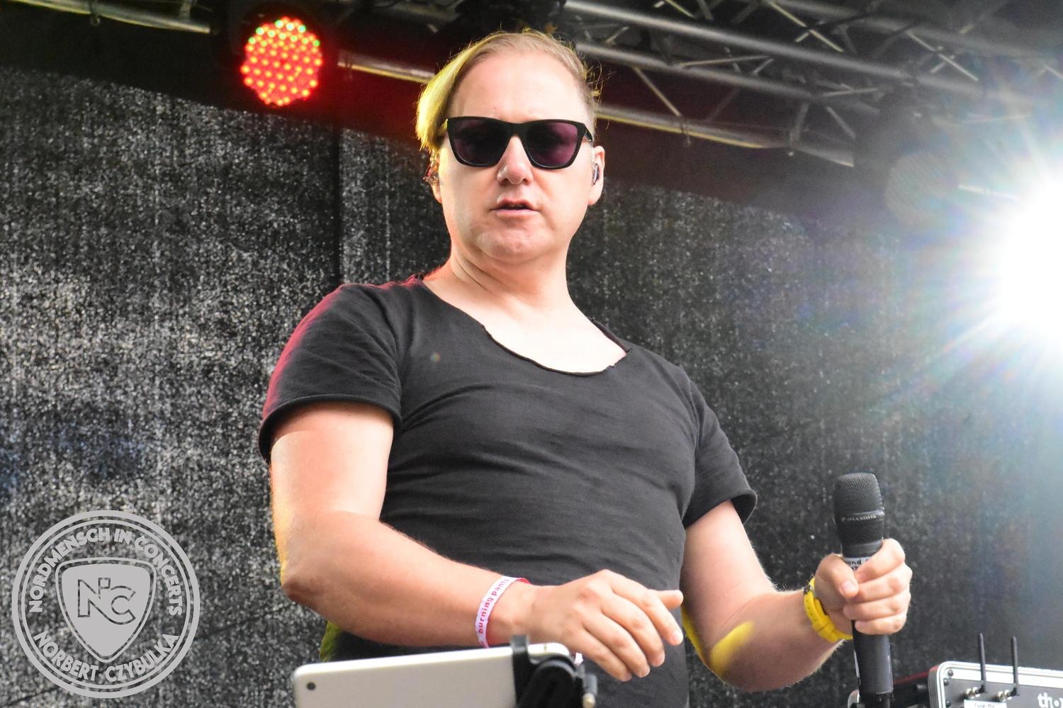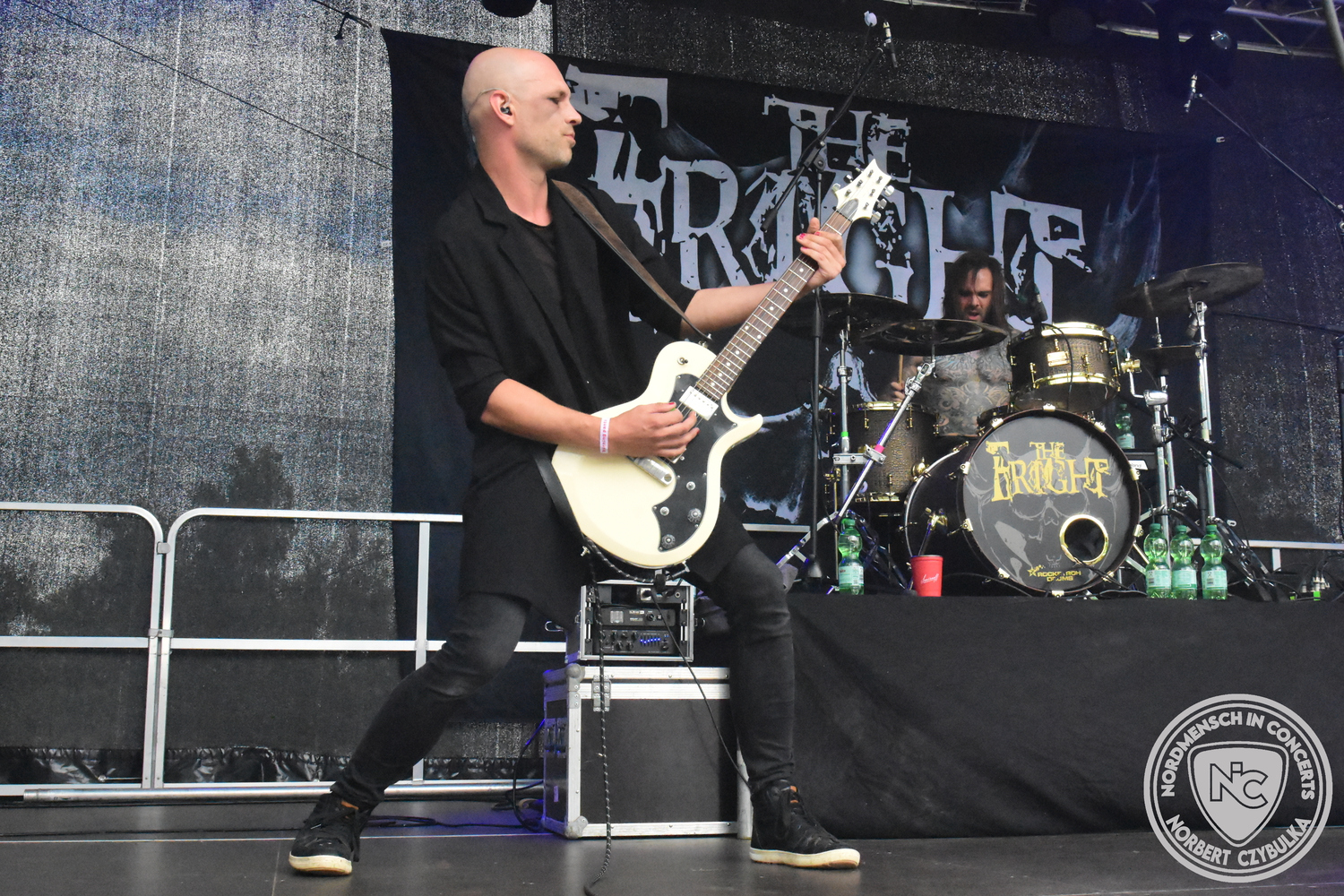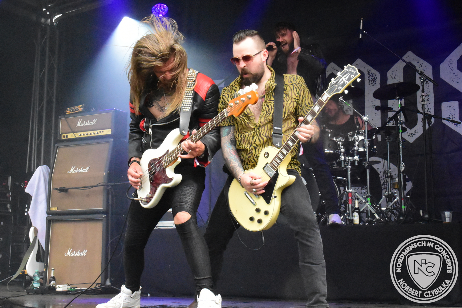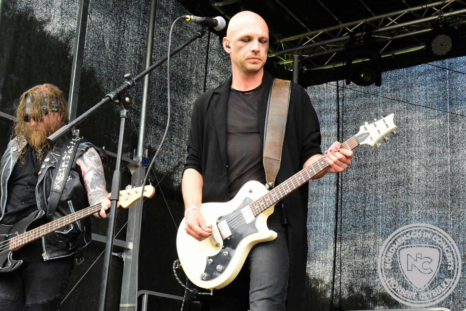 Um 20:30 Uhr dann das Highlicht dieses Festival-Wochenendes. Mono Inc. beendeten gerade erst ihre Symphonic-Tour und mussten wenige Wochen vor der Festival-Tour den Ausstieg von Bassmann Val Perun verkraften. Mit wem kommen die Monos nun auf Tour? Ein fester neuer Bassist oder eine Aushilfe? Beim Soundcheck dann die Auflösung. Als (erstmal) Aushilfe steht Ilja John Lappin von der Artcore/Progressive-Band The Hirsch Effekt auf der Bühne. Mit einem lauten Knall beginnt die Show. Die Monos sind die einzige Band, die wie bei Arabia oder After The War Feuersäulen auf die Bühne bringen. Im Festival-Set auch zwei Cover. Mit „Sleeping My Day Away“ steht mein Lieblingssong der Kopenhagener Band D-A-D (Disneyland After Dark) sowie mit „After The War“ einer der größten Hits von Gary Moore auf dem Programm. In Martin Englers Acoustic-Solo-Teil verwurstet er „Mein Gott Walter“ von Mike Krüger, „Hallelujah“ von Leonard Cohen sowie „Passenger“ von Iggy Pop. Nach dem obligatorischen Drum-Battle dürfen die beiden Überhits „Voices Of Doom“ sowie „Children Of The Dark“ nicht fehlen. Sie beenden das Konzert und somit das Festival. Der Platz leert sich rasend schnell. Während der große Strom in Richtung Campground wandert, füllt sich auch der Club wieder.