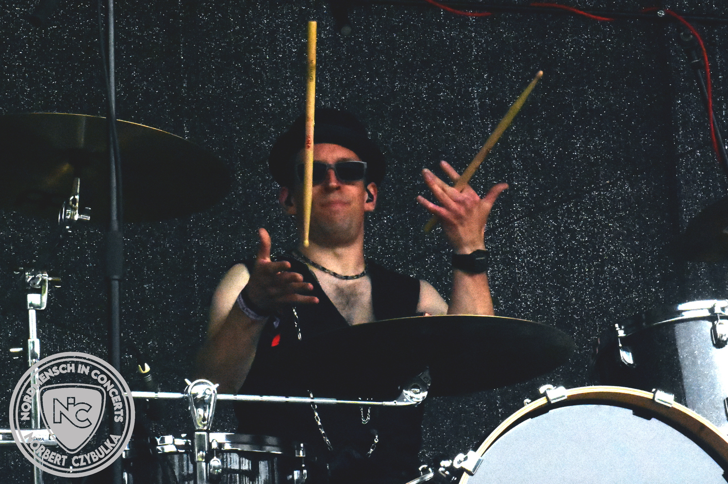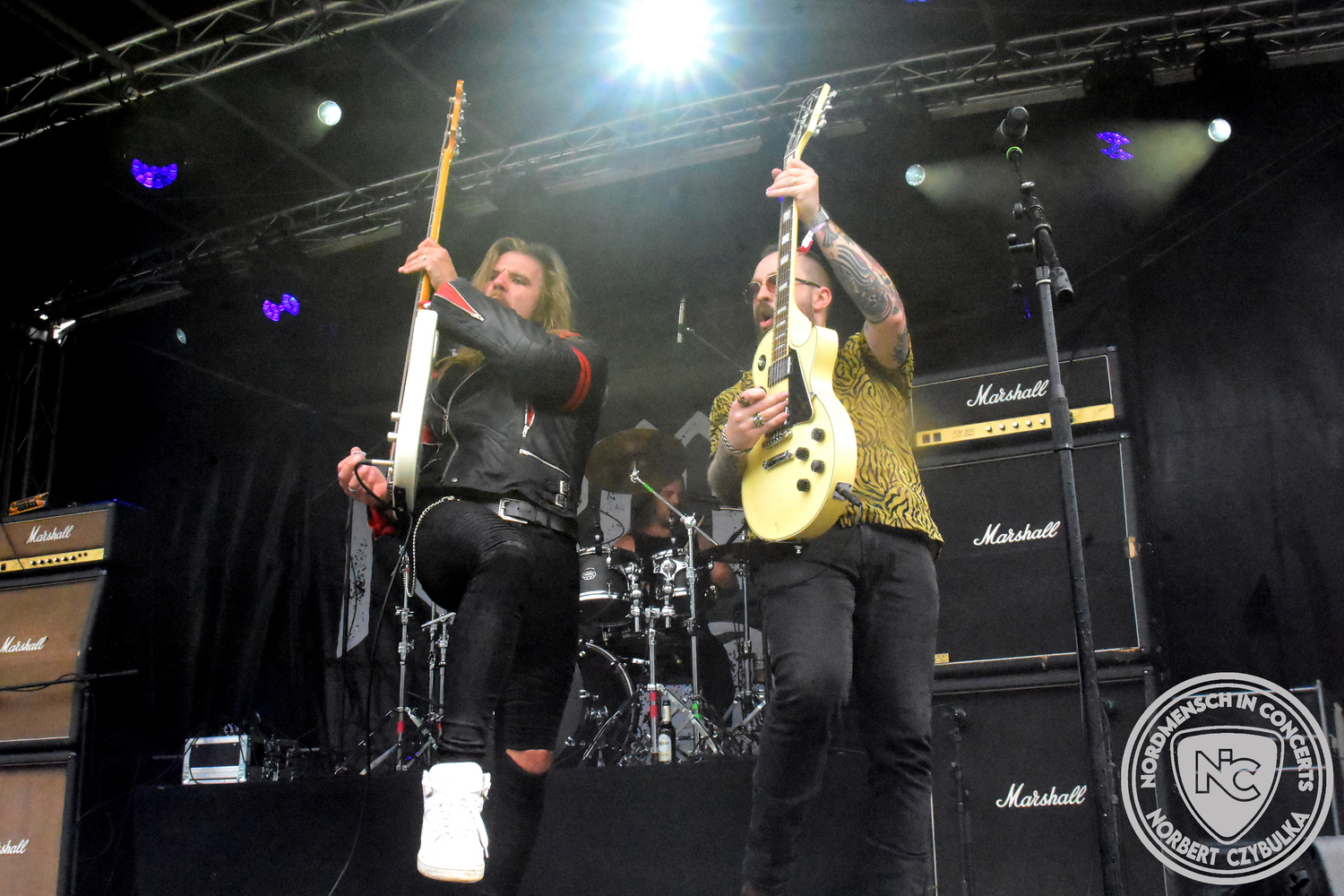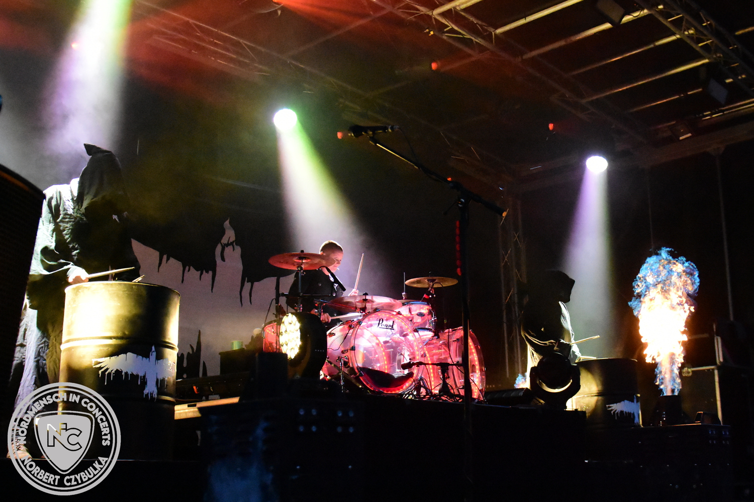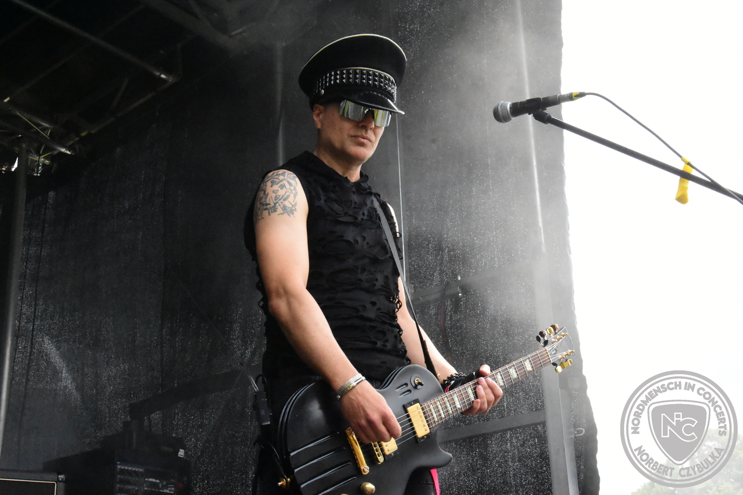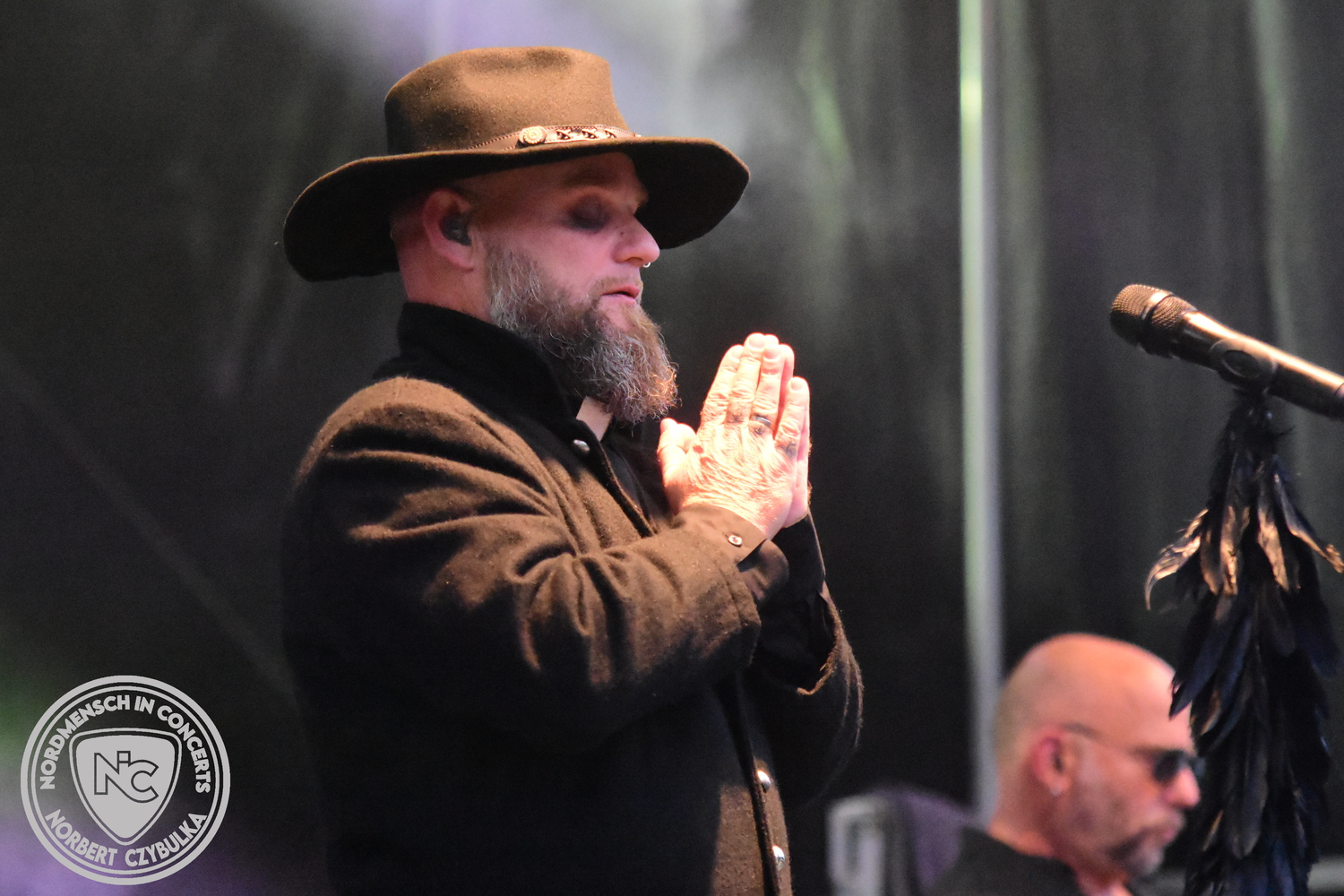Um 20:30 Uhr dann das Highlicht dieses Festival-Wochenendes. Mono Inc. beendeten gerade erst ihre Symphonic-Tour und mussten wenige Wochen vor der Festival-Tour den Ausstieg von Bassmann Val Perun verkraften. Mit wem kommen die Monos nun auf Tour? Ein fester neuer Bassist oder eine Aushilfe? Beim Soundcheck dann die Auflösung. Als (erstmal) Aushilfe steht Ilja John Lappin von der Artcore/Progressive-Band The Hirsch Effekt auf der Bühne. Mit einem lauten Knall beginnt die Show. Die Monos sind die einzige Band, die wie bei Arabia oder After The War Feuersäulen auf die Bühne bringen. Im Festival-Set auch zwei Cover. Mit „Sleeping My Day Away“ steht mein Lieblingssong der Kopenhagener Band D-A-D (Disneyland After Dark) sowie mit „After The War“ einer der größten Hits von Gary Moore auf dem Programm. In Martin Englers Acoustic-Solo-Teil verwurstet er „Mein Gott Walter“ von Mike Krüger, „Hallelujah“ von Leonard Cohen sowie „Passenger“ von Iggy Pop. Nach dem obligatorischen Drum-Battle dürfen die beiden Überhits „Voices Of Doom“ sowie „Children Of The Dark“ nicht fehlen. Sie beenden das Konzert und somit das Festival. Der Platz leert sich rasend schnell. Während der große Strom in Richtung Campground wandert, füllt sich auch der Club wieder.