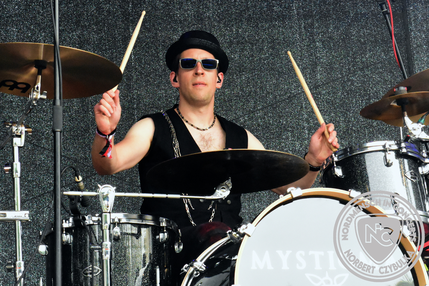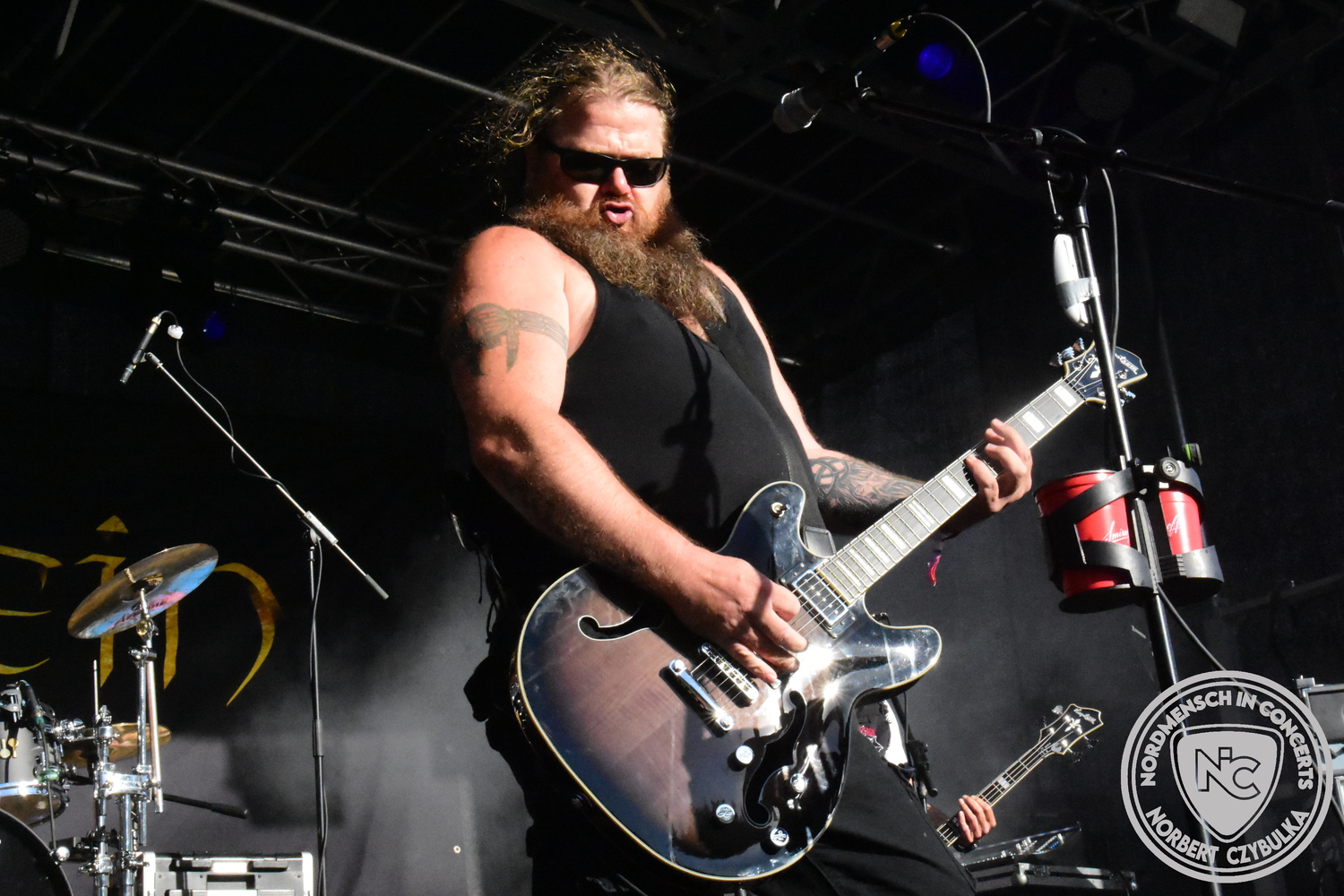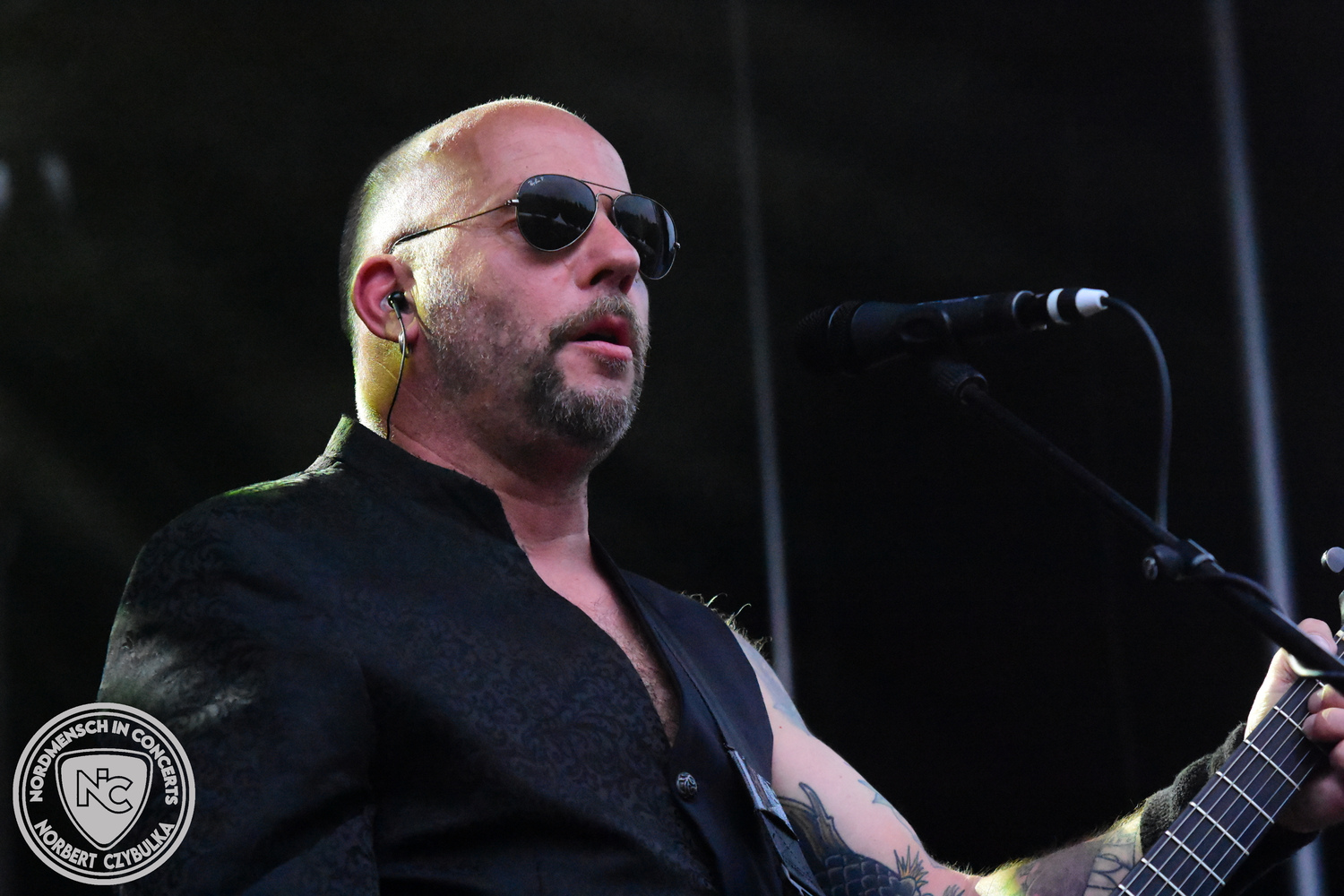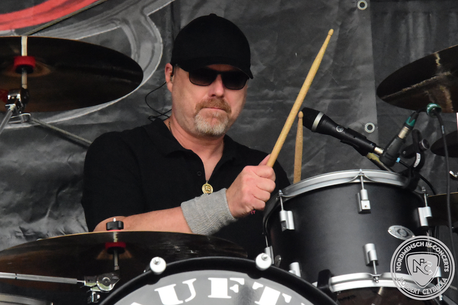 Um 20:30 Uhr dann das Highlicht dieses Festival-Wochenendes. Mono Inc. beendeten gerade erst ihre Symphonic-Tour und mussten wenige Wochen vor der Festival-Tour den Ausstieg von Bassmann Val Perun verkraften. Mit wem kommen die Monos nun auf Tour? Ein fester neuer Bassist oder eine Aushilfe? Beim Soundcheck dann die Auflösung. Als (erstmal) Aushilfe steht Ilja John Lappin von der Artcore/Progressive-Band The Hirsch Effekt auf der Bühne. Mit einem lauten Knall beginnt die Show. Die Monos sind die einzige Band, die wie bei Arabia oder After The War Feuersäulen auf die Bühne bringen. Im Festival-Set auch zwei Cover. Mit „Sleeping My Day Away“ steht mein Lieblingssong der Kopenhagener Band D-A-D (Disneyland After Dark) sowie mit „After The War“ einer der größten Hits von Gary Moore auf dem Programm. In Martin Englers Acoustic-Solo-Teil verwurstet er „Mein Gott Walter“ von Mike Krüger, „Hallelujah“ von Leonard Cohen sowie „Passenger“ von Iggy Pop. Nach dem obligatorischen Drum-Battle dürfen die beiden Überhits „Voices Of Doom“ sowie „Children Of The Dark“ nicht fehlen. Sie beenden das Konzert und somit das Festival. Der Platz leert sich rasend schnell. Während der große Strom in Richtung Campground wandert, füllt sich auch der Club wieder.