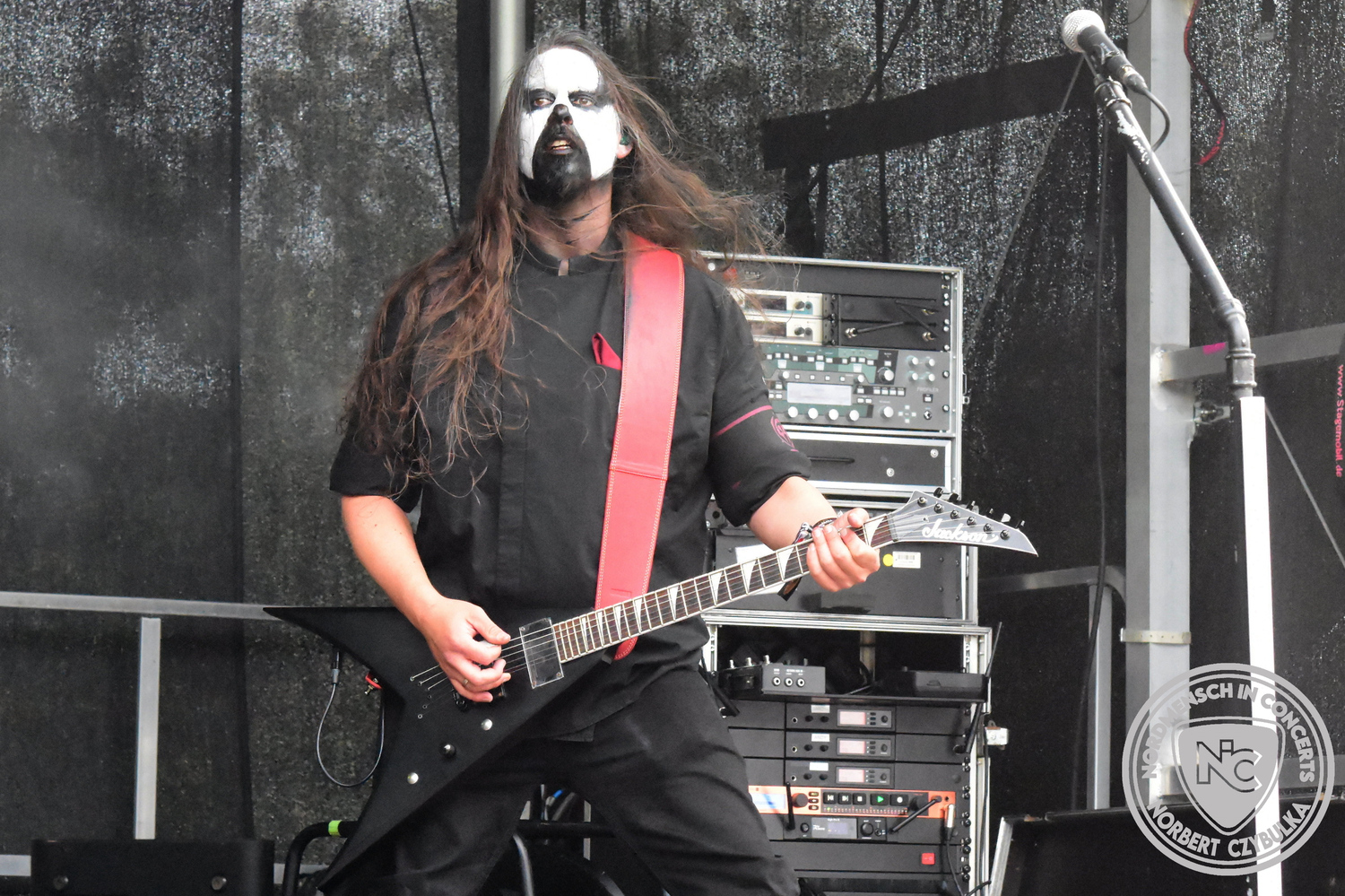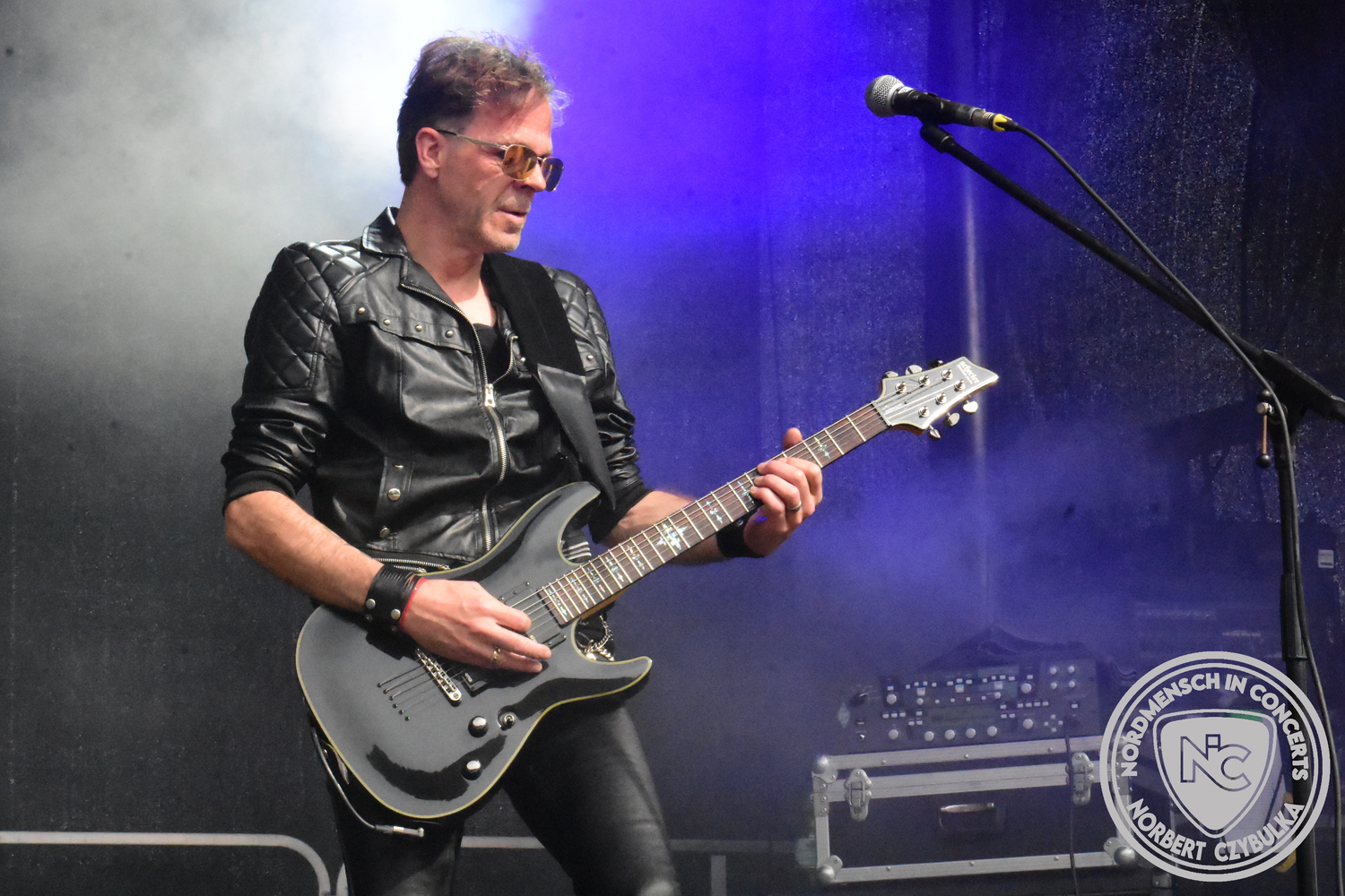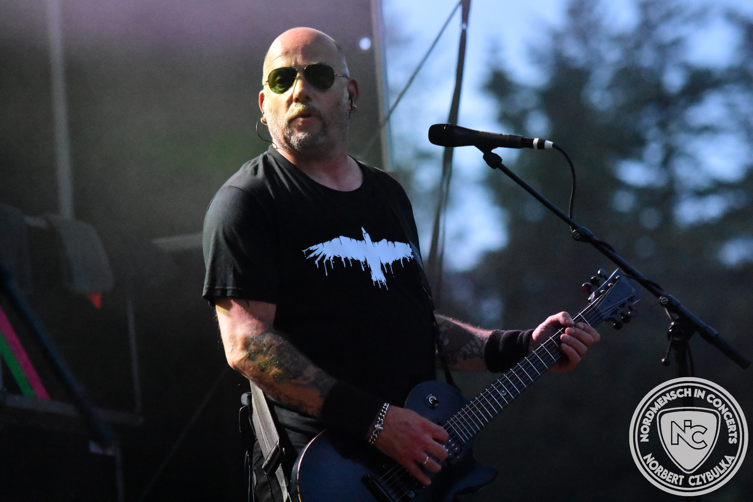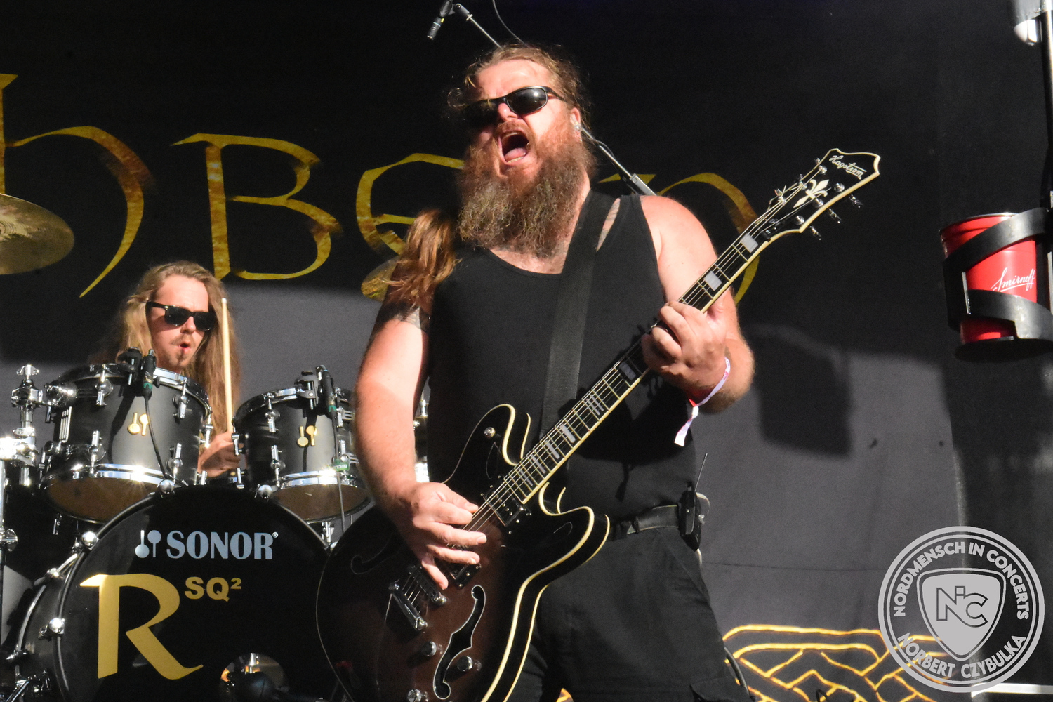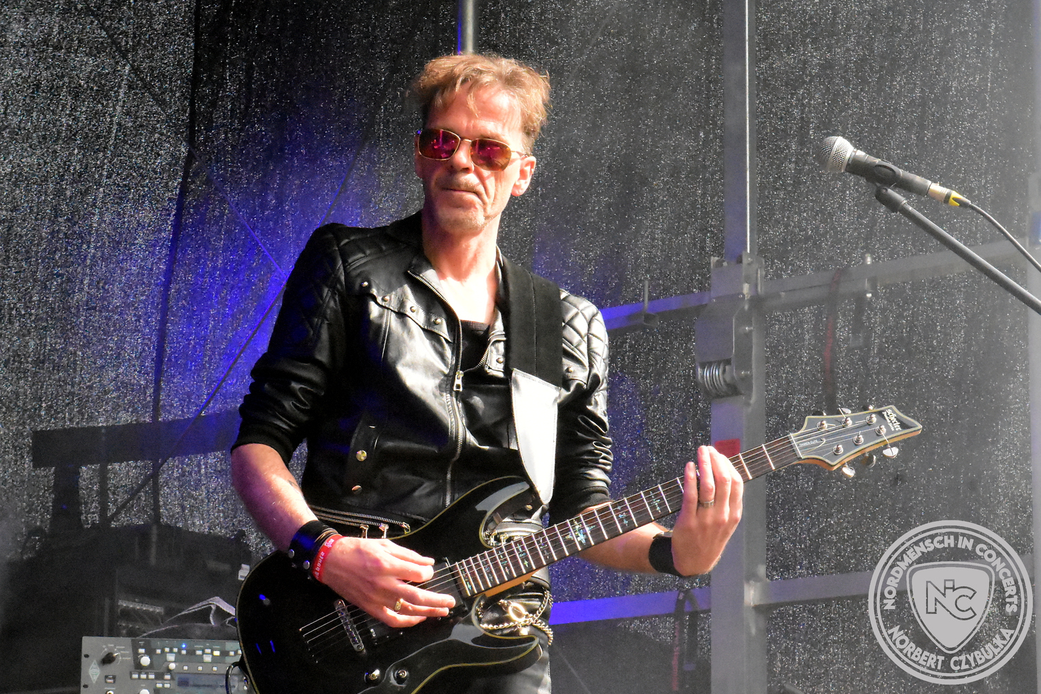 Um 20:30 Uhr dann das Highlicht dieses Festival-Wochenendes. Mono Inc. beendeten gerade erst ihre Symphonic-Tour und mussten wenige Wochen vor der Festival-Tour den Ausstieg von Bassmann Val Perun verkraften. Mit wem kommen die Monos nun auf Tour? Ein fester neuer Bassist oder eine Aushilfe? Beim Soundcheck dann die Auflösung. Als (erstmal) Aushilfe steht Ilja John Lappin von der Artcore/Progressive-Band The Hirsch Effekt auf der Bühne. Mit einem lauten Knall beginnt die Show. Die Monos sind die einzige Band, die wie bei Arabia oder After The War Feuersäulen auf die Bühne bringen. Im Festival-Set auch zwei Cover. Mit „Sleeping My Day Away“ steht mein Lieblingssong der Kopenhagener Band D-A-D (Disneyland After Dark) sowie mit „After The War“ einer der größten Hits von Gary Moore auf dem Programm. In Martin Englers Acoustic-Solo-Teil verwurstet er „Mein Gott Walter“ von Mike Krüger, „Hallelujah“ von Leonard Cohen sowie „Passenger“ von Iggy Pop. Nach dem obligatorischen Drum-Battle dürfen die beiden Überhits „Voices Of Doom“ sowie „Children Of The Dark“ nicht fehlen. Sie beenden das Konzert und somit das Festival. Der Platz leert sich rasend schnell. Während der große Strom in Richtung Campground wandert, füllt sich auch der Club wieder.