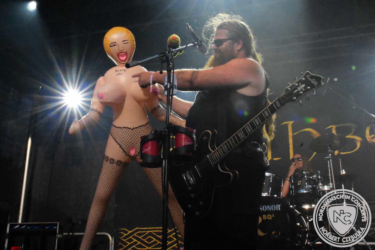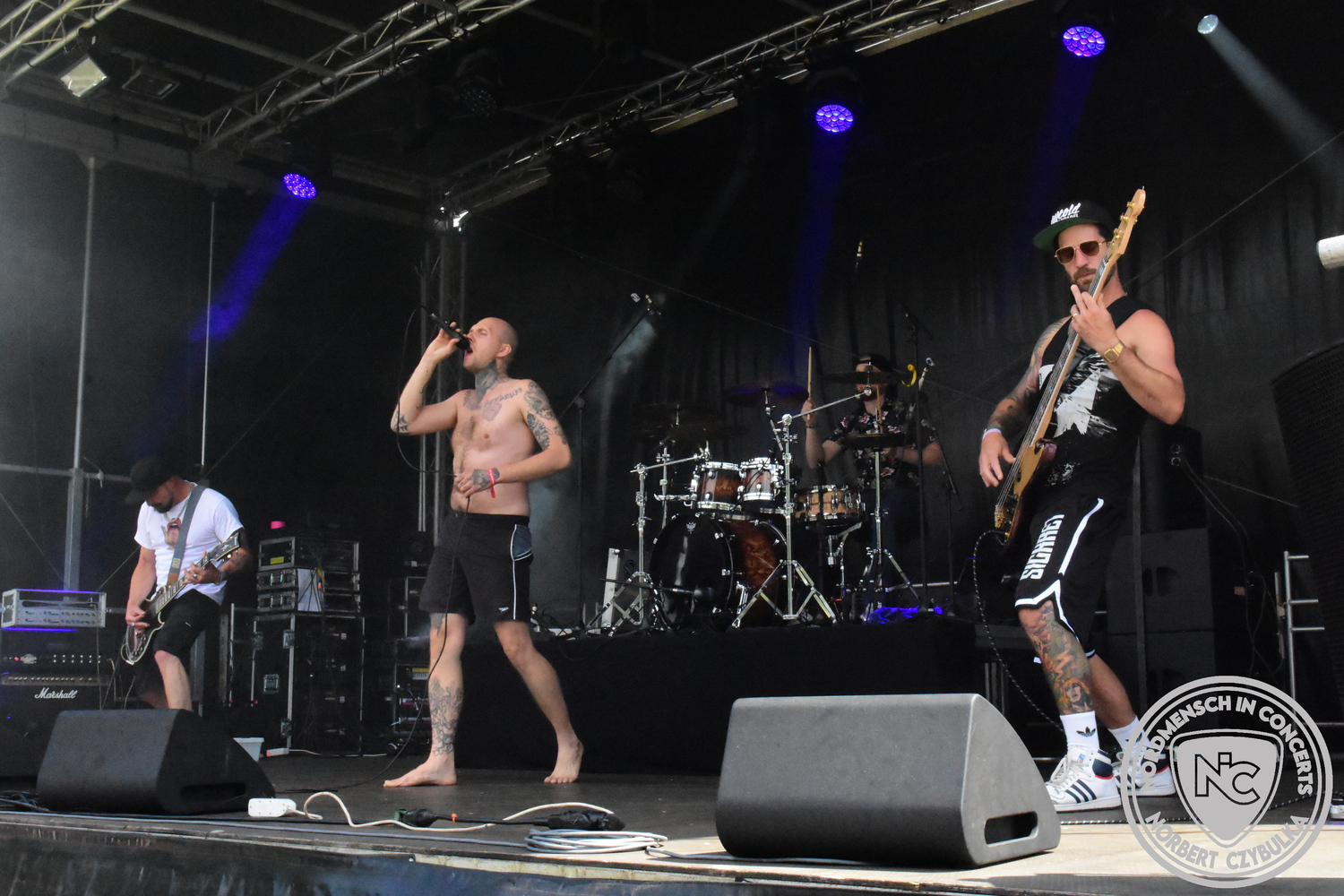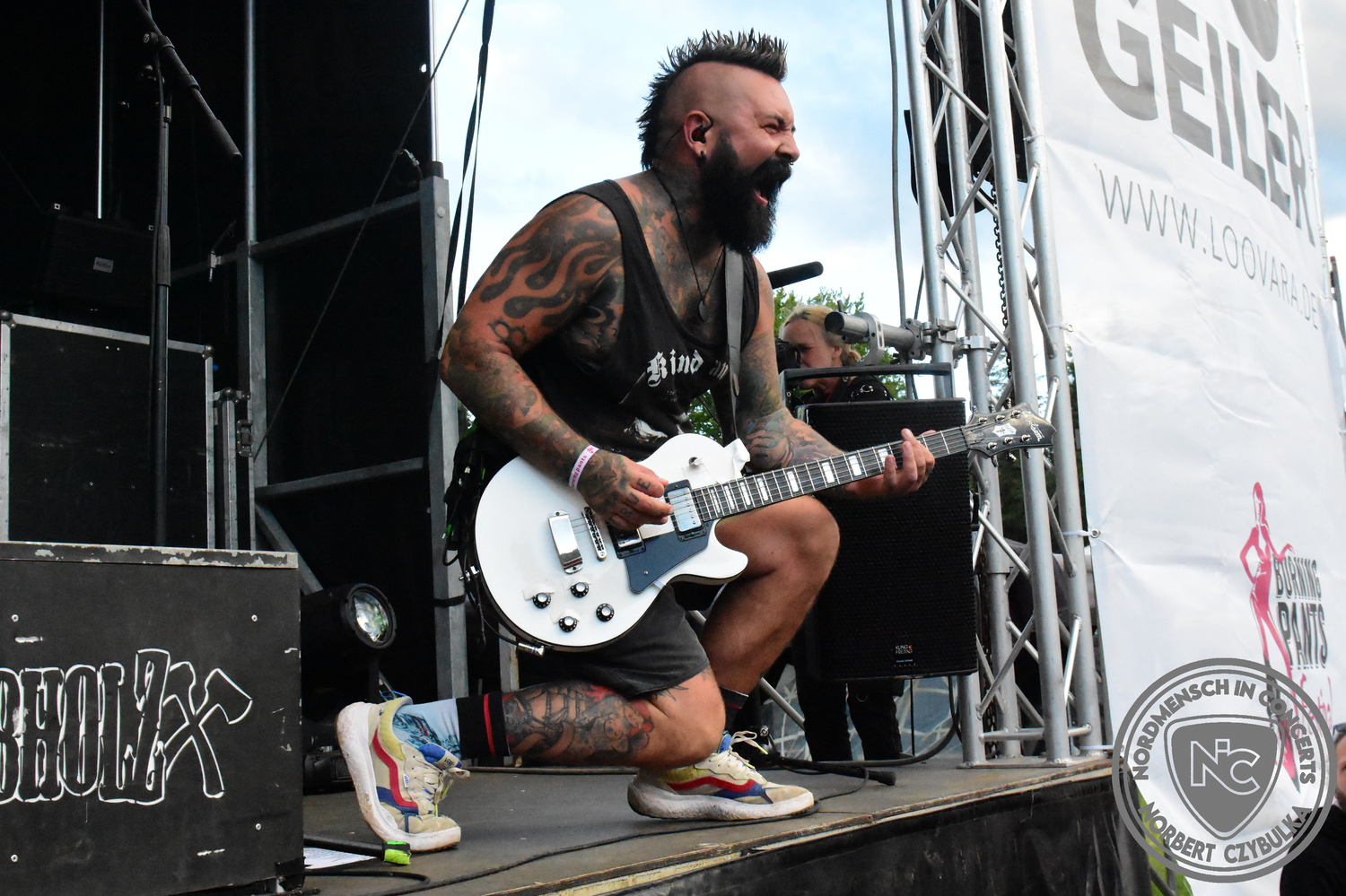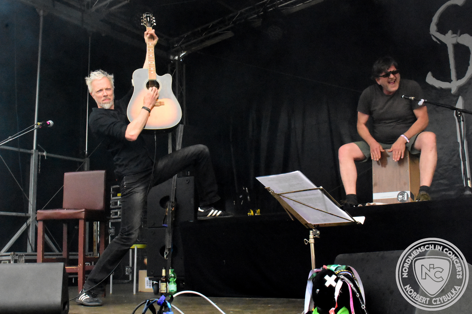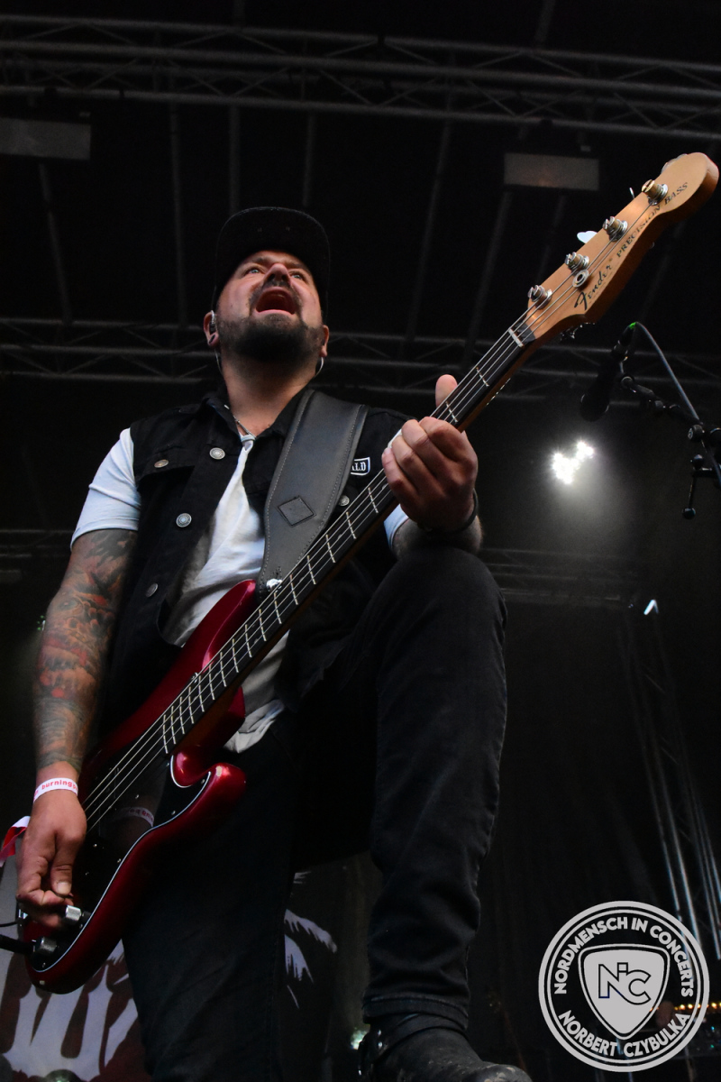 Dann wieder der krasse musikalische Gegensatz. Rauhbein ist eine deutsche Folk-Rock-Band um Sänger Henry M. Rauhbein aus Velmeden, Hessisch Lichtenau, Hessen.“ so sagt es Wikipedia. Auch sie waren schon einmal auf dem Burning Pants und sind in den Kreis der Familie aufgenommen worden. Nach einem Fauxpas bei einem Konzert in Worms und dem folgenden Social-Media Beitrag, kommt die Festival Chefin auf die Bühne und klärt auf. Niemals singen die Festival-Besucher weniger als bei anderen Konzerten mit und Unterwäsche kann man schließlich nicht auf die Bühne werfen. Man hätte ja gar keine an! Die Menge wirft daraufhin mit gehäkelten Figuren. Henry verspricht pro Utensil zwei Euro an das Kinderhospiz, welches das Festival unterstützt, zu spenden und muss biertrinkend an einem Stehtisch mit ansehen, wie das Publikum den letzten seiner Songs mehr als 16 Minuten zum Konzertende singt. Der Stagemanager nimmt die daraus entstehende Verzögerung gelassen hin, denn die nachfolgende Deutschrock-Band Kärbholz steht mit der Security auf dem Wellenbrecher und feuert die Menge an. Fünf Minuten bleiben den Deutschrockern aus Ruppichteroth an Pause und Soundcheck. Ruppichteroth liegt irgendwo mitten im Ruhrgebiet. Vor 20 Stunden noch im bayrischen Holledau auf der Bühne gestanden, rocken sie nun den Norden Niedersachsens. Adrian hat zum Beginn Probleme mit der Gurtaufhängung an seiner Gitarre, seine Crew ist jedoch fix und der Rest des Konzerts verläuft reibungslos.