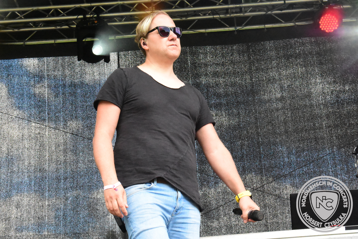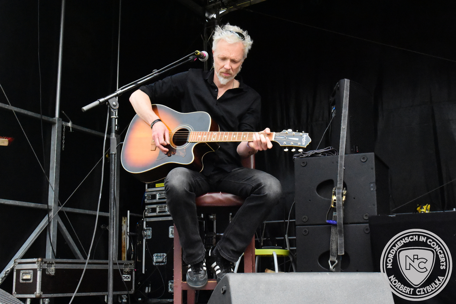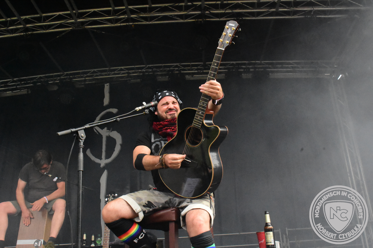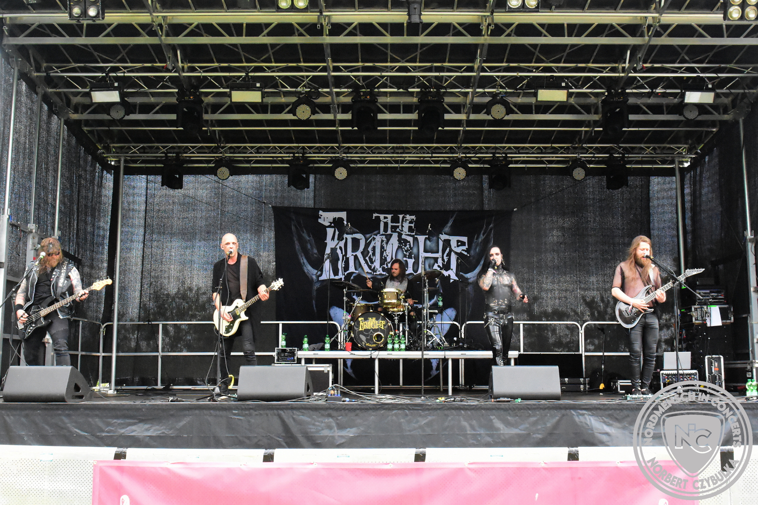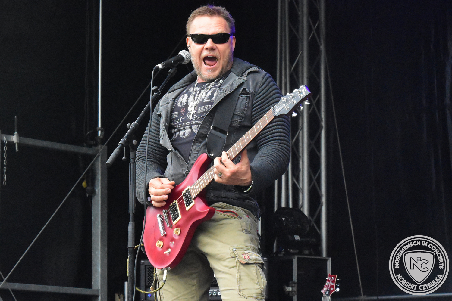 Dann wieder der krasse musikalische Gegensatz. Rauhbein ist eine deutsche Folk-Rock-Band um Sänger Henry M. Rauhbein aus Velmeden, Hessisch Lichtenau, Hessen.“ so sagt es Wikipedia. Auch sie waren schon einmal auf dem Burning Pants und sind in den Kreis der Familie aufgenommen worden. Nach einem Fauxpas bei einem Konzert in Worms und dem folgenden Social-Media Beitrag, kommt die Festival Chefin auf die Bühne und klärt auf. Niemals singen die Festival-Besucher weniger als bei anderen Konzerten mit und Unterwäsche kann man schließlich nicht auf die Bühne werfen. Man hätte ja gar keine an! Die Menge wirft daraufhin mit gehäkelten Figuren. Henry verspricht pro Utensil zwei Euro an das Kinderhospiz, welches das Festival unterstützt, zu spenden und muss biertrinkend an einem Stehtisch mit ansehen, wie das Publikum den letzten seiner Songs mehr als 16 Minuten zum Konzertende singt. Der Stagemanager nimmt die daraus entstehende Verzögerung gelassen hin, denn die nachfolgende Deutschrock-Band Kärbholz steht mit der Security auf dem Wellenbrecher und feuert die Menge an. Fünf Minuten bleiben den Deutschrockern aus Ruppichteroth an Pause und Soundcheck. Ruppichteroth liegt irgendwo mitten im Ruhrgebiet. Vor 20 Stunden noch im bayrischen Holledau auf der Bühne gestanden, rocken sie nun den Norden Niedersachsens. Adrian hat zum Beginn Probleme mit der Gurtaufhängung an seiner Gitarre, seine Crew ist jedoch fix und der Rest des Konzerts verläuft reibungslos.
