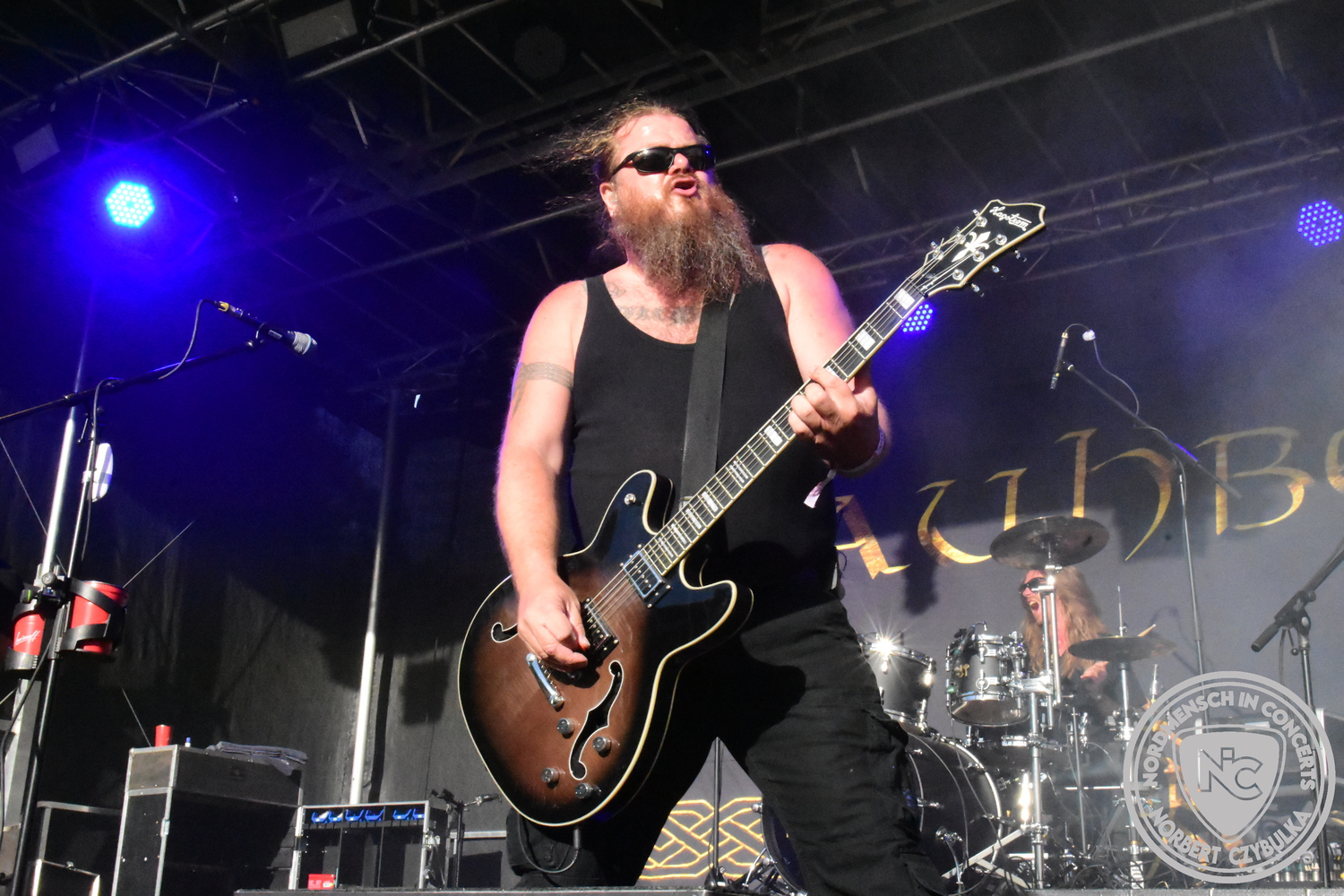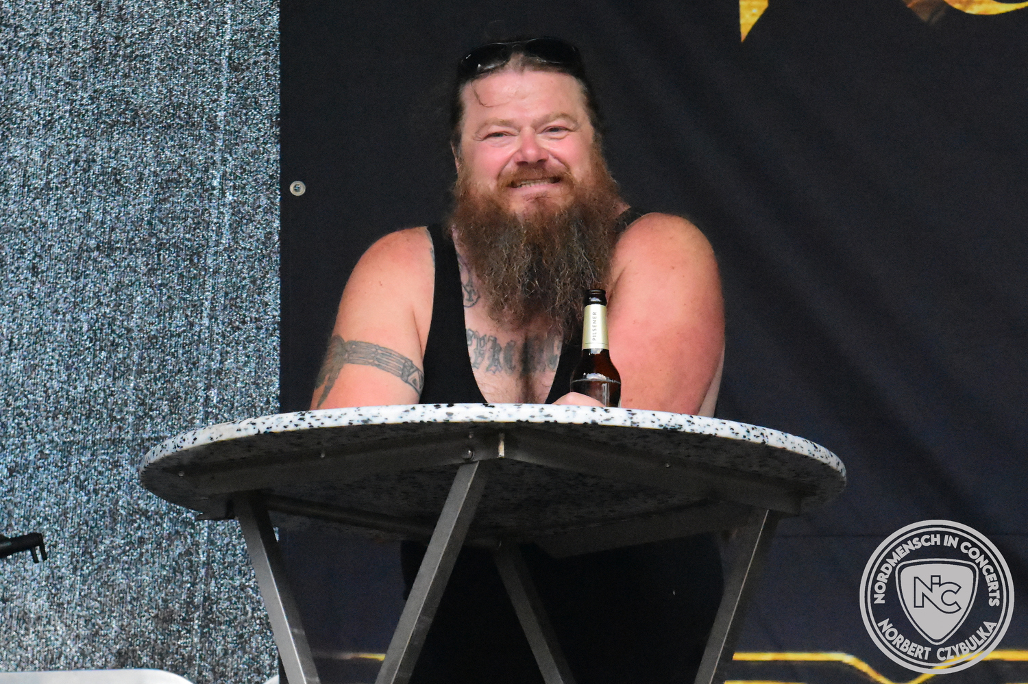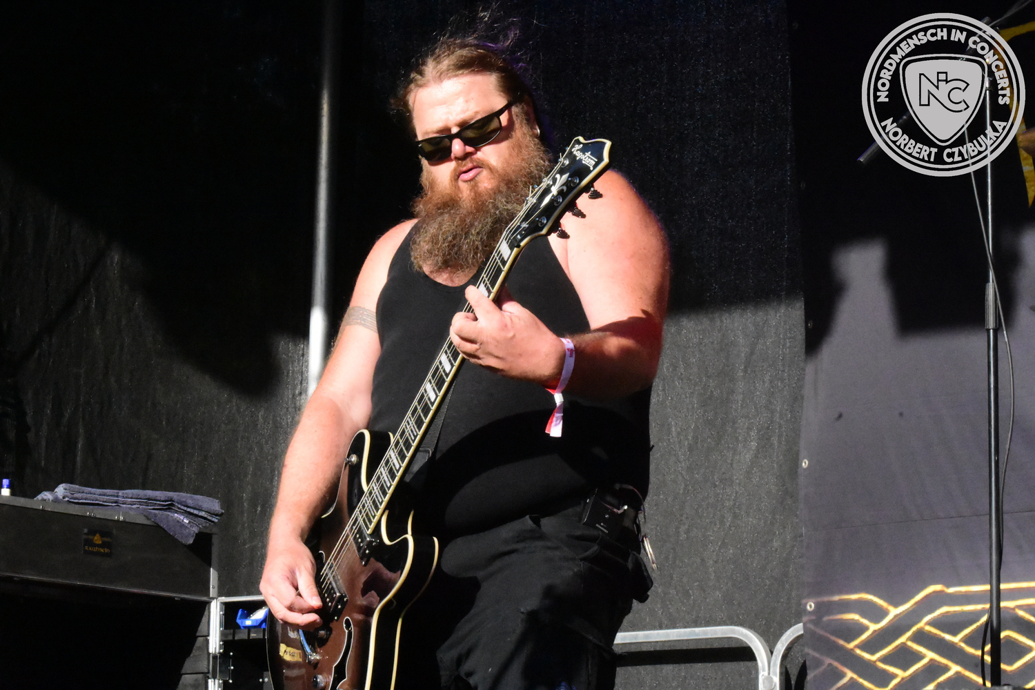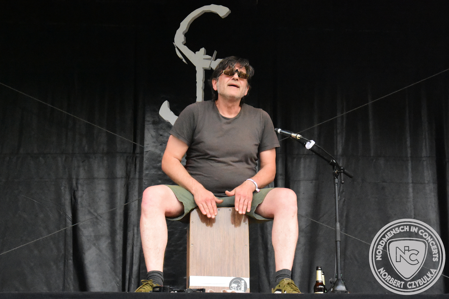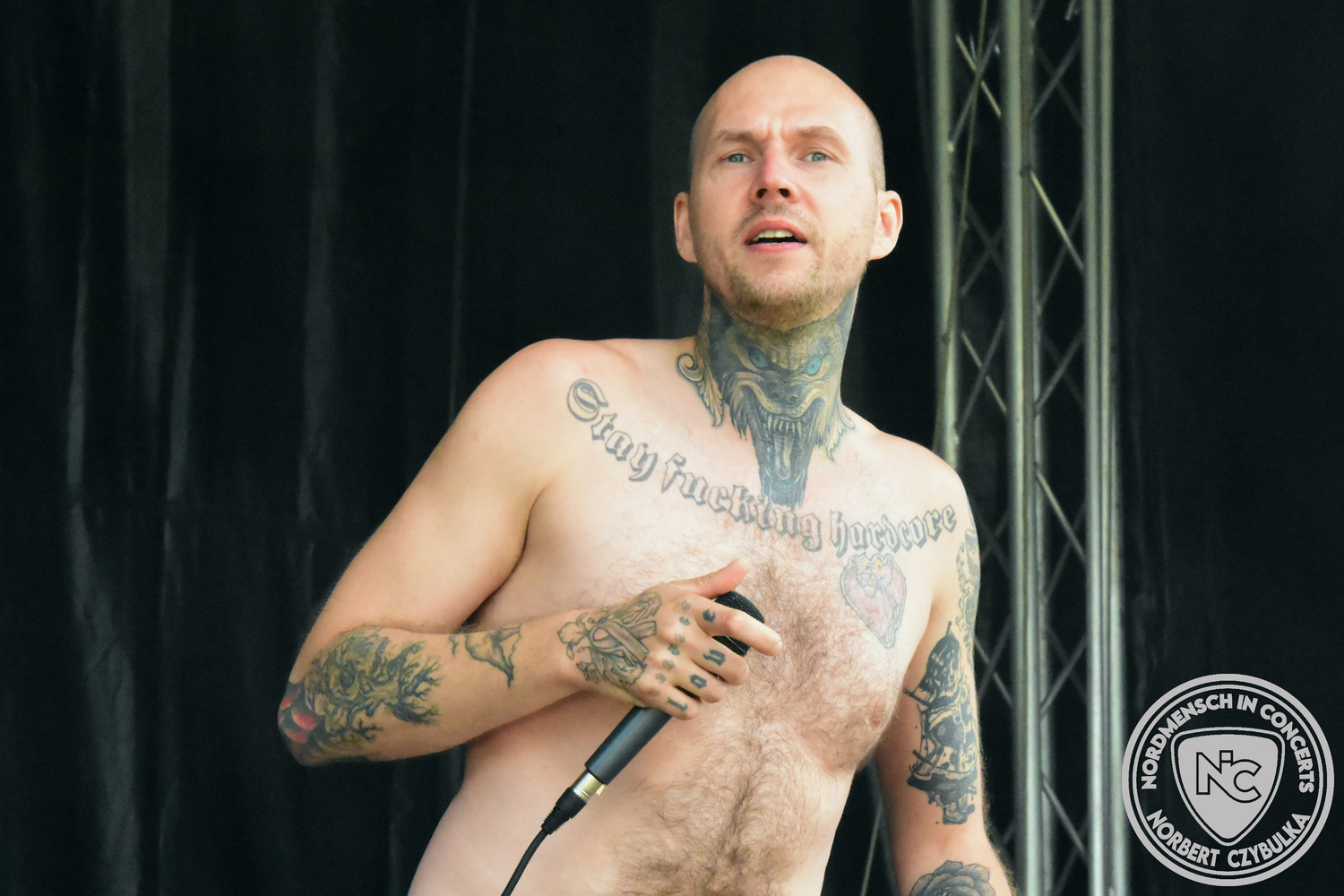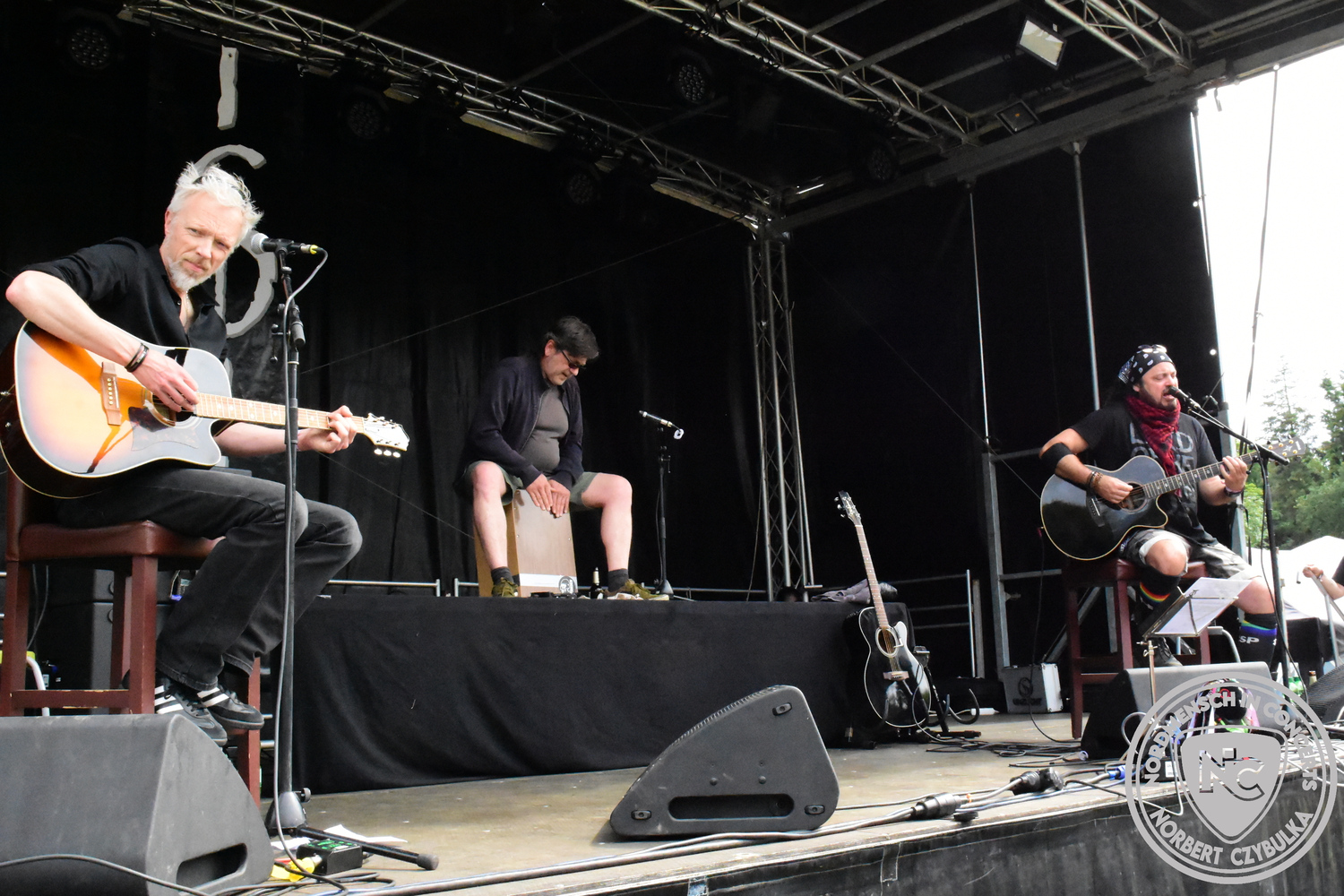Dann wieder der krasse musikalische Gegensatz. Rauhbein ist eine deutsche Folk-Rock-Band um Sänger Henry M. Rauhbein aus Velmeden, Hessisch Lichtenau, Hessen.“ so sagt es Wikipedia. Auch sie waren schon einmal auf dem Burning Pants und sind in den Kreis der Familie aufgenommen worden. Nach einem Fauxpas bei einem Konzert in Worms und dem folgenden Social-Media Beitrag, kommt die Festival Chefin auf die Bühne und klärt auf. Niemals singen die Festival-Besucher weniger als bei anderen Konzerten mit und Unterwäsche kann man schließlich nicht auf die Bühne werfen. Man hätte ja gar keine an! Die Menge wirft daraufhin mit gehäkelten Figuren. Henry verspricht pro Utensil zwei Euro an das Kinderhospiz, welches das Festival unterstützt, zu spenden und muss biertrinkend an einem Stehtisch mit ansehen, wie das Publikum den letzten seiner Songs mehr als 16 Minuten zum Konzertende singt. Der Stagemanager nimmt die daraus entstehende Verzögerung gelassen hin, denn die nachfolgende Deutschrock-Band Kärbholz steht mit der Security auf dem Wellenbrecher und feuert die Menge an. Fünf Minuten bleiben den Deutschrockern aus Ruppichteroth an Pause und Soundcheck. Ruppichteroth liegt irgendwo mitten im Ruhrgebiet. Vor 20 Stunden noch im bayrischen Holledau auf der Bühne gestanden, rocken sie nun den Norden Niedersachsens. Adrian hat zum Beginn Probleme mit der Gurtaufhängung an seiner Gitarre, seine Crew ist jedoch fix und der Rest des Konzerts verläuft reibungslos.