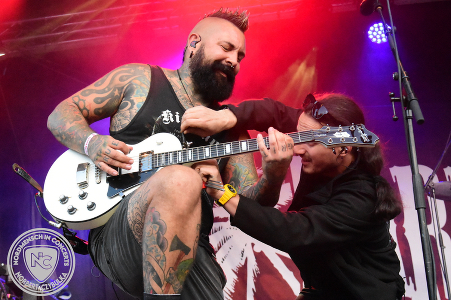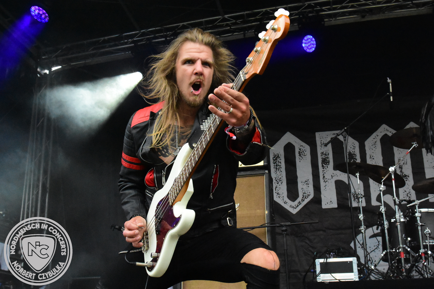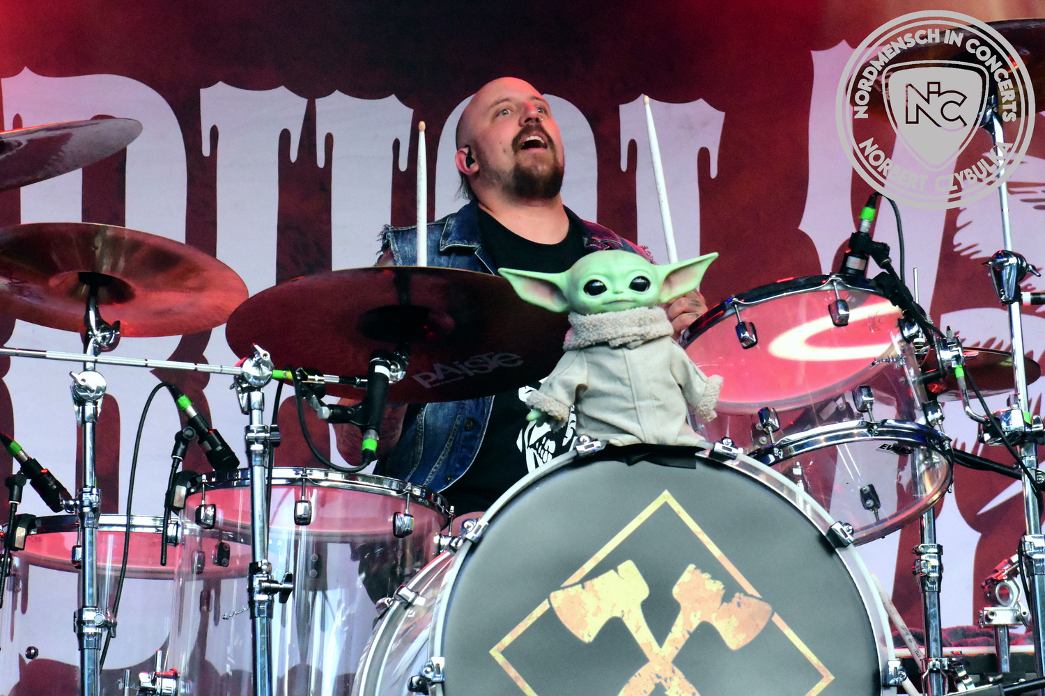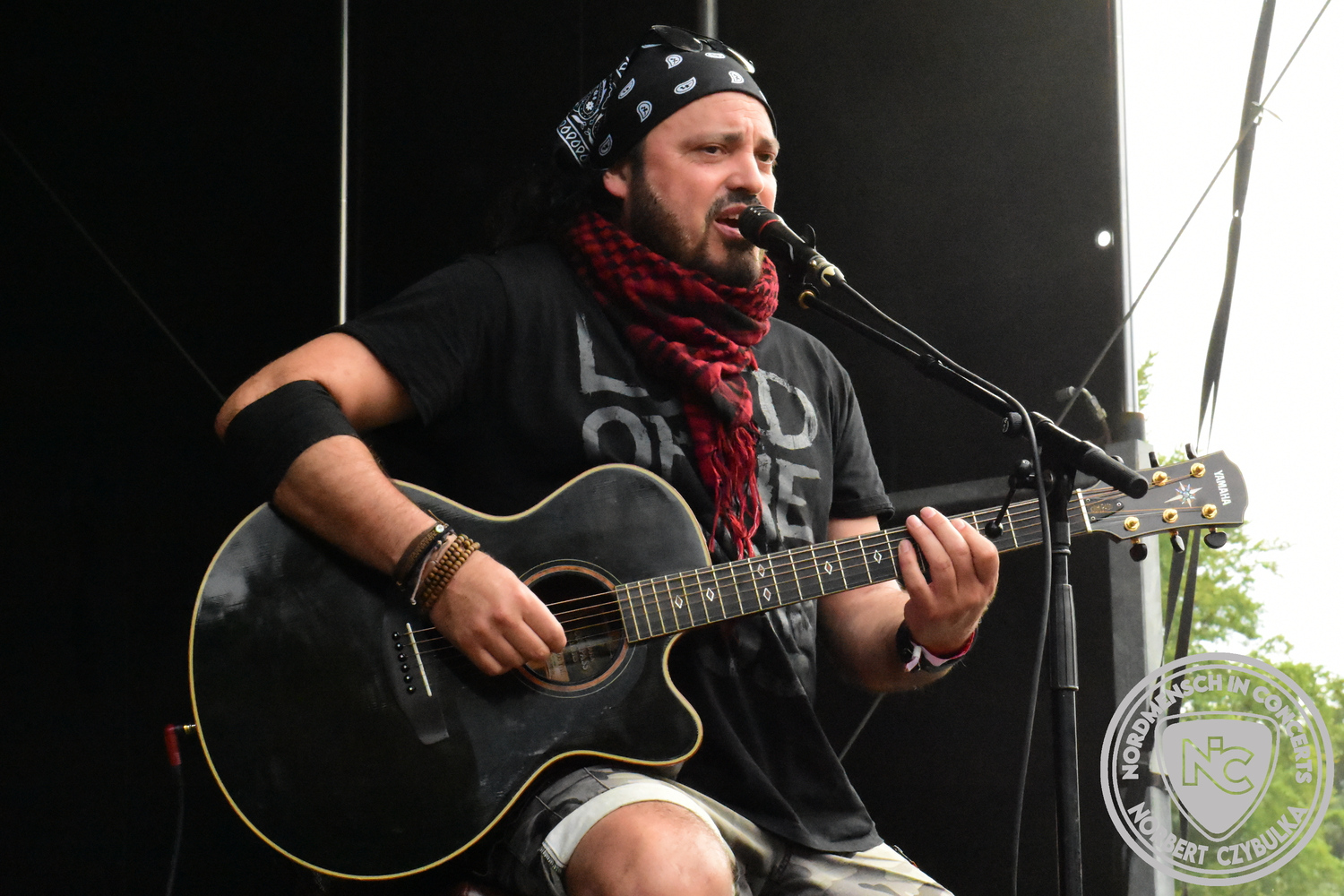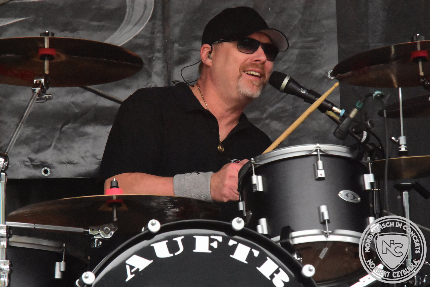 Dann wieder der krasse musikalische Gegensatz. Rauhbein ist eine deutsche Folk-Rock-Band um Sänger Henry M. Rauhbein aus Velmeden, Hessisch Lichtenau, Hessen.“ so sagt es Wikipedia. Auch sie waren schon einmal auf dem Burning Pants und sind in den Kreis der Familie aufgenommen worden. Nach einem Fauxpas bei einem Konzert in Worms und dem folgenden Social-Media Beitrag, kommt die Festival Chefin auf die Bühne und klärt auf. Niemals singen die Festival-Besucher weniger als bei anderen Konzerten mit und Unterwäsche kann man schließlich nicht auf die Bühne werfen. Man hätte ja gar keine an! Die Menge wirft daraufhin mit gehäkelten Figuren. Henry verspricht pro Utensil zwei Euro an das Kinderhospiz, welches das Festival unterstützt, zu spenden und muss biertrinkend an einem Stehtisch mit ansehen, wie das Publikum den letzten seiner Songs mehr als 16 Minuten zum Konzertende singt. Der Stagemanager nimmt die daraus entstehende Verzögerung gelassen hin, denn die nachfolgende Deutschrock-Band Kärbholz steht mit der Security auf dem Wellenbrecher und feuert die Menge an. Fünf Minuten bleiben den Deutschrockern aus Ruppichteroth an Pause und Soundcheck. Ruppichteroth liegt irgendwo mitten im Ruhrgebiet. Vor 20 Stunden noch im bayrischen Holledau auf der Bühne gestanden, rocken sie nun den Norden Niedersachsens. Adrian hat zum Beginn Probleme mit der Gurtaufhängung an seiner Gitarre, seine Crew ist jedoch fix und der Rest des Konzerts verläuft reibungslos.
