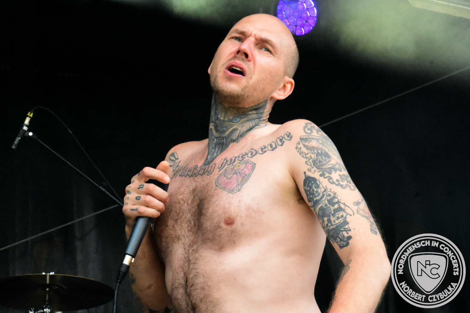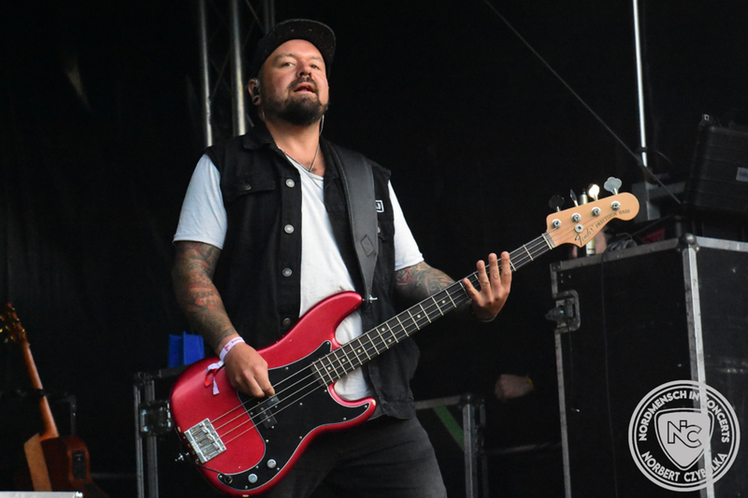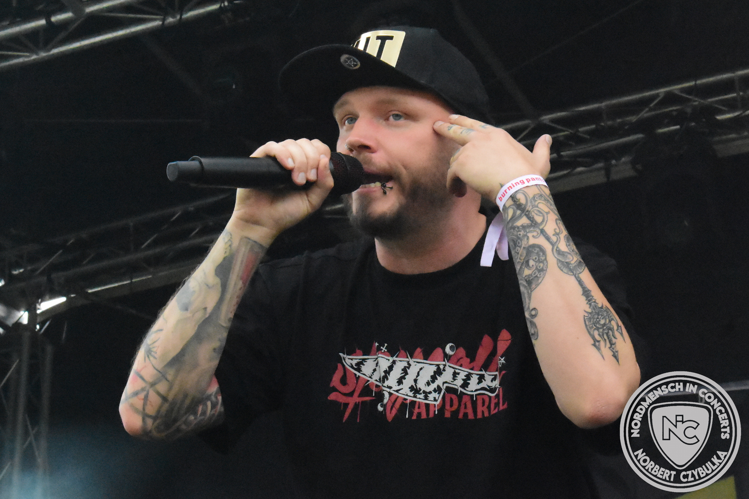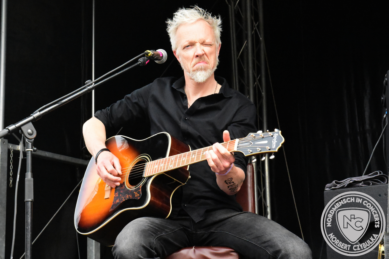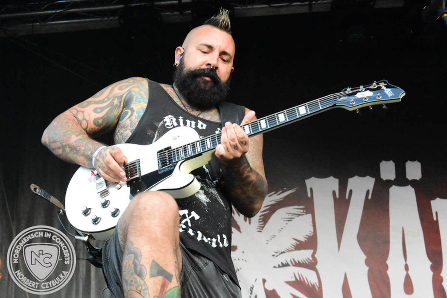 Dann wieder der krasse musikalische Gegensatz. Rauhbein ist eine deutsche Folk-Rock-Band um Sänger Henry M. Rauhbein aus Velmeden, Hessisch Lichtenau, Hessen.“ so sagt es Wikipedia. Auch sie waren schon einmal auf dem Burning Pants und sind in den Kreis der Familie aufgenommen worden. Nach einem Fauxpas bei einem Konzert in Worms und dem folgenden Social-Media Beitrag, kommt die Festival Chefin auf die Bühne und klärt auf. Niemals singen die Festival-Besucher weniger als bei anderen Konzerten mit und Unterwäsche kann man schließlich nicht auf die Bühne werfen. Man hätte ja gar keine an! Die Menge wirft daraufhin mit gehäkelten Figuren. Henry verspricht pro Utensil zwei Euro an das Kinderhospiz, welches das Festival unterstützt, zu spenden und muss biertrinkend an einem Stehtisch mit ansehen, wie das Publikum den letzten seiner Songs mehr als 16 Minuten zum Konzertende singt. Der Stagemanager nimmt die daraus entstehende Verzögerung gelassen hin, denn die nachfolgende Deutschrock-Band Kärbholz steht mit der Security auf dem Wellenbrecher und feuert die Menge an. Fünf Minuten bleiben den Deutschrockern aus Ruppichteroth an Pause und Soundcheck. Ruppichteroth liegt irgendwo mitten im Ruhrgebiet. Vor 20 Stunden noch im bayrischen Holledau auf der Bühne gestanden, rocken sie nun den Norden Niedersachsens. Adrian hat zum Beginn Probleme mit der Gurtaufhängung an seiner Gitarre, seine Crew ist jedoch fix und der Rest des Konzerts verläuft reibungslos.