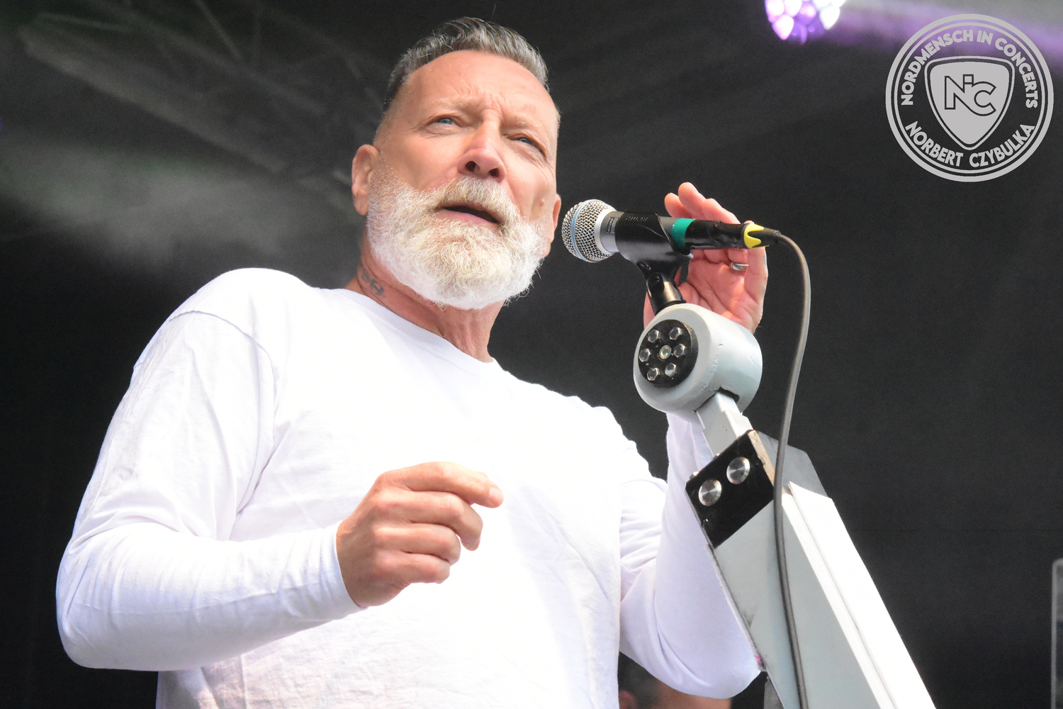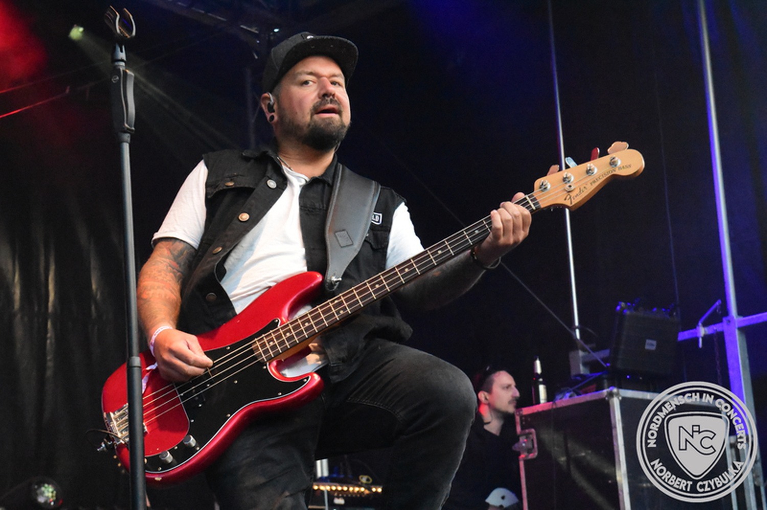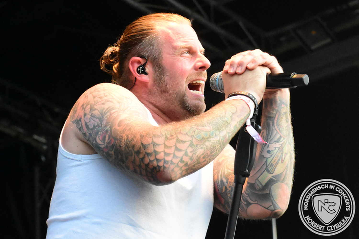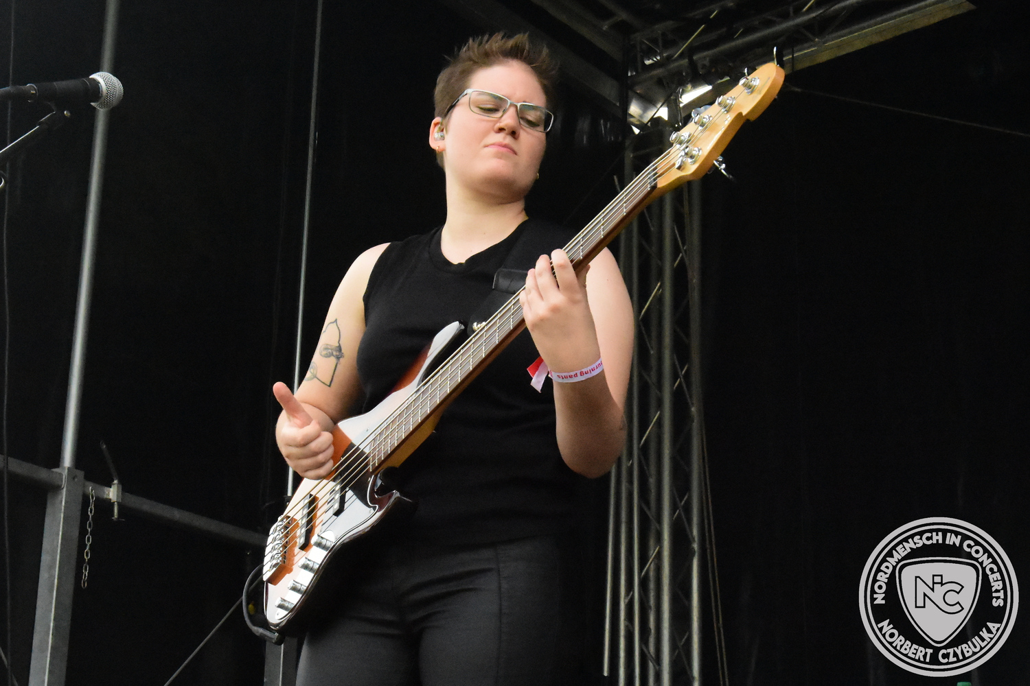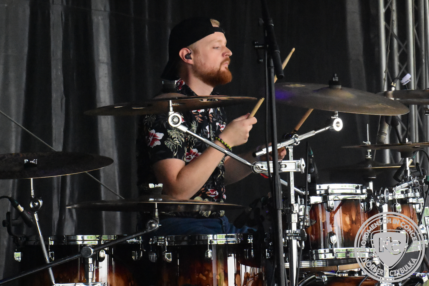 Dann wieder der krasse musikalische Gegensatz. Rauhbein ist eine deutsche Folk-Rock-Band um Sänger Henry M. Rauhbein aus Velmeden, Hessisch Lichtenau, Hessen.“ so sagt es Wikipedia. Auch sie waren schon einmal auf dem Burning Pants und sind in den Kreis der Familie aufgenommen worden. Nach einem Fauxpas bei einem Konzert in Worms und dem folgenden Social-Media Beitrag, kommt die Festival Chefin auf die Bühne und klärt auf. Niemals singen die Festival-Besucher weniger als bei anderen Konzerten mit und Unterwäsche kann man schließlich nicht auf die Bühne werfen. Man hätte ja gar keine an! Die Menge wirft daraufhin mit gehäkelten Figuren. Henry verspricht pro Utensil zwei Euro an das Kinderhospiz, welches das Festival unterstützt, zu spenden und muss biertrinkend an einem Stehtisch mit ansehen, wie das Publikum den letzten seiner Songs mehr als 16 Minuten zum Konzertende singt. Der Stagemanager nimmt die daraus entstehende Verzögerung gelassen hin, denn die nachfolgende Deutschrock-Band Kärbholz steht mit der Security auf dem Wellenbrecher und feuert die Menge an. Fünf Minuten bleiben den Deutschrockern aus Ruppichteroth an Pause und Soundcheck. Ruppichteroth liegt irgendwo mitten im Ruhrgebiet. Vor 20 Stunden noch im bayrischen Holledau auf der Bühne gestanden, rocken sie nun den Norden Niedersachsens. Adrian hat zum Beginn Probleme mit der Gurtaufhängung an seiner Gitarre, seine Crew ist jedoch fix und der Rest des Konzerts verläuft reibungslos.