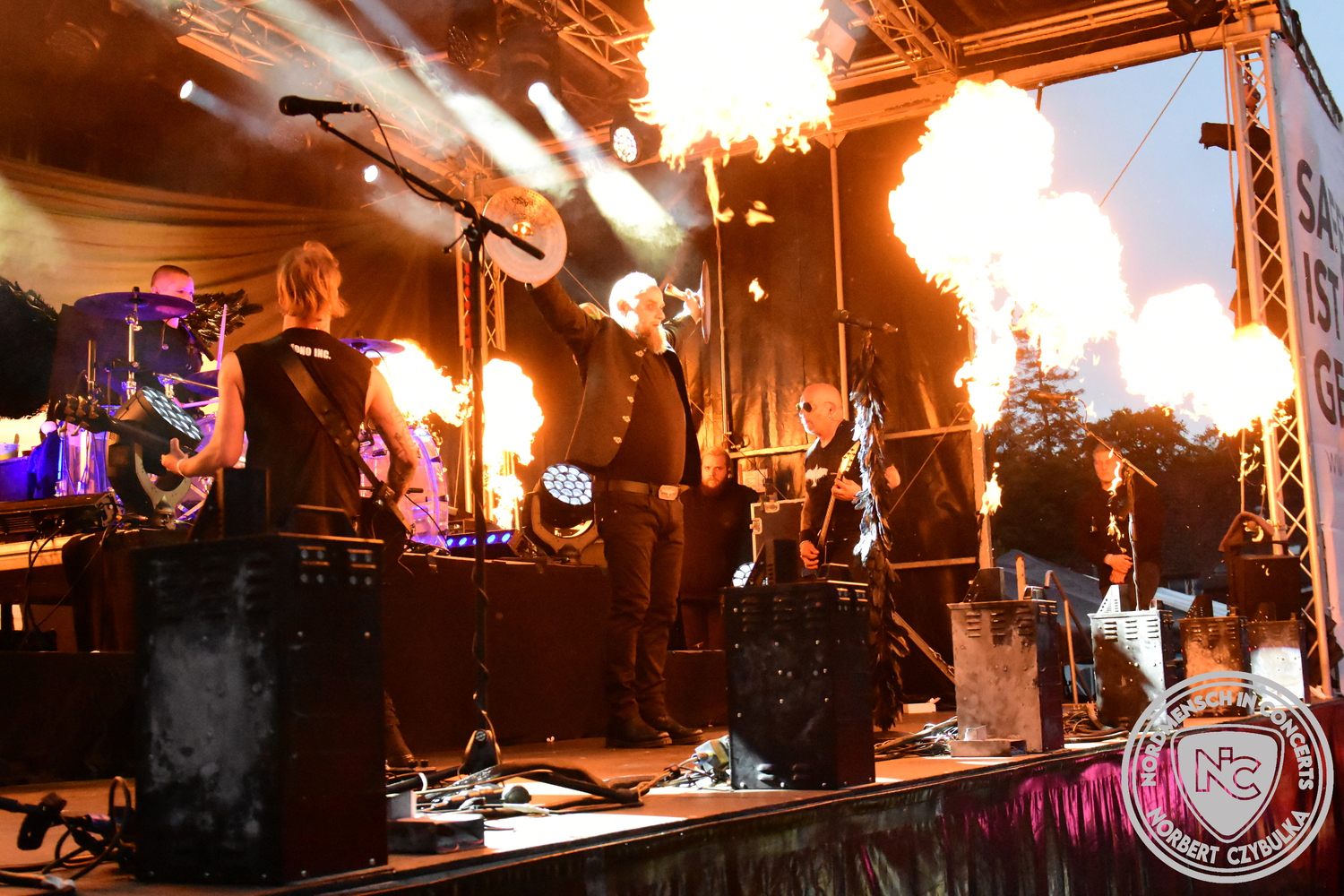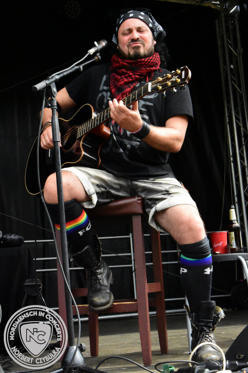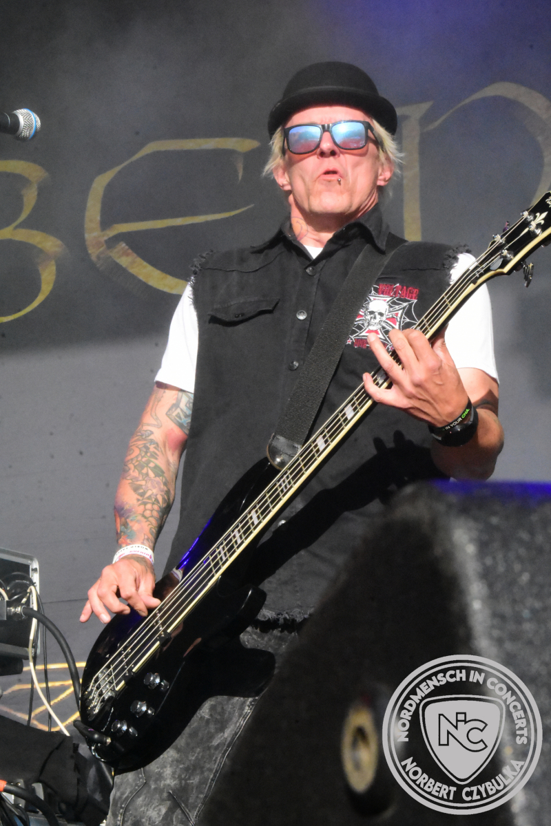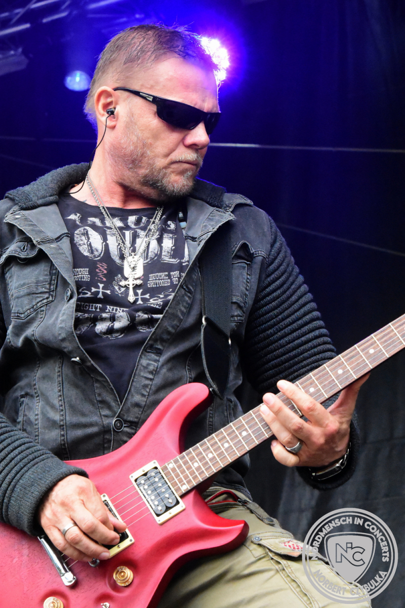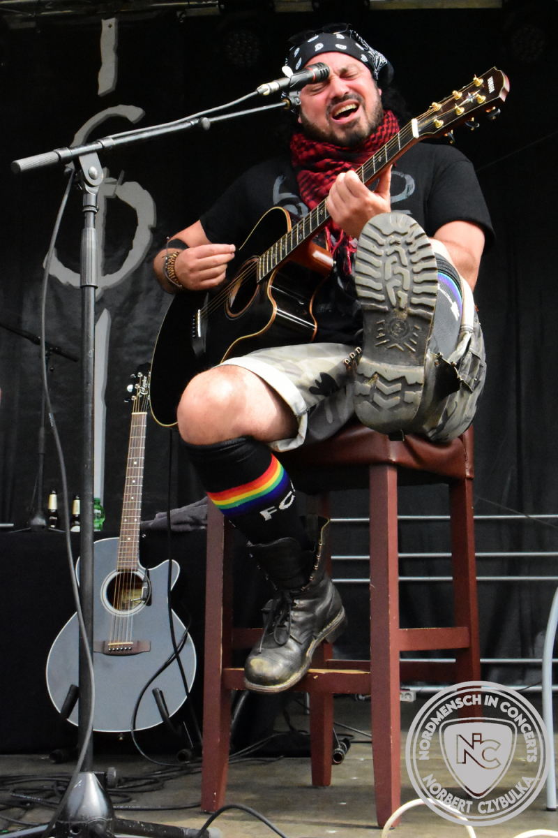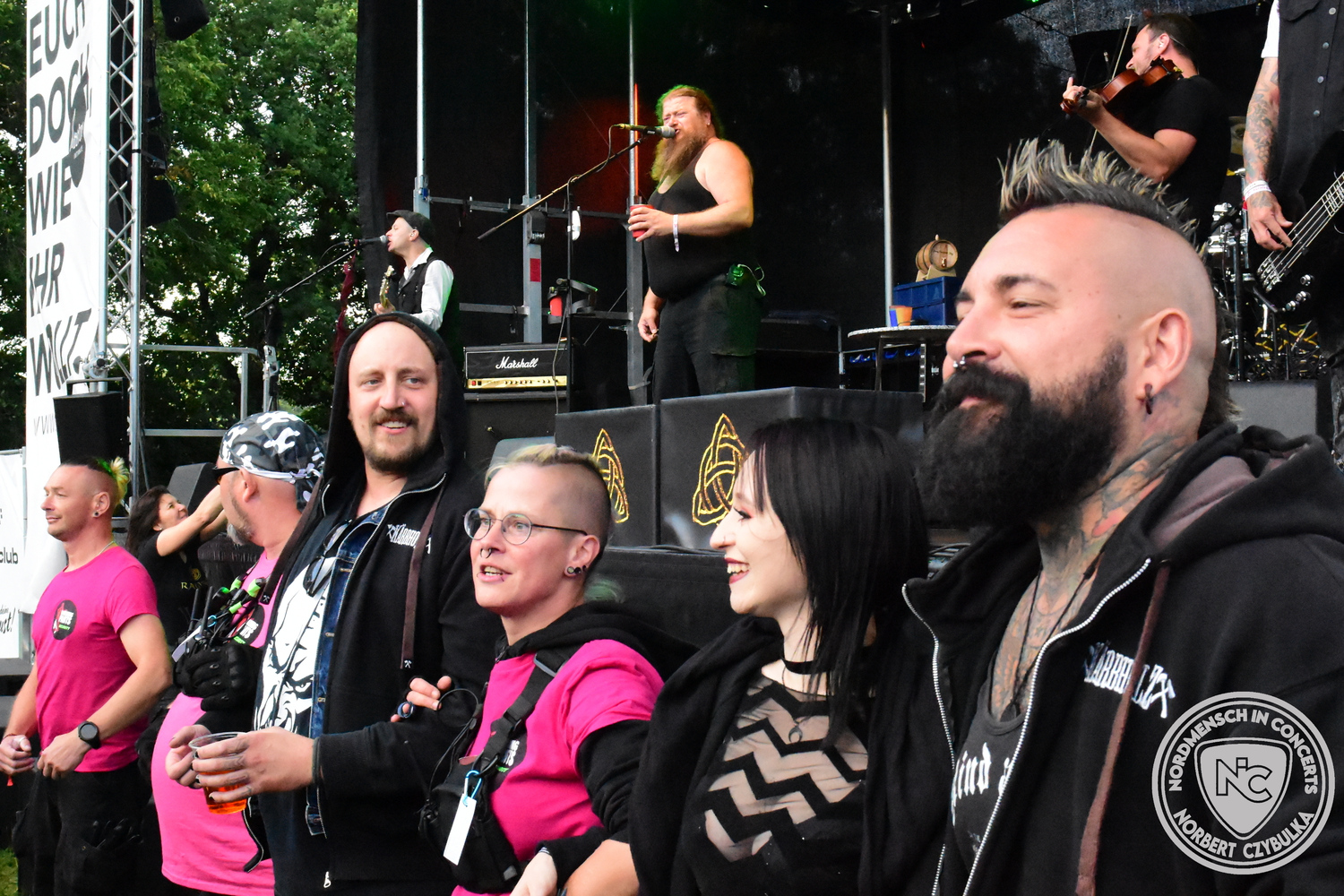 Um 15 Uhr beginnt der Slot von Egomey, einer Darkrockband aus Karlsruhe. Wurde ihr Auftritt im letzten Jahr noch durch heftigen Regen begleitet, bleibt es in diesem Jahr trocken. Es wird langsam voller vor den Bühnen. MegaBosch ist eine deutschsprachige Endzeit-Rock-Band aus dem Raum Hannover und nicht zum ersten Male hier auf dem familiären Festival. Man kennt sich und man schätzt sich. Die Band passt gut zu der kleinen Wasteland-Warriors-Abordnung, die sich ein kleines Areal zurecht gemacht haben. Besondere Aufmerksamkeit erregen die Jungs, als sie als erste Band tatsächlich eine Unterhose auf der Bühne verbrennen. Um 17 Uhr ist dann mein Campingplatz-Nachbar dran. Sündenklang ist ein Nebenprojekt von Martin Soer, dem Sänger der Band Stahlmann. Seine Mitstreiter sind AblaZ (Nachtblut) am Bass sowie Niklas Kahl (Stahlmann/Erdling/Lord Of The Lost) am Schlagzeug. Auch Mart ist bisher auf allen Burning Pants Festivals präsent gewesen und gehört hier irgendwie zur Familie. So ist der Platz denn auch gut gefüllt. Stilistisch mag ich sie nicht einordnen, denn irgendwo zwischen Elektro-Pop und Heavy Metal liegt die Wahrheit. Bei der Show dürfen natürlich auch drei Stahlmann-Songs nicht fehlen. Der reine Elektro-Pop folgt dann danach. Eisfabrik aus Hamburg haben jedoch ihre Fangemeinde. Hier wird das Tanzbein ausgiebig geschwungen. Schaumkanonen sorgen für Stimmung direkt vor der Bühne. Es folgt die Neue Deutsche Härte-Band Schattenmann aus Nürnberg. Als Co-Headliner des Tages haben sie eine Spielzeit von 60 Minuten und bieten den krassen Gegensatz zu ihren Vorgängern. Gitarrist Jan Suk sitzt nach einer Knie Operation auf einem Hocker, lässt sich nicht vertreten. Die Anreise muss beschwerlich gewesen sein. Ich wollte mich noch schlau machen, ob die beiden Bands zusammen gefahren sind, denn auch dArtagnan, eine deutsche Folk-Rock-Band, kommt aus Nürnberg. Und somit folgt die nächste musikalische Wendung. Egal wie man zu derartiger Musik steht, die Bayern verstehen ihren Job und bringen richtig Stimmung in die Menge und die 90 Minuten verfliegen. Für die Nachtschwärmer mit dem richtigen Einlassbändchen startet nun die Party im Club bis zum Morgengrauen.