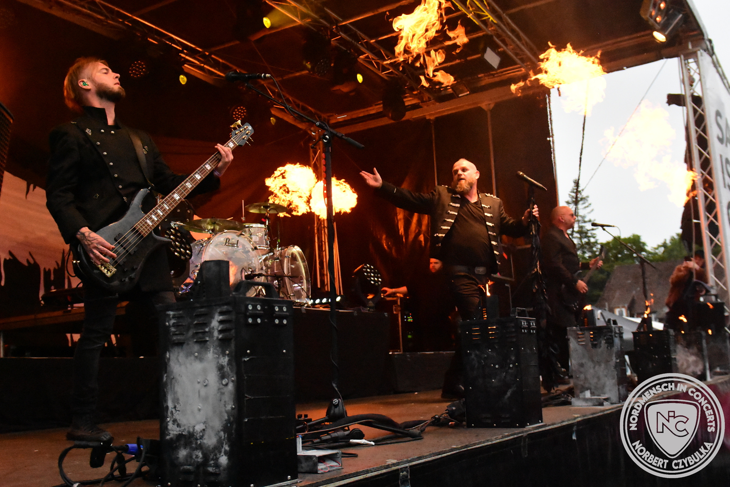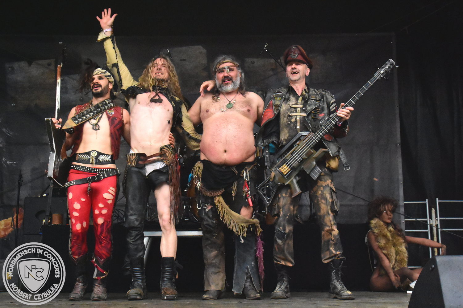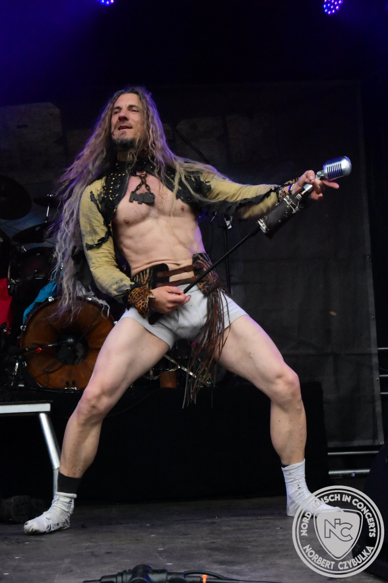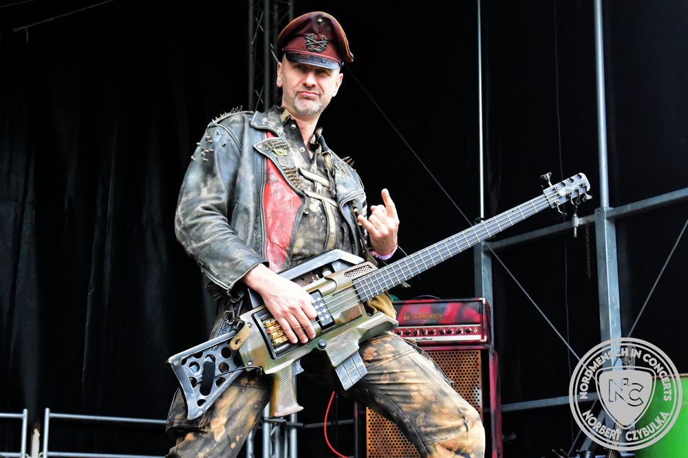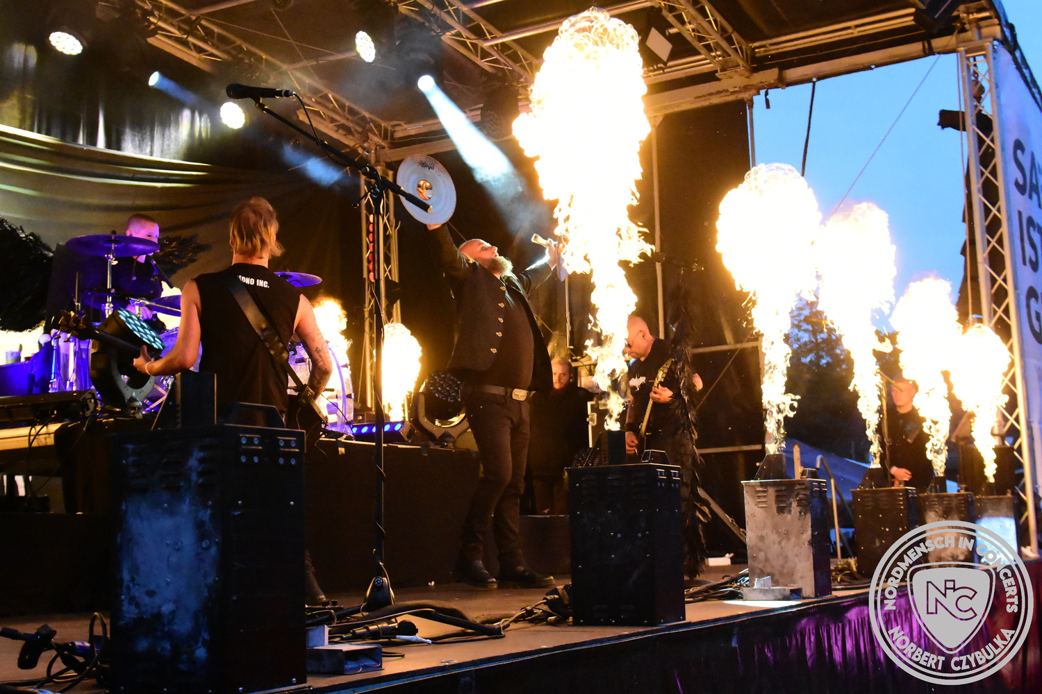 Um 15 Uhr beginnt der Slot von Egomey, einer Darkrockband aus Karlsruhe. Wurde ihr Auftritt im letzten Jahr noch durch heftigen Regen begleitet, bleibt es in diesem Jahr trocken. Es wird langsam voller vor den Bühnen. MegaBosch ist eine deutschsprachige Endzeit-Rock-Band aus dem Raum Hannover und nicht zum ersten Male hier auf dem familiären Festival. Man kennt sich und man schätzt sich. Die Band passt gut zu der kleinen Wasteland-Warriors-Abordnung, die sich ein kleines Areal zurecht gemacht haben. Besondere Aufmerksamkeit erregen die Jungs, als sie als erste Band tatsächlich eine Unterhose auf der Bühne verbrennen. Um 17 Uhr ist dann mein Campingplatz-Nachbar dran. Sündenklang ist ein Nebenprojekt von Martin Soer, dem Sänger der Band Stahlmann. Seine Mitstreiter sind AblaZ (Nachtblut) am Bass sowie Niklas Kahl (Stahlmann/Erdling/Lord Of The Lost) am Schlagzeug. Auch Mart ist bisher auf allen Burning Pants Festivals präsent gewesen und gehört hier irgendwie zur Familie. So ist der Platz denn auch gut gefüllt. Stilistisch mag ich sie nicht einordnen, denn irgendwo zwischen Elektro-Pop und Heavy Metal liegt die Wahrheit. Bei der Show dürfen natürlich auch drei Stahlmann-Songs nicht fehlen. Der reine Elektro-Pop folgt dann danach. Eisfabrik aus Hamburg haben jedoch ihre Fangemeinde. Hier wird das Tanzbein ausgiebig geschwungen. Schaumkanonen sorgen für Stimmung direkt vor der Bühne. Es folgt die Neue Deutsche Härte-Band Schattenmann aus Nürnberg. Als Co-Headliner des Tages haben sie eine Spielzeit von 60 Minuten und bieten den krassen Gegensatz zu ihren Vorgängern. Gitarrist Jan Suk sitzt nach einer Knie Operation auf einem Hocker, lässt sich nicht vertreten. Die Anreise muss beschwerlich gewesen sein. Ich wollte mich noch schlau machen, ob die beiden Bands zusammen gefahren sind, denn auch dArtagnan, eine deutsche Folk-Rock-Band, kommt aus Nürnberg. Und somit folgt die nächste musikalische Wendung. Egal wie man zu derartiger Musik steht, die Bayern verstehen ihren Job und bringen richtig Stimmung in die Menge und die 90 Minuten verfliegen. Für die Nachtschwärmer mit dem richtigen Einlassbändchen startet nun die Party im Club bis zum Morgengrauen.