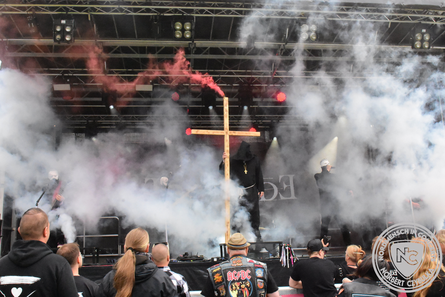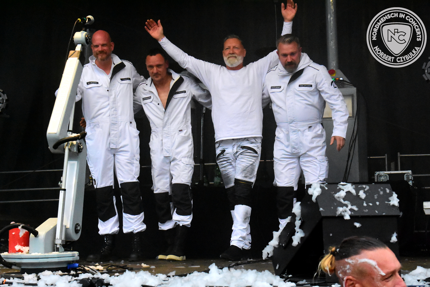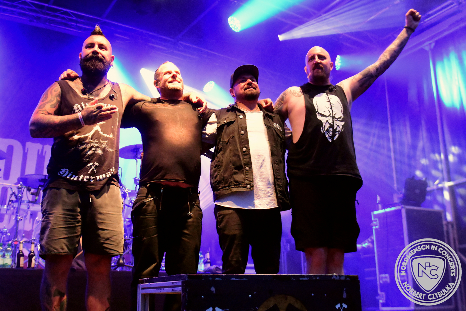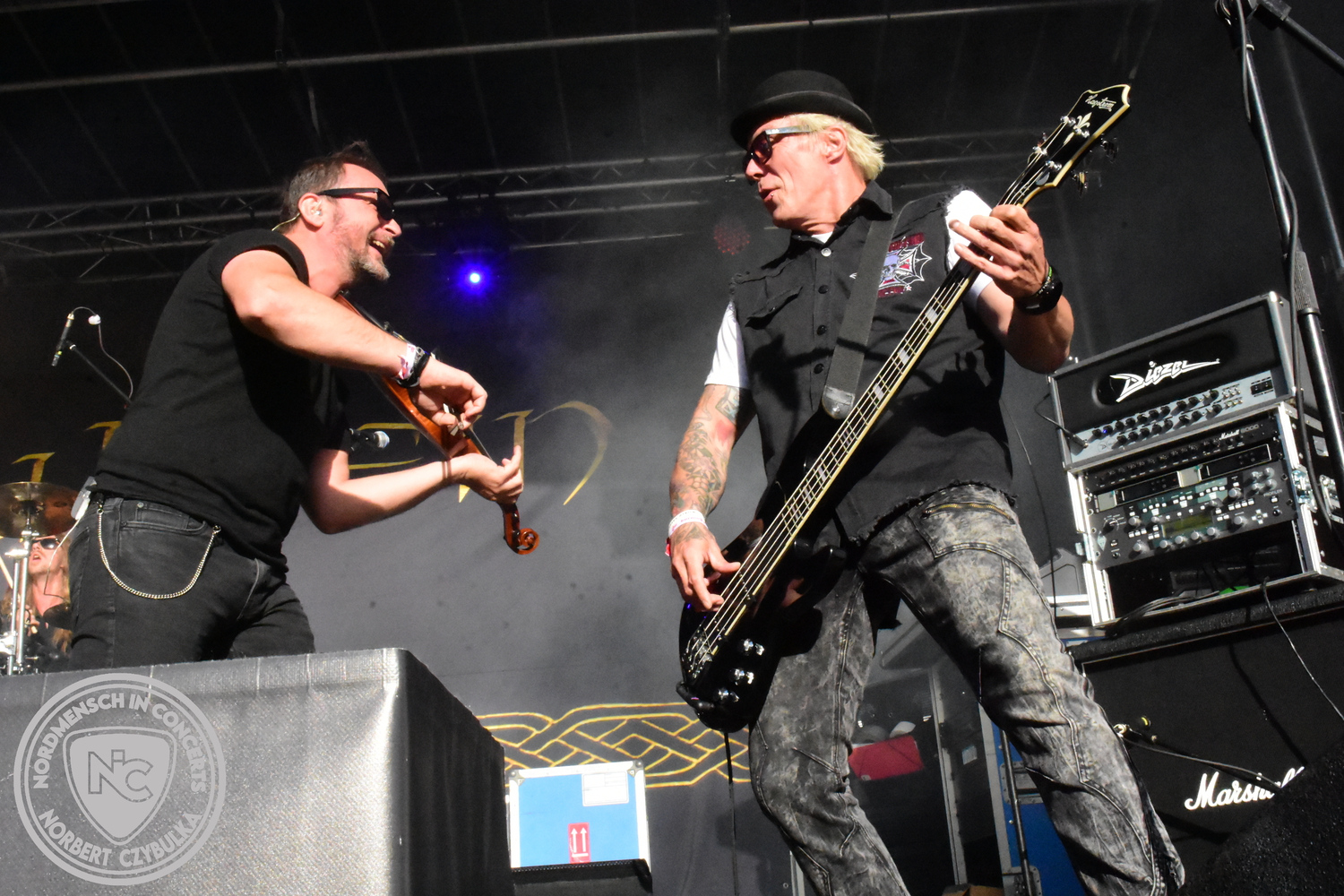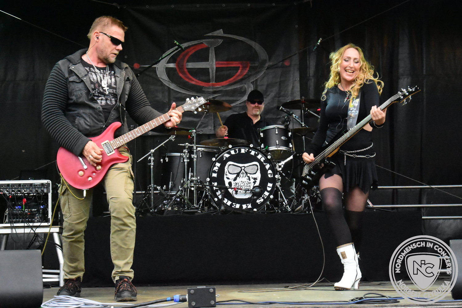 Um 15 Uhr beginnt der Slot von Egomey, einer Darkrockband aus Karlsruhe. Wurde ihr Auftritt im letzten Jahr noch durch heftigen Regen begleitet, bleibt es in diesem Jahr trocken. Es wird langsam voller vor den Bühnen. MegaBosch ist eine deutschsprachige Endzeit-Rock-Band aus dem Raum Hannover und nicht zum ersten Male hier auf dem familiären Festival. Man kennt sich und man schätzt sich. Die Band passt gut zu der kleinen Wasteland-Warriors-Abordnung, die sich ein kleines Areal zurecht gemacht haben. Besondere Aufmerksamkeit erregen die Jungs, als sie als erste Band tatsächlich eine Unterhose auf der Bühne verbrennen. Um 17 Uhr ist dann mein Campingplatz-Nachbar dran. Sündenklang ist ein Nebenprojekt von Martin Soer, dem Sänger der Band Stahlmann. Seine Mitstreiter sind AblaZ (Nachtblut) am Bass sowie Niklas Kahl (Stahlmann/Erdling/Lord Of The Lost) am Schlagzeug. Auch Mart ist bisher auf allen Burning Pants Festivals präsent gewesen und gehört hier irgendwie zur Familie. So ist der Platz denn auch gut gefüllt. Stilistisch mag ich sie nicht einordnen, denn irgendwo zwischen Elektro-Pop und Heavy Metal liegt die Wahrheit. Bei der Show dürfen natürlich auch drei Stahlmann-Songs nicht fehlen. Der reine Elektro-Pop folgt dann danach. Eisfabrik aus Hamburg haben jedoch ihre Fangemeinde. Hier wird das Tanzbein ausgiebig geschwungen. Schaumkanonen sorgen für Stimmung direkt vor der Bühne. Es folgt die Neue Deutsche Härte-Band Schattenmann aus Nürnberg. Als Co-Headliner des Tages haben sie eine Spielzeit von 60 Minuten und bieten den krassen Gegensatz zu ihren Vorgängern. Gitarrist Jan Suk sitzt nach einer Knie Operation auf einem Hocker, lässt sich nicht vertreten. Die Anreise muss beschwerlich gewesen sein. Ich wollte mich noch schlau machen, ob die beiden Bands zusammen gefahren sind, denn auch dArtagnan, eine deutsche Folk-Rock-Band, kommt aus Nürnberg. Und somit folgt die nächste musikalische Wendung. Egal wie man zu derartiger Musik steht, die Bayern verstehen ihren Job und bringen richtig Stimmung in die Menge und die 90 Minuten verfliegen. Für die Nachtschwärmer mit dem richtigen Einlassbändchen startet nun die Party im Club bis zum Morgengrauen.