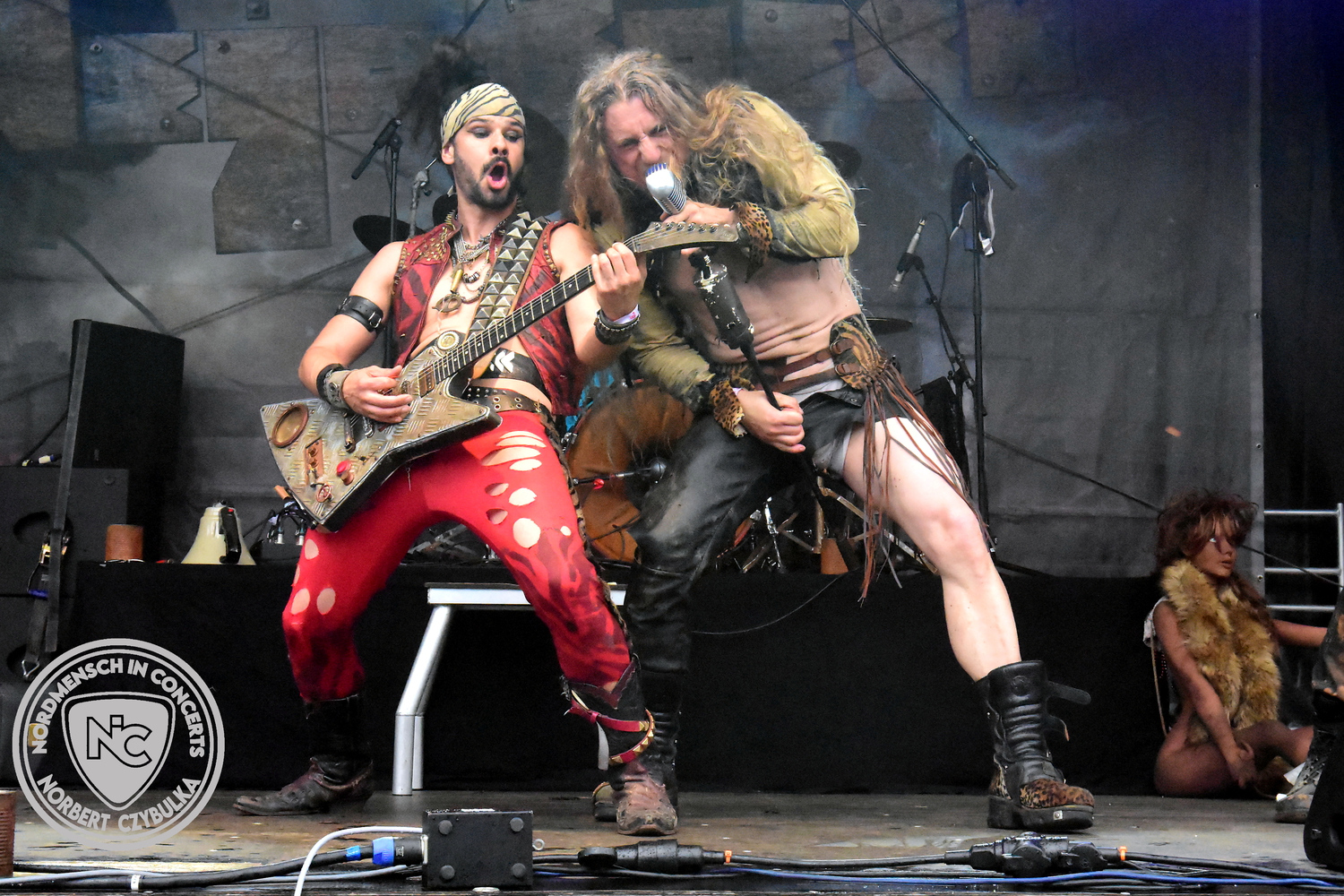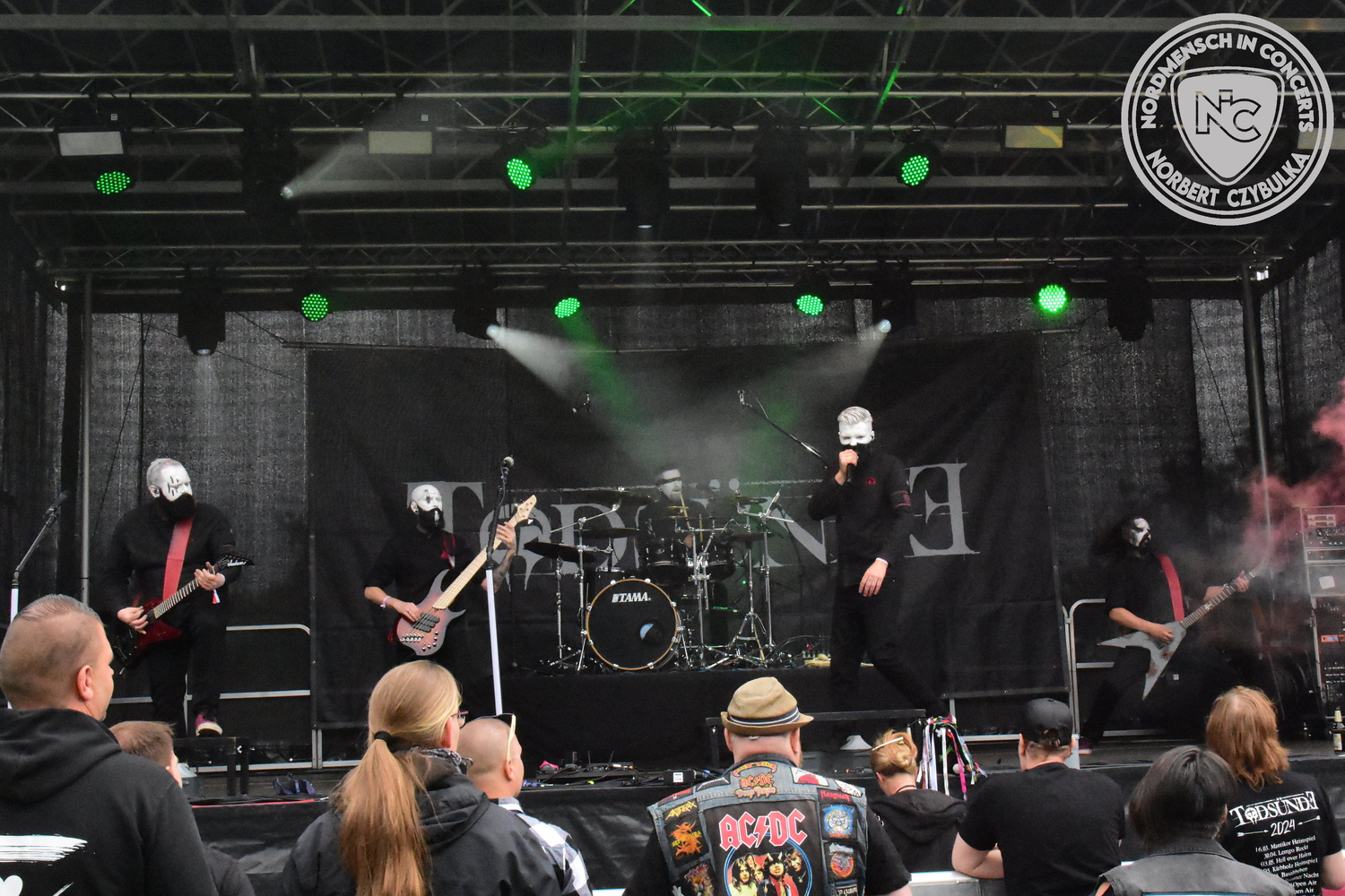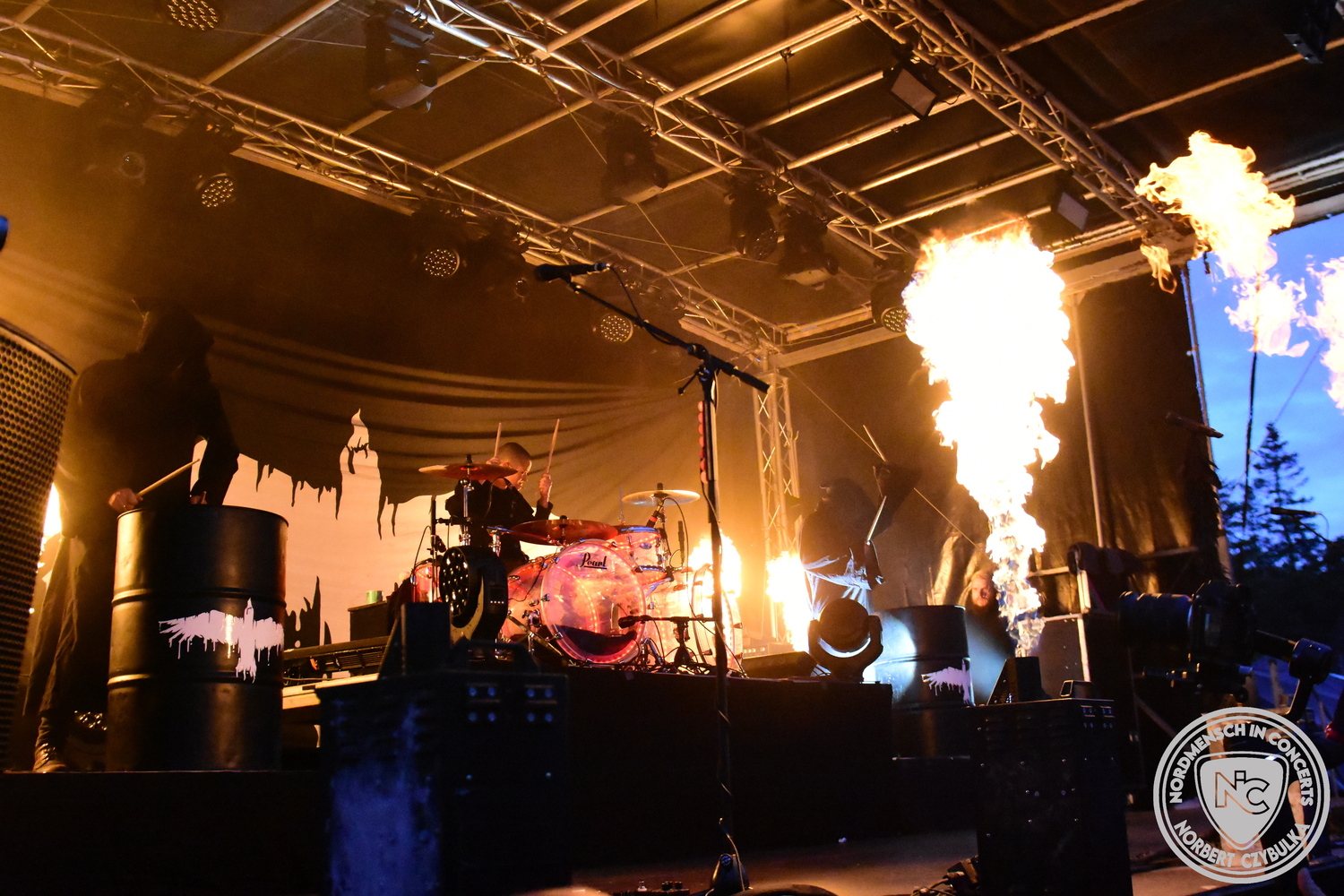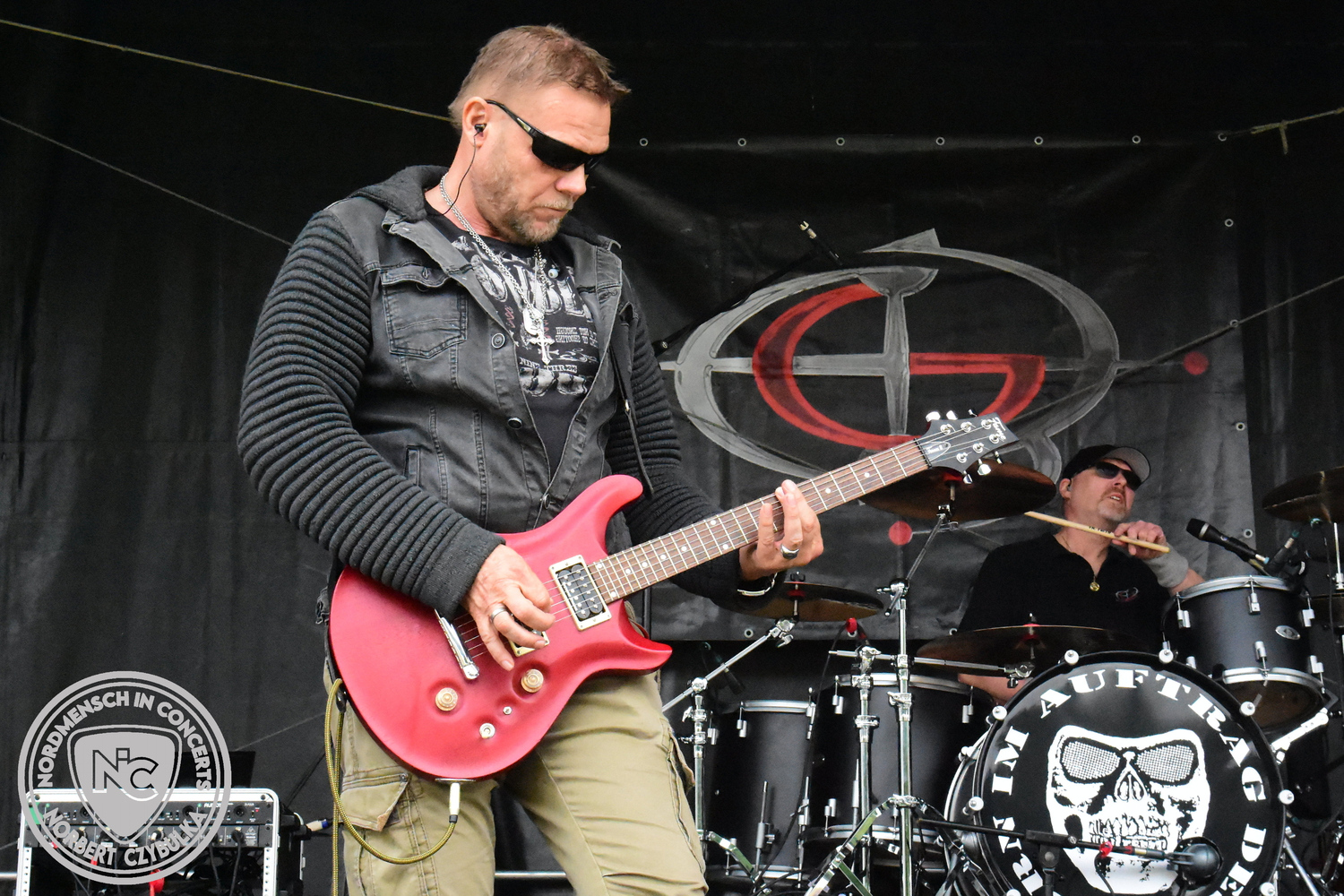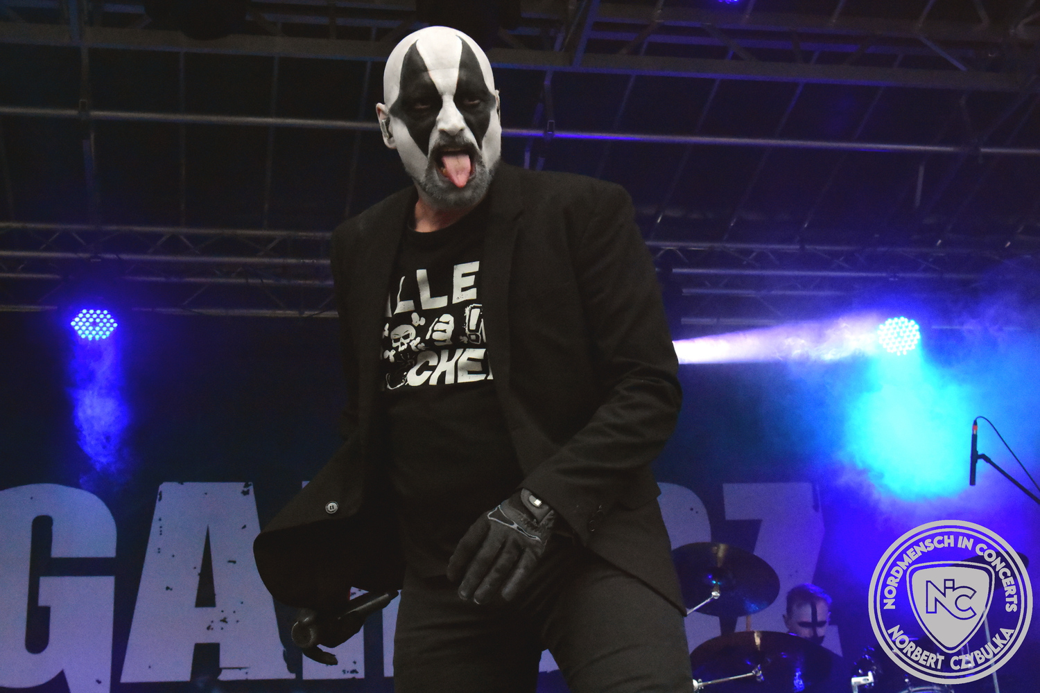 Um 15 Uhr beginnt der Slot von Egomey, einer Darkrockband aus Karlsruhe. Wurde ihr Auftritt im letzten Jahr noch durch heftigen Regen begleitet, bleibt es in diesem Jahr trocken. Es wird langsam voller vor den Bühnen. MegaBosch ist eine deutschsprachige Endzeit-Rock-Band aus dem Raum Hannover und nicht zum ersten Male hier auf dem familiären Festival. Man kennt sich und man schätzt sich. Die Band passt gut zu der kleinen Wasteland-Warriors-Abordnung, die sich ein kleines Areal zurecht gemacht haben. Besondere Aufmerksamkeit erregen die Jungs, als sie als erste Band tatsächlich eine Unterhose auf der Bühne verbrennen. Um 17 Uhr ist dann mein Campingplatz-Nachbar dran. Sündenklang ist ein Nebenprojekt von Martin Soer, dem Sänger der Band Stahlmann. Seine Mitstreiter sind AblaZ (Nachtblut) am Bass sowie Niklas Kahl (Stahlmann/Erdling/Lord Of The Lost) am Schlagzeug. Auch Mart ist bisher auf allen Burning Pants Festivals präsent gewesen und gehört hier irgendwie zur Familie. So ist der Platz denn auch gut gefüllt. Stilistisch mag ich sie nicht einordnen, denn irgendwo zwischen Elektro-Pop und Heavy Metal liegt die Wahrheit. Bei der Show dürfen natürlich auch drei Stahlmann-Songs nicht fehlen. Der reine Elektro-Pop folgt dann danach. Eisfabrik aus Hamburg haben jedoch ihre Fangemeinde. Hier wird das Tanzbein ausgiebig geschwungen. Schaumkanonen sorgen für Stimmung direkt vor der Bühne. Es folgt die Neue Deutsche Härte-Band Schattenmann aus Nürnberg. Als Co-Headliner des Tages haben sie eine Spielzeit von 60 Minuten und bieten den krassen Gegensatz zu ihren Vorgängern. Gitarrist Jan Suk sitzt nach einer Knie Operation auf einem Hocker, lässt sich nicht vertreten. Die Anreise muss beschwerlich gewesen sein. Ich wollte mich noch schlau machen, ob die beiden Bands zusammen gefahren sind, denn auch dArtagnan, eine deutsche Folk-Rock-Band, kommt aus Nürnberg. Und somit folgt die nächste musikalische Wendung. Egal wie man zu derartiger Musik steht, die Bayern verstehen ihren Job und bringen richtig Stimmung in die Menge und die 90 Minuten verfliegen. Für die Nachtschwärmer mit dem richtigen Einlassbändchen startet nun die Party im Club bis zum Morgengrauen.