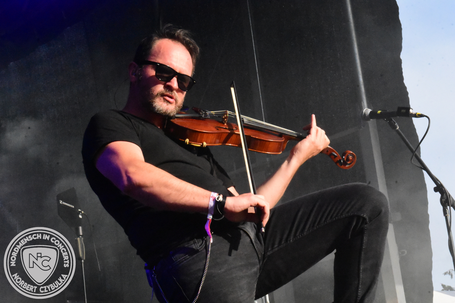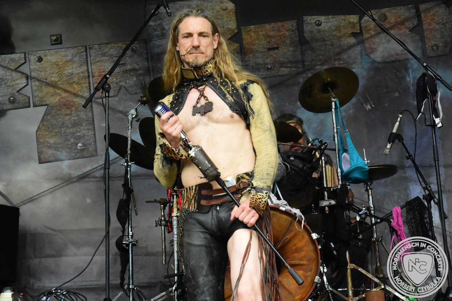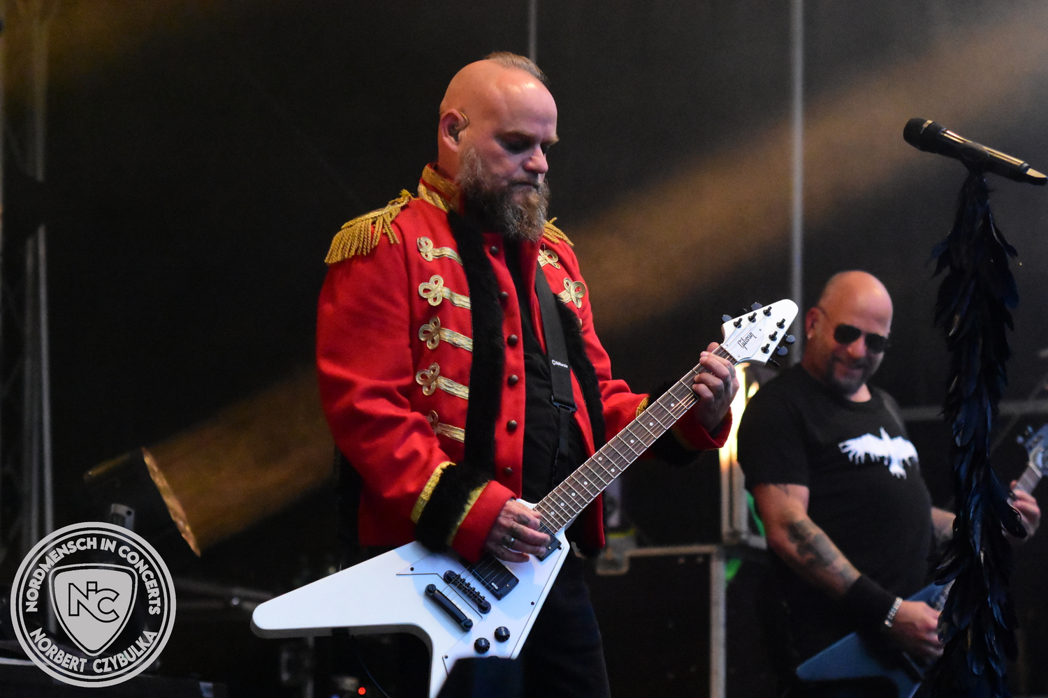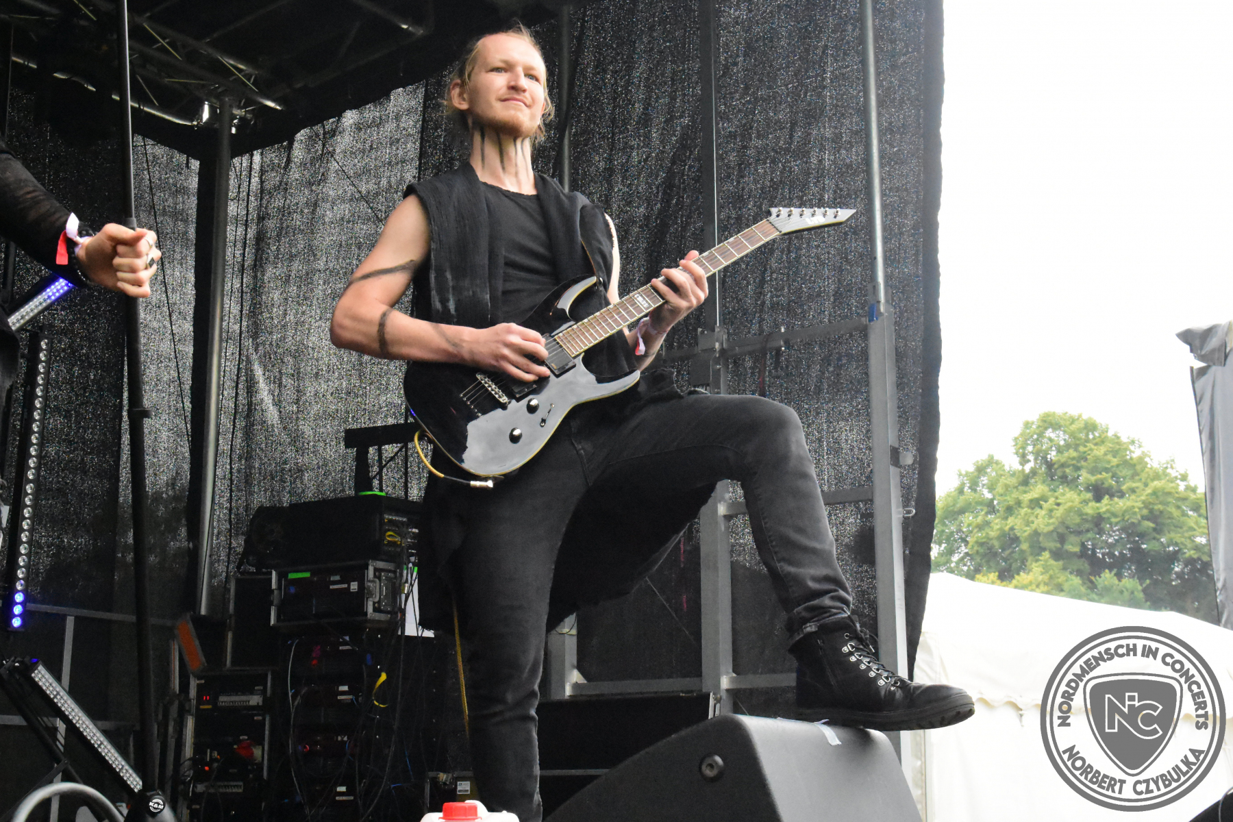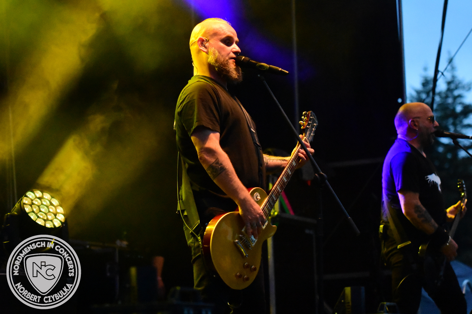 Um 15 Uhr beginnt der Slot von Egomey, einer Darkrockband aus Karlsruhe. Wurde ihr Auftritt im letzten Jahr noch durch heftigen Regen begleitet, bleibt es in diesem Jahr trocken. Es wird langsam voller vor den Bühnen. MegaBosch ist eine deutschsprachige Endzeit-Rock-Band aus dem Raum Hannover und nicht zum ersten Male hier auf dem familiären Festival. Man kennt sich und man schätzt sich. Die Band passt gut zu der kleinen Wasteland-Warriors-Abordnung, die sich ein kleines Areal zurecht gemacht haben. Besondere Aufmerksamkeit erregen die Jungs, als sie als erste Band tatsächlich eine Unterhose auf der Bühne verbrennen. Um 17 Uhr ist dann mein Campingplatz-Nachbar dran. Sündenklang ist ein Nebenprojekt von Martin Soer, dem Sänger der Band Stahlmann. Seine Mitstreiter sind AblaZ (Nachtblut) am Bass sowie Niklas Kahl (Stahlmann/Erdling/Lord Of The Lost) am Schlagzeug. Auch Mart ist bisher auf allen Burning Pants Festivals präsent gewesen und gehört hier irgendwie zur Familie. So ist der Platz denn auch gut gefüllt. Stilistisch mag ich sie nicht einordnen, denn irgendwo zwischen Elektro-Pop und Heavy Metal liegt die Wahrheit. Bei der Show dürfen natürlich auch drei Stahlmann-Songs nicht fehlen. Der reine Elektro-Pop folgt dann danach. Eisfabrik aus Hamburg haben jedoch ihre Fangemeinde. Hier wird das Tanzbein ausgiebig geschwungen. Schaumkanonen sorgen für Stimmung direkt vor der Bühne. Es folgt die Neue Deutsche Härte-Band Schattenmann aus Nürnberg. Als Co-Headliner des Tages haben sie eine Spielzeit von 60 Minuten und bieten den krassen Gegensatz zu ihren Vorgängern. Gitarrist Jan Suk sitzt nach einer Knie Operation auf einem Hocker, lässt sich nicht vertreten. Die Anreise muss beschwerlich gewesen sein. Ich wollte mich noch schlau machen, ob die beiden Bands zusammen gefahren sind, denn auch dArtagnan, eine deutsche Folk-Rock-Band, kommt aus Nürnberg. Und somit folgt die nächste musikalische Wendung. Egal wie man zu derartiger Musik steht, die Bayern verstehen ihren Job und bringen richtig Stimmung in die Menge und die 90 Minuten verfliegen. Für die Nachtschwärmer mit dem richtigen Einlassbändchen startet nun die Party im Club bis zum Morgengrauen.