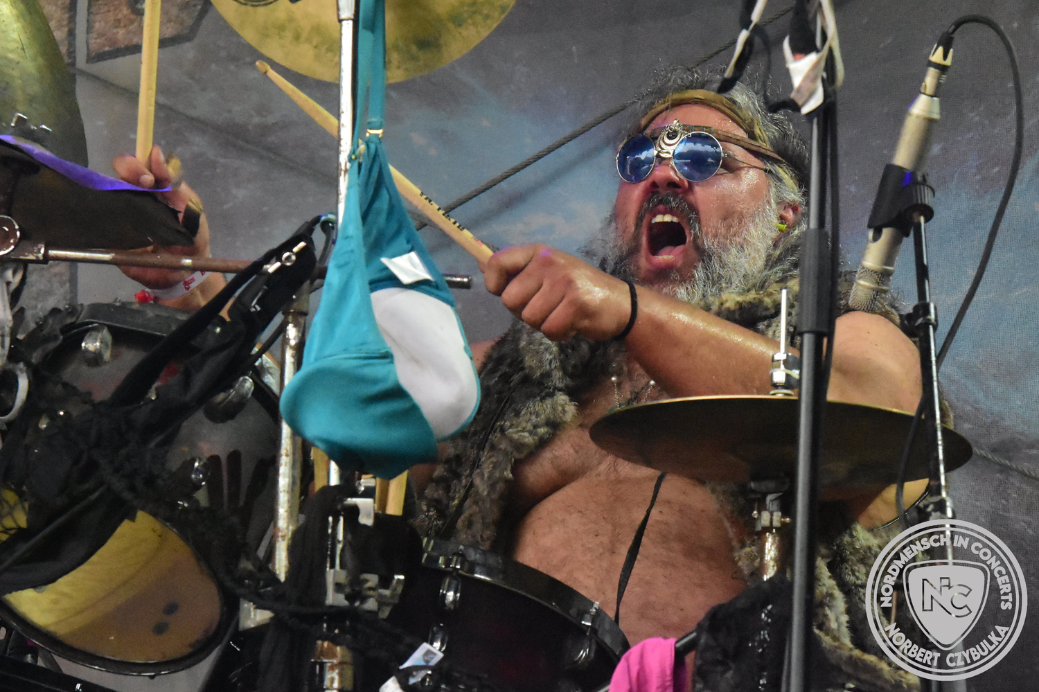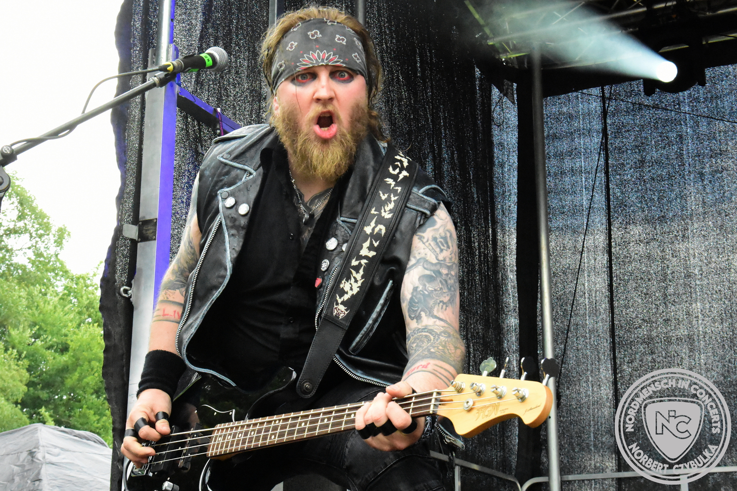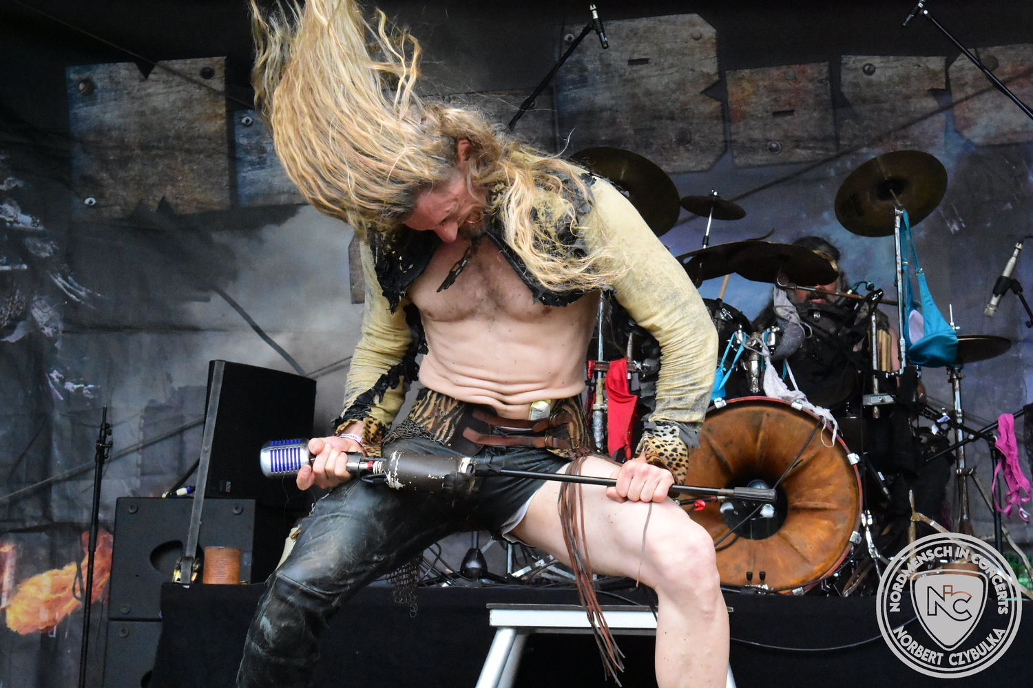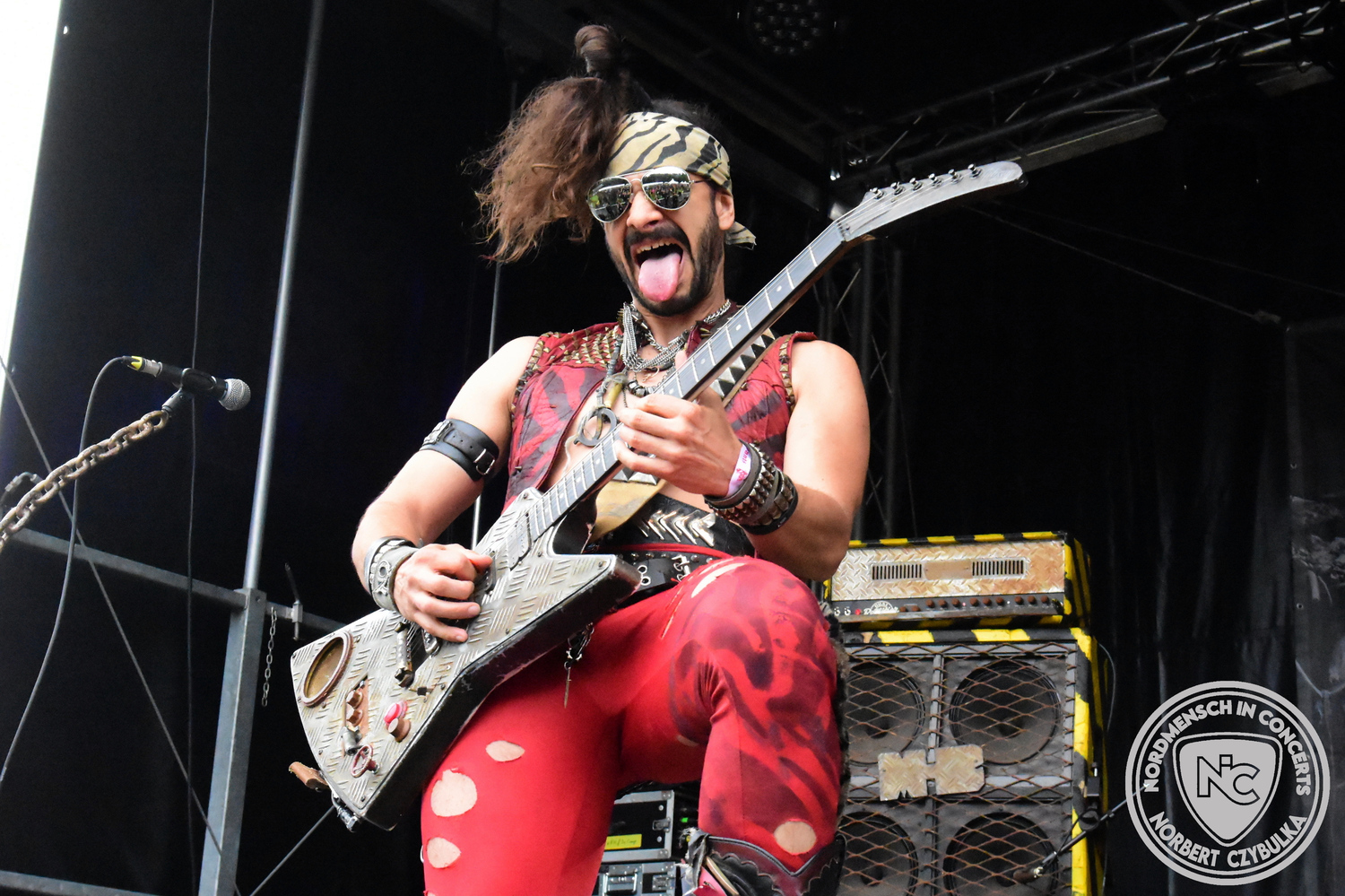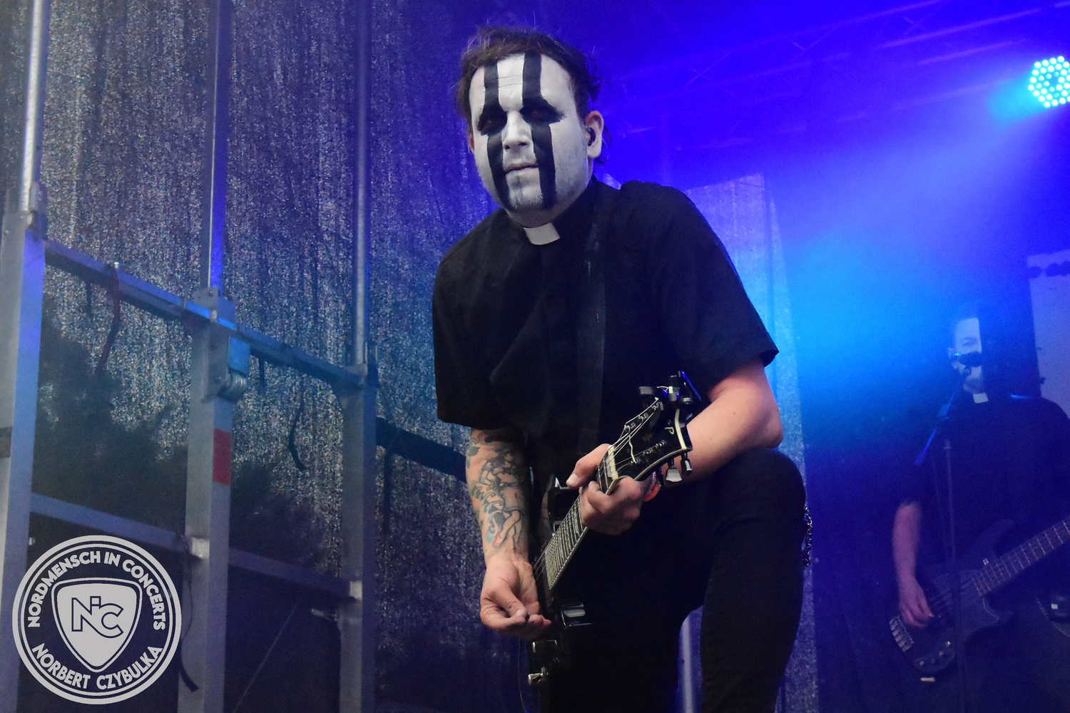 Um 15 Uhr beginnt der Slot von Egomey, einer Darkrockband aus Karlsruhe. Wurde ihr Auftritt im letzten Jahr noch durch heftigen Regen begleitet, bleibt es in diesem Jahr trocken. Es wird langsam voller vor den Bühnen. MegaBosch ist eine deutschsprachige Endzeit-Rock-Band aus dem Raum Hannover und nicht zum ersten Male hier auf dem familiären Festival. Man kennt sich und man schätzt sich. Die Band passt gut zu der kleinen Wasteland-Warriors-Abordnung, die sich ein kleines Areal zurecht gemacht haben. Besondere Aufmerksamkeit erregen die Jungs, als sie als erste Band tatsächlich eine Unterhose auf der Bühne verbrennen. Um 17 Uhr ist dann mein Campingplatz-Nachbar dran. Sündenklang ist ein Nebenprojekt von Martin Soer, dem Sänger der Band Stahlmann. Seine Mitstreiter sind AblaZ (Nachtblut) am Bass sowie Niklas Kahl (Stahlmann/Erdling/Lord Of The Lost) am Schlagzeug. Auch Mart ist bisher auf allen Burning Pants Festivals präsent gewesen und gehört hier irgendwie zur Familie. So ist der Platz denn auch gut gefüllt. Stilistisch mag ich sie nicht einordnen, denn irgendwo zwischen Elektro-Pop und Heavy Metal liegt die Wahrheit. Bei der Show dürfen natürlich auch drei Stahlmann-Songs nicht fehlen. Der reine Elektro-Pop folgt dann danach. Eisfabrik aus Hamburg haben jedoch ihre Fangemeinde. Hier wird das Tanzbein ausgiebig geschwungen. Schaumkanonen sorgen für Stimmung direkt vor der Bühne. Es folgt die Neue Deutsche Härte-Band Schattenmann aus Nürnberg. Als Co-Headliner des Tages haben sie eine Spielzeit von 60 Minuten und bieten den krassen Gegensatz zu ihren Vorgängern. Gitarrist Jan Suk sitzt nach einer Knie Operation auf einem Hocker, lässt sich nicht vertreten. Die Anreise muss beschwerlich gewesen sein. Ich wollte mich noch schlau machen, ob die beiden Bands zusammen gefahren sind, denn auch dArtagnan, eine deutsche Folk-Rock-Band, kommt aus Nürnberg. Und somit folgt die nächste musikalische Wendung. Egal wie man zu derartiger Musik steht, die Bayern verstehen ihren Job und bringen richtig Stimmung in die Menge und die 90 Minuten verfliegen. Für die Nachtschwärmer mit dem richtigen Einlassbändchen startet nun die Party im Club bis zum Morgengrauen.