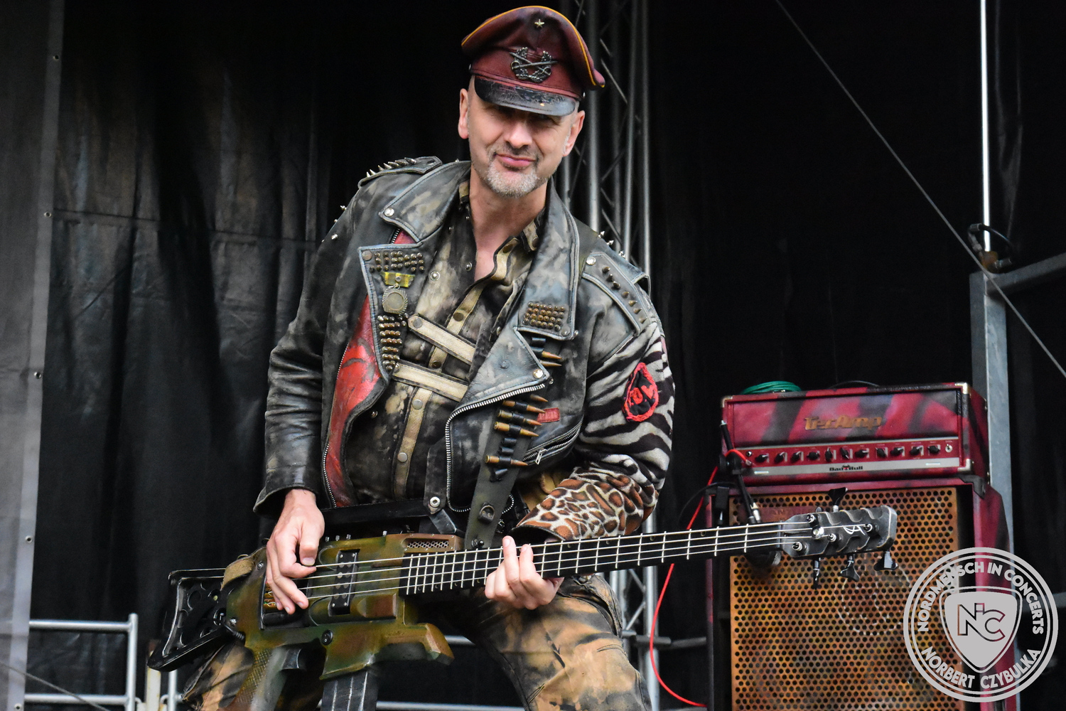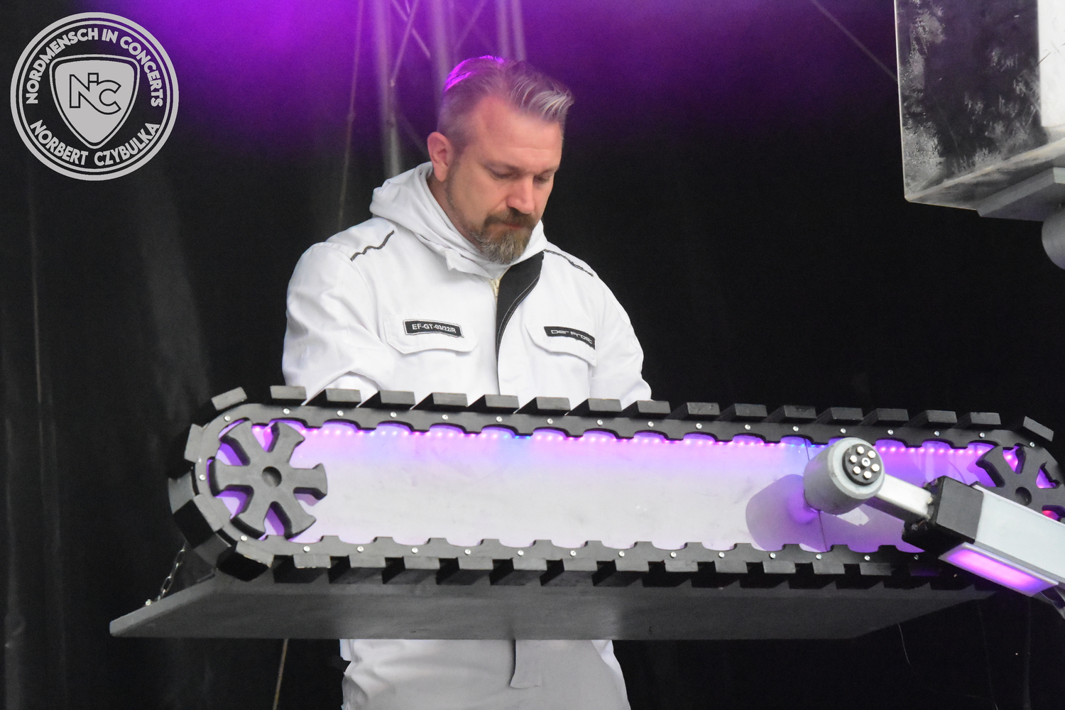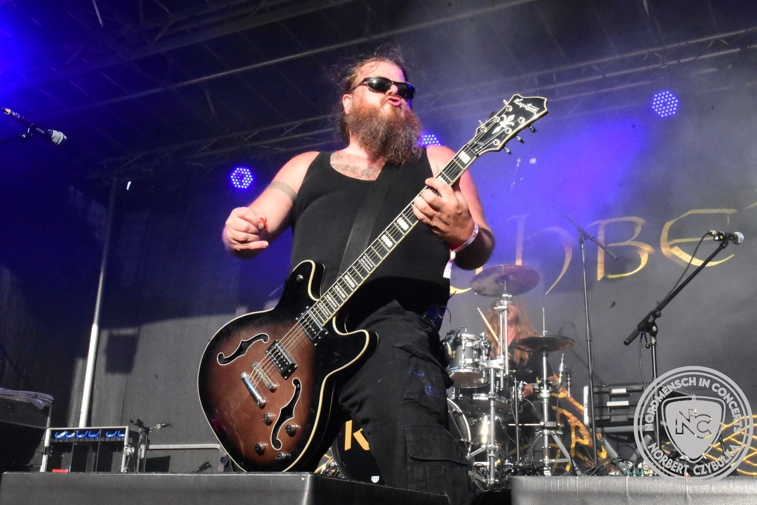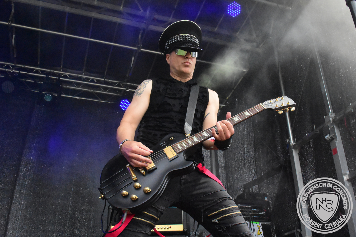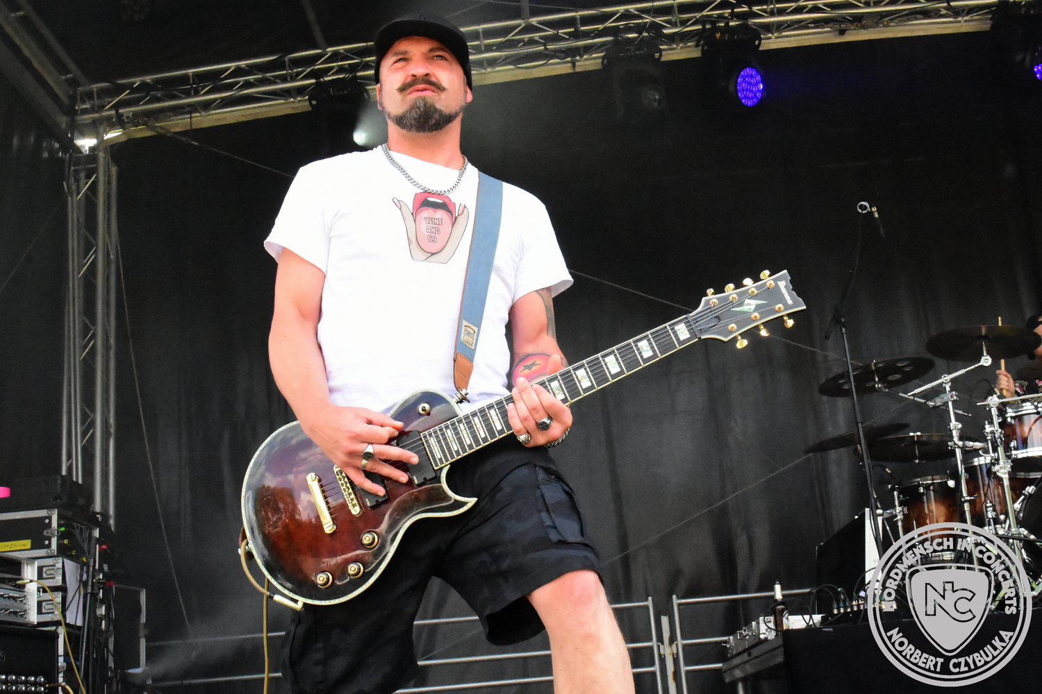 Um 15 Uhr beginnt der Slot von Egomey, einer Darkrockband aus Karlsruhe. Wurde ihr Auftritt im letzten Jahr noch durch heftigen Regen begleitet, bleibt es in diesem Jahr trocken. Es wird langsam voller vor den Bühnen. MegaBosch ist eine deutschsprachige Endzeit-Rock-Band aus dem Raum Hannover und nicht zum ersten Male hier auf dem familiären Festival. Man kennt sich und man schätzt sich. Die Band passt gut zu der kleinen Wasteland-Warriors-Abordnung, die sich ein kleines Areal zurecht gemacht haben. Besondere Aufmerksamkeit erregen die Jungs, als sie als erste Band tatsächlich eine Unterhose auf der Bühne verbrennen. Um 17 Uhr ist dann mein Campingplatz-Nachbar dran. Sündenklang ist ein Nebenprojekt von Martin Soer, dem Sänger der Band Stahlmann. Seine Mitstreiter sind AblaZ (Nachtblut) am Bass sowie Niklas Kahl (Stahlmann/Erdling/Lord Of The Lost) am Schlagzeug. Auch Mart ist bisher auf allen Burning Pants Festivals präsent gewesen und gehört hier irgendwie zur Familie. So ist der Platz denn auch gut gefüllt. Stilistisch mag ich sie nicht einordnen, denn irgendwo zwischen Elektro-Pop und Heavy Metal liegt die Wahrheit. Bei der Show dürfen natürlich auch drei Stahlmann-Songs nicht fehlen. Der reine Elektro-Pop folgt dann danach. Eisfabrik aus Hamburg haben jedoch ihre Fangemeinde. Hier wird das Tanzbein ausgiebig geschwungen. Schaumkanonen sorgen für Stimmung direkt vor der Bühne. Es folgt die Neue Deutsche Härte-Band Schattenmann aus Nürnberg. Als Co-Headliner des Tages haben sie eine Spielzeit von 60 Minuten und bieten den krassen Gegensatz zu ihren Vorgängern. Gitarrist Jan Suk sitzt nach einer Knie Operation auf einem Hocker, lässt sich nicht vertreten. Die Anreise muss beschwerlich gewesen sein. Ich wollte mich noch schlau machen, ob die beiden Bands zusammen gefahren sind, denn auch dArtagnan, eine deutsche Folk-Rock-Band, kommt aus Nürnberg. Und somit folgt die nächste musikalische Wendung. Egal wie man zu derartiger Musik steht, die Bayern verstehen ihren Job und bringen richtig Stimmung in die Menge und die 90 Minuten verfliegen. Für die Nachtschwärmer mit dem richtigen Einlassbändchen startet nun die Party im Club bis zum Morgengrauen.