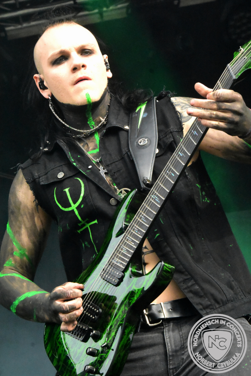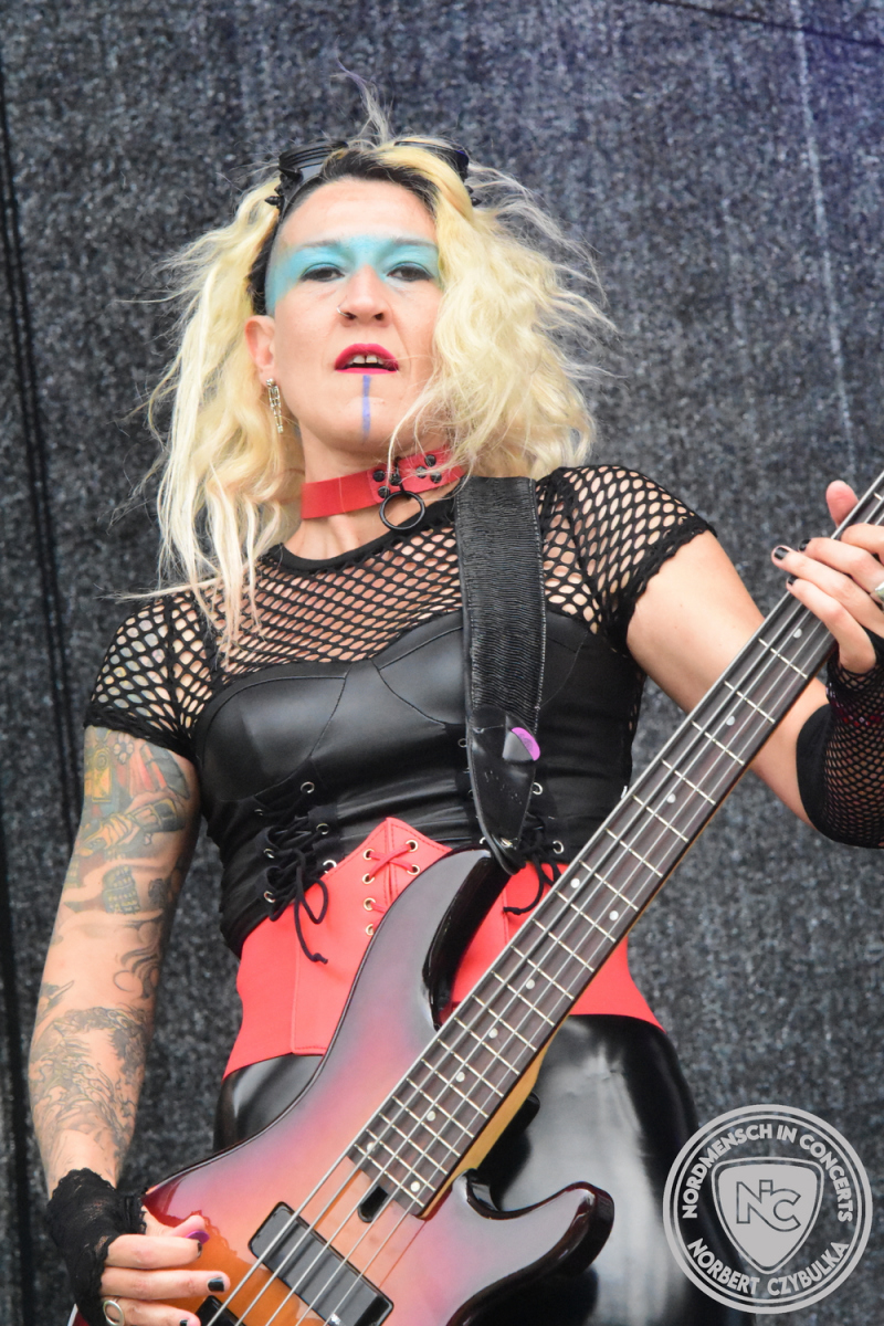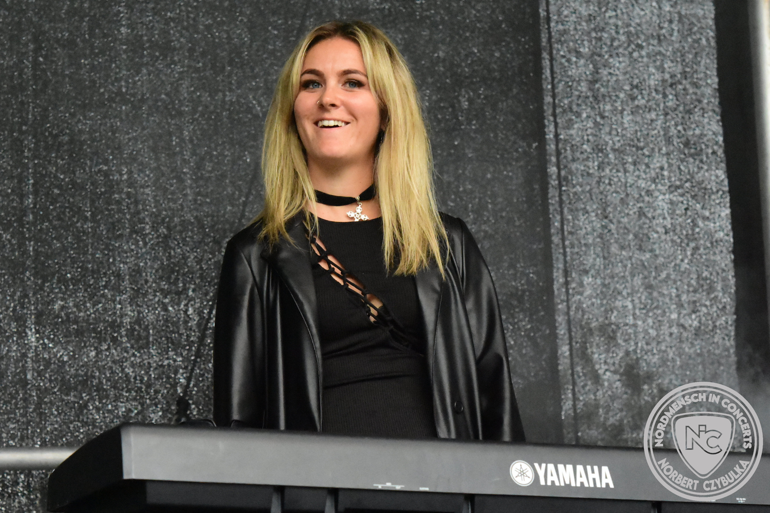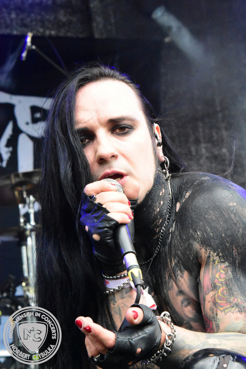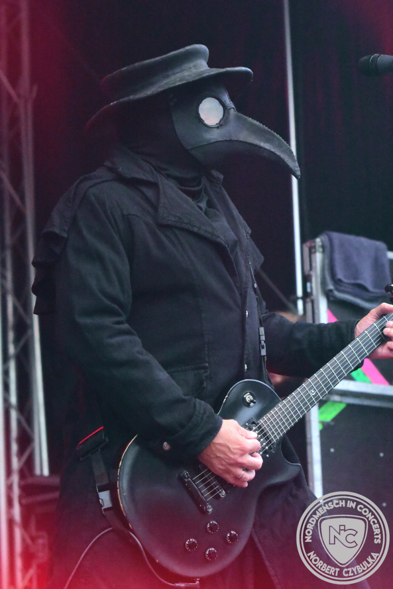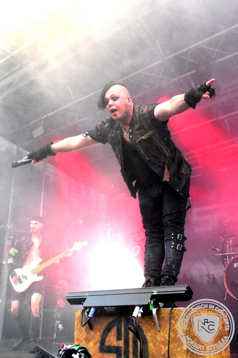 Es folgen die Essener Hardrocker von Formosa. Na gut, auch ihr Sänger ist manchmal ein Paradiesvogel, der Schlagzeuger ist gelernter Bierbrauermeister und ihre Platten sind ausgesprochen gut. Den 17 Uhr Slot füllen Mystigma aus. Düsterer Gothic Rock- und Metal aus Osnabrück statt Hardrock aus Heide. Sie sind kurzfristig für Pay Pandora eingesprungen, die sich vor zwei Wochen aufgelöst haben. Danach folgt meine persönliche Entdeckung des Festivals. Mit Motel Transylvania, aus dem nördlichen Italien, steht eine junge Band auf der Bühne, die gerade auf vielen europäischen Festivals ordentlich abräumt. Sie sind eine Industrial Metal Band und feiern mit ihren ersten beiden Scheiben große Erfolge in der Szene. Besonders abgefeiert hat die Menge den Song „Children Of The Dark“, den sie zu Ehren des morgigen Headliners Mono Inc. performen. Allerdings mussten sie auch ihren Hit „Generation Lost“ als Zugabe noch einmal wiederholen.