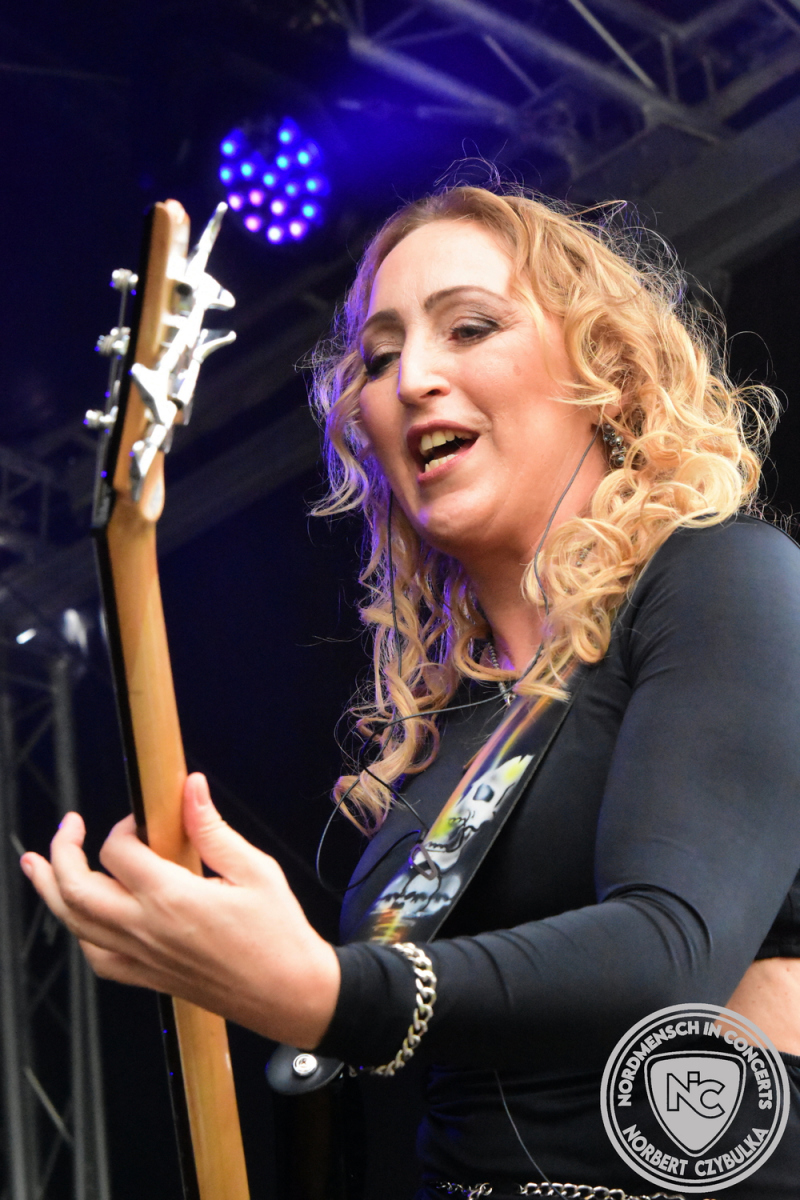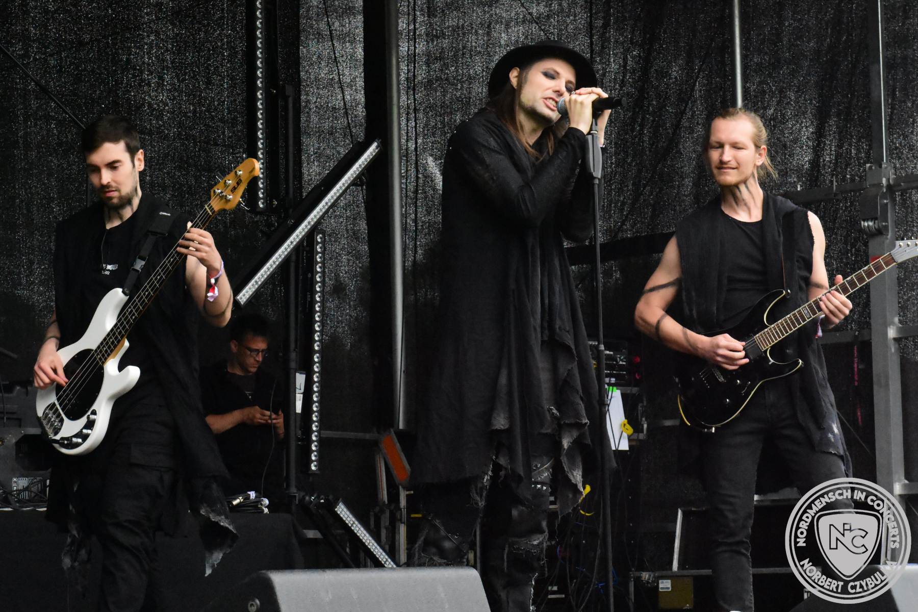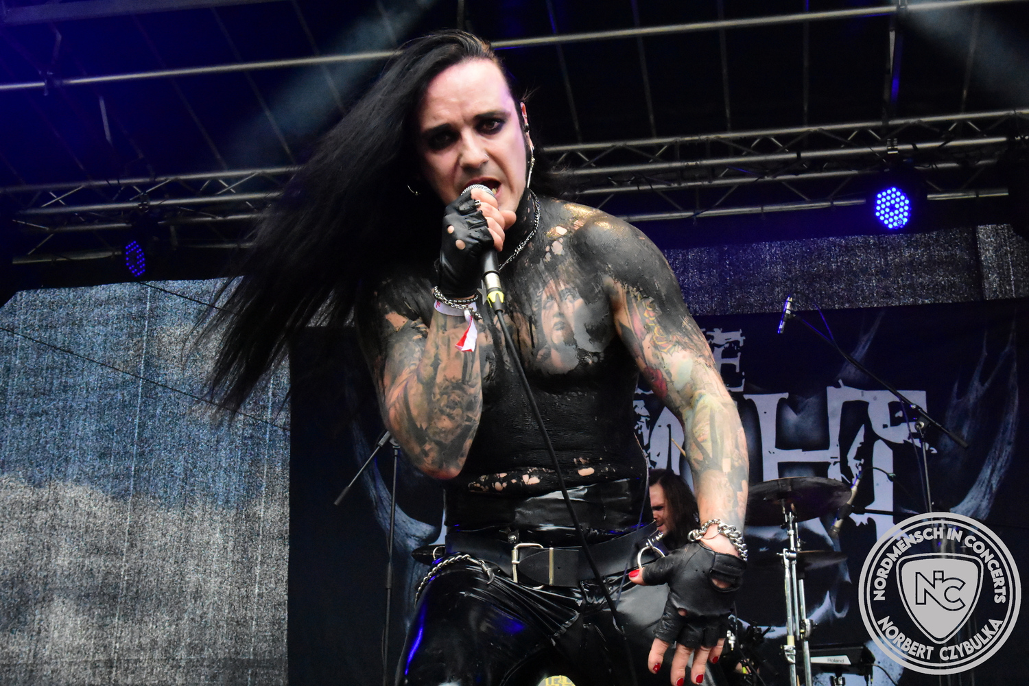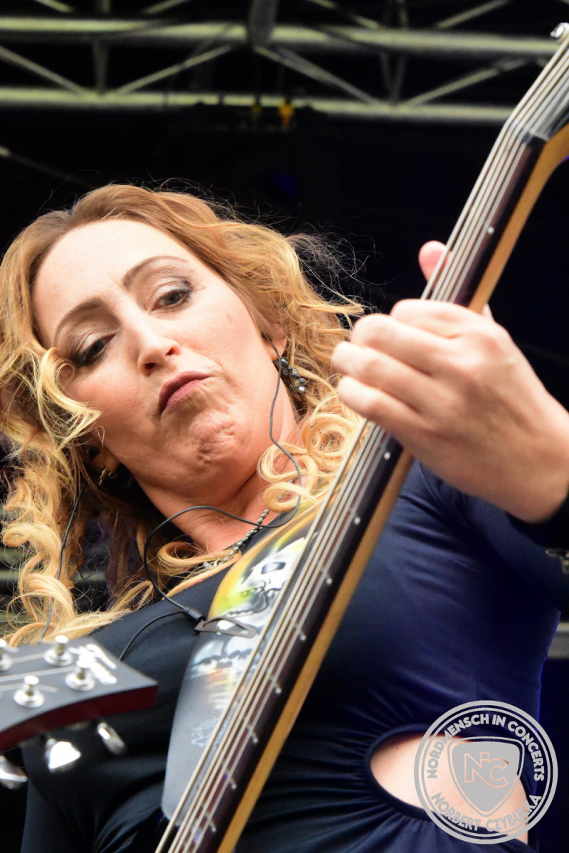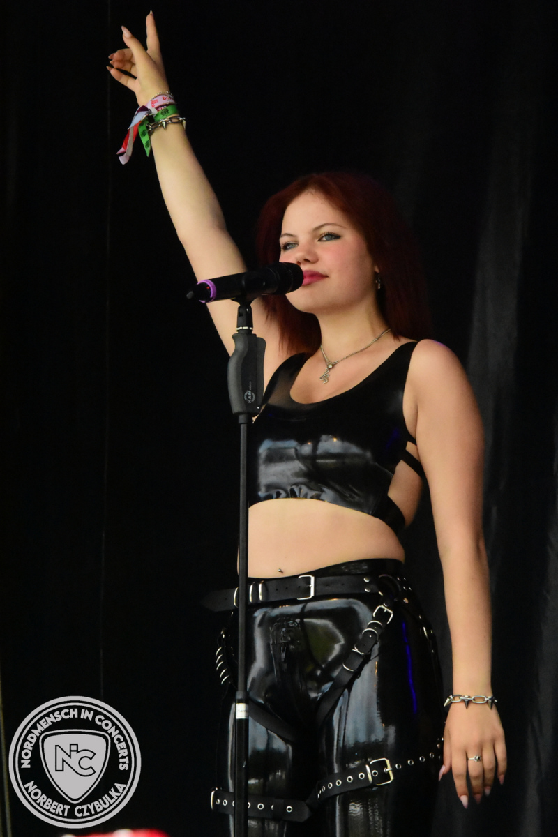 Es folgen die Essener Hardrocker von Formosa. Na gut, auch ihr Sänger ist manchmal ein Paradiesvogel, der Schlagzeuger ist gelernter Bierbrauermeister und ihre Platten sind ausgesprochen gut. Den 17 Uhr Slot füllen Mystigma aus. Düsterer Gothic Rock- und Metal aus Osnabrück statt Hardrock aus Heide. Sie sind kurzfristig für Pay Pandora eingesprungen, die sich vor zwei Wochen aufgelöst haben. Danach folgt meine persönliche Entdeckung des Festivals. Mit Motel Transylvania, aus dem nördlichen Italien, steht eine junge Band auf der Bühne, die gerade auf vielen europäischen Festivals ordentlich abräumt. Sie sind eine Industrial Metal Band und feiern mit ihren ersten beiden Scheiben große Erfolge in der Szene. Besonders abgefeiert hat die Menge den Song „Children Of The Dark“, den sie zu Ehren des morgigen Headliners Mono Inc. performen. Allerdings mussten sie auch ihren Hit „Generation Lost“ als Zugabe noch einmal wiederholen.