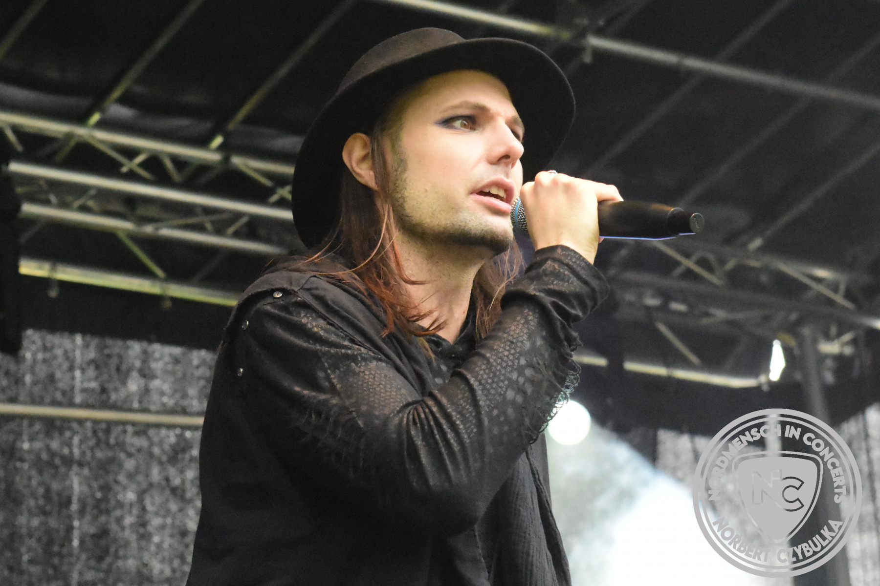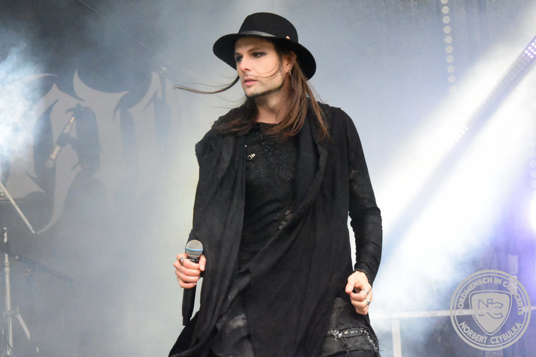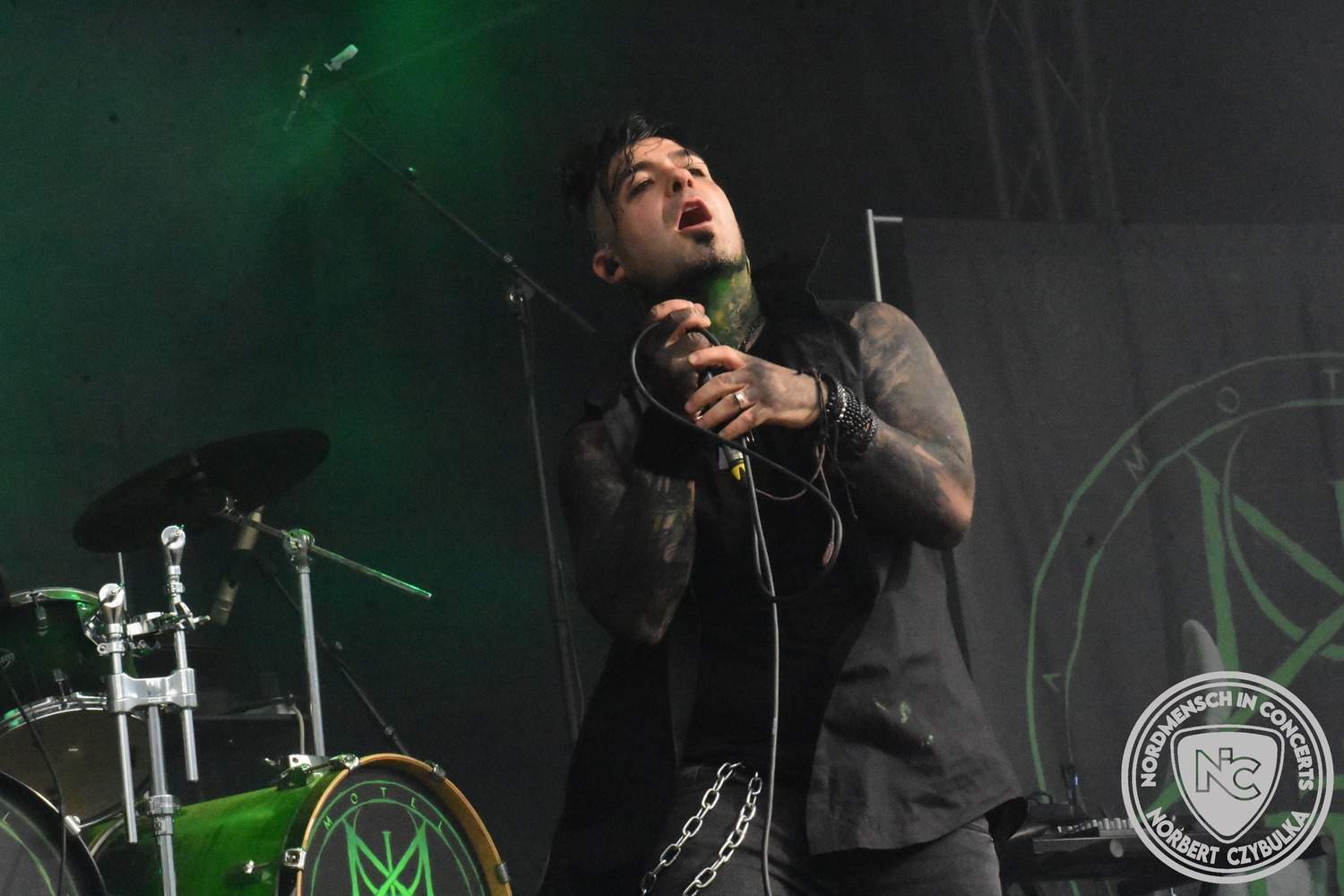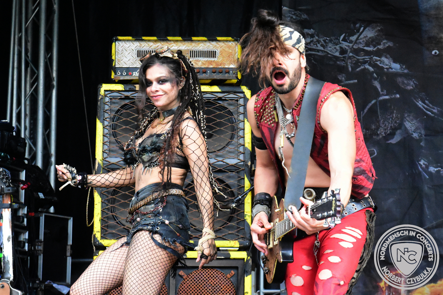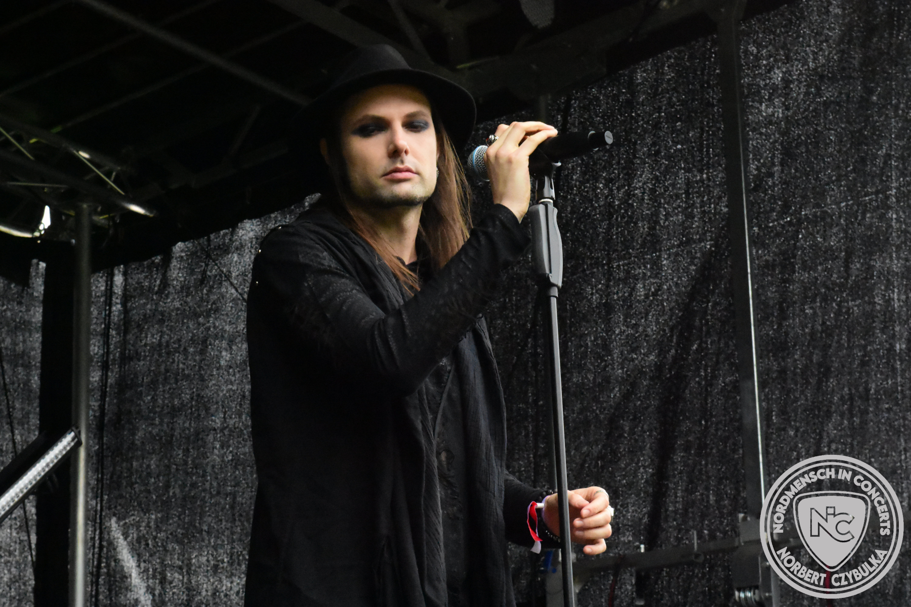 Es folgen die Essener Hardrocker von Formosa. Na gut, auch ihr Sänger ist manchmal ein Paradiesvogel, der Schlagzeuger ist gelernter Bierbrauermeister und ihre Platten sind ausgesprochen gut. Den 17 Uhr Slot füllen Mystigma aus. Düsterer Gothic Rock- und Metal aus Osnabrück statt Hardrock aus Heide. Sie sind kurzfristig für Pay Pandora eingesprungen, die sich vor zwei Wochen aufgelöst haben. Danach folgt meine persönliche Entdeckung des Festivals. Mit Motel Transylvania, aus dem nördlichen Italien, steht eine junge Band auf der Bühne, die gerade auf vielen europäischen Festivals ordentlich abräumt. Sie sind eine Industrial Metal Band und feiern mit ihren ersten beiden Scheiben große Erfolge in der Szene. Besonders abgefeiert hat die Menge den Song „Children Of The Dark“, den sie zu Ehren des morgigen Headliners Mono Inc. performen. Allerdings mussten sie auch ihren Hit „Generation Lost“ als Zugabe noch einmal wiederholen.