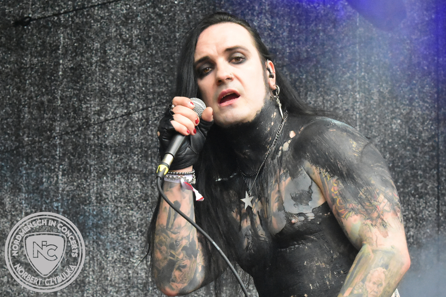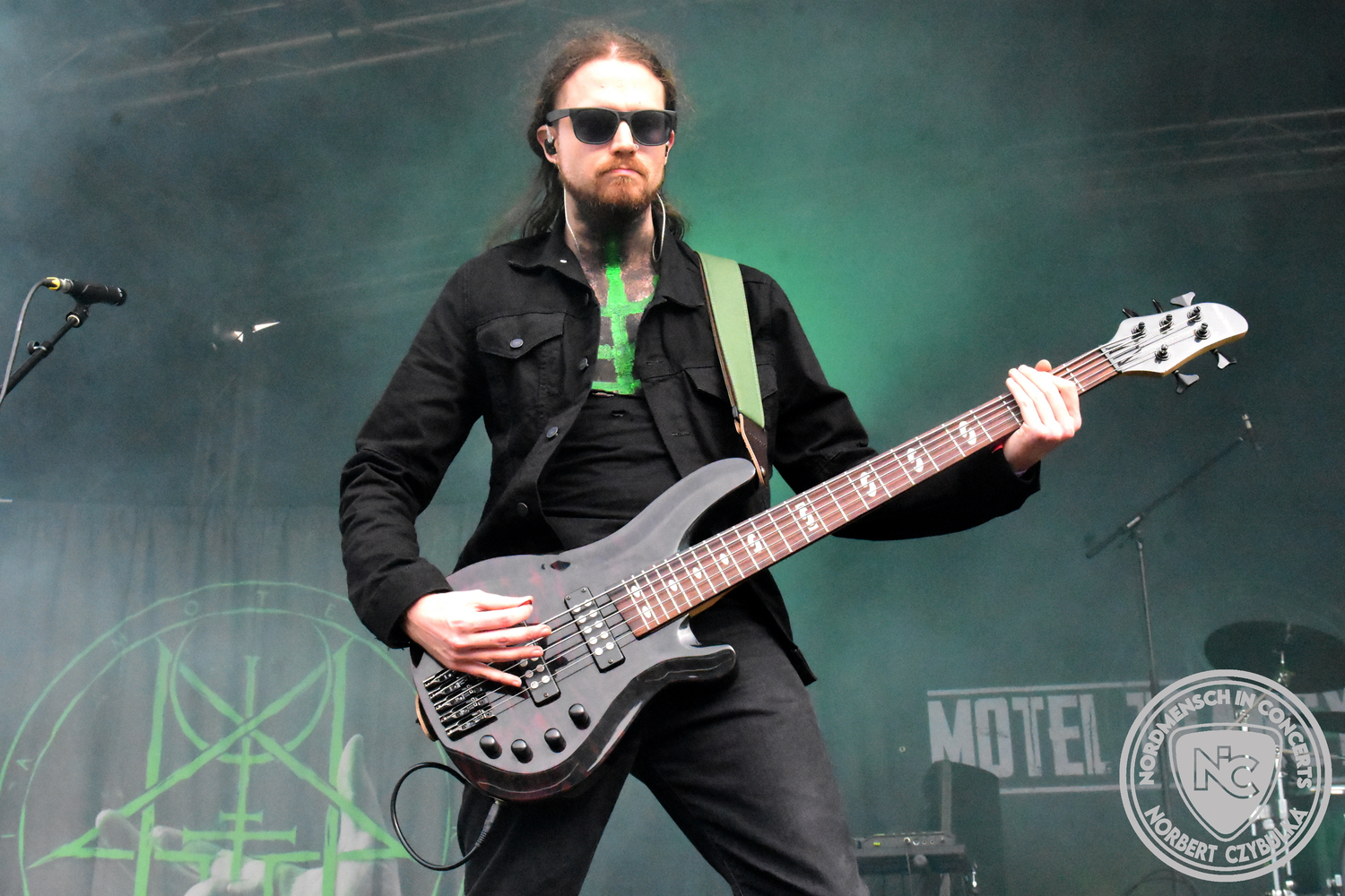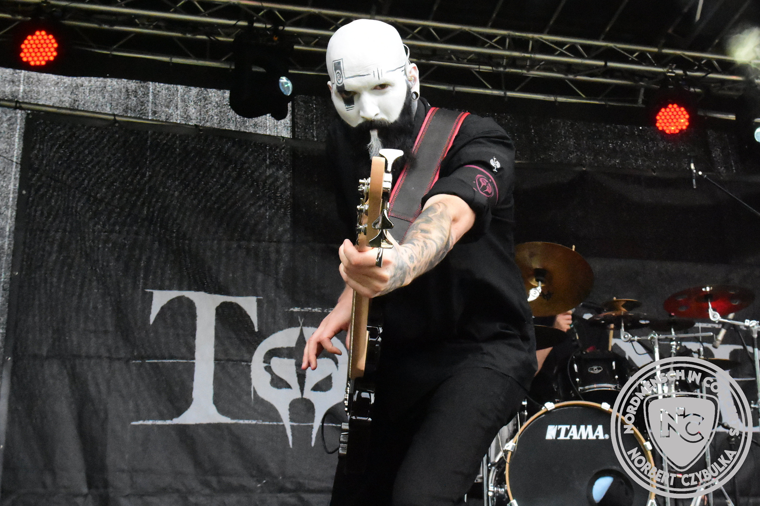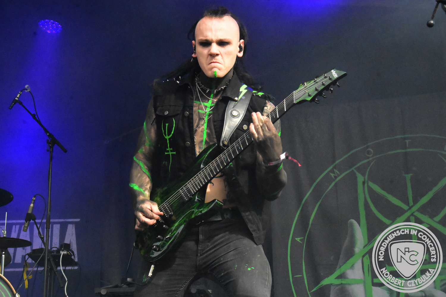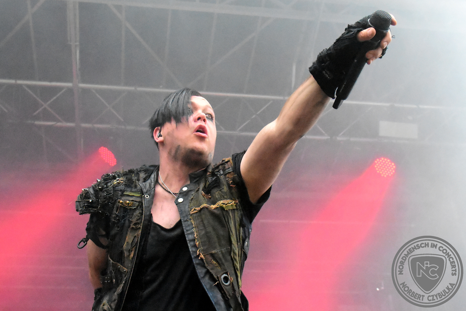 Es folgen die Essener Hardrocker von Formosa. Na gut, auch ihr Sänger ist manchmal ein Paradiesvogel, der Schlagzeuger ist gelernter Bierbrauermeister und ihre Platten sind ausgesprochen gut. Den 17 Uhr Slot füllen Mystigma aus. Düsterer Gothic Rock- und Metal aus Osnabrück statt Hardrock aus Heide. Sie sind kurzfristig für Pay Pandora eingesprungen, die sich vor zwei Wochen aufgelöst haben. Danach folgt meine persönliche Entdeckung des Festivals. Mit Motel Transylvania, aus dem nördlichen Italien, steht eine junge Band auf der Bühne, die gerade auf vielen europäischen Festivals ordentlich abräumt. Sie sind eine Industrial Metal Band und feiern mit ihren ersten beiden Scheiben große Erfolge in der Szene. Besonders abgefeiert hat die Menge den Song „Children Of The Dark“, den sie zu Ehren des morgigen Headliners Mono Inc. performen. Allerdings mussten sie auch ihren Hit „Generation Lost“ als Zugabe noch einmal wiederholen.