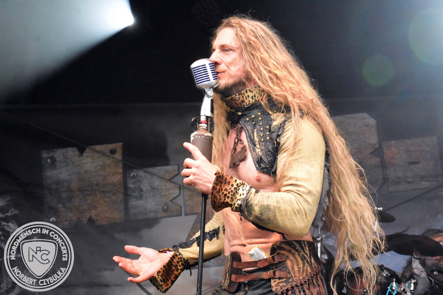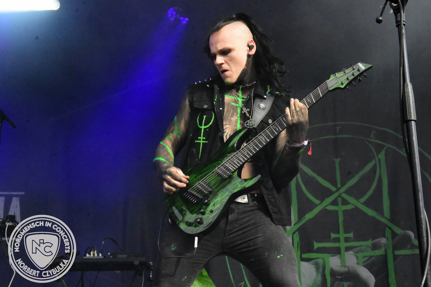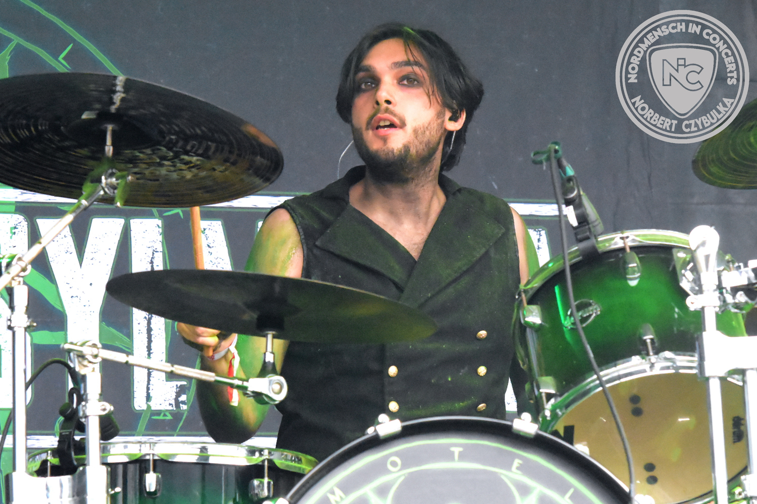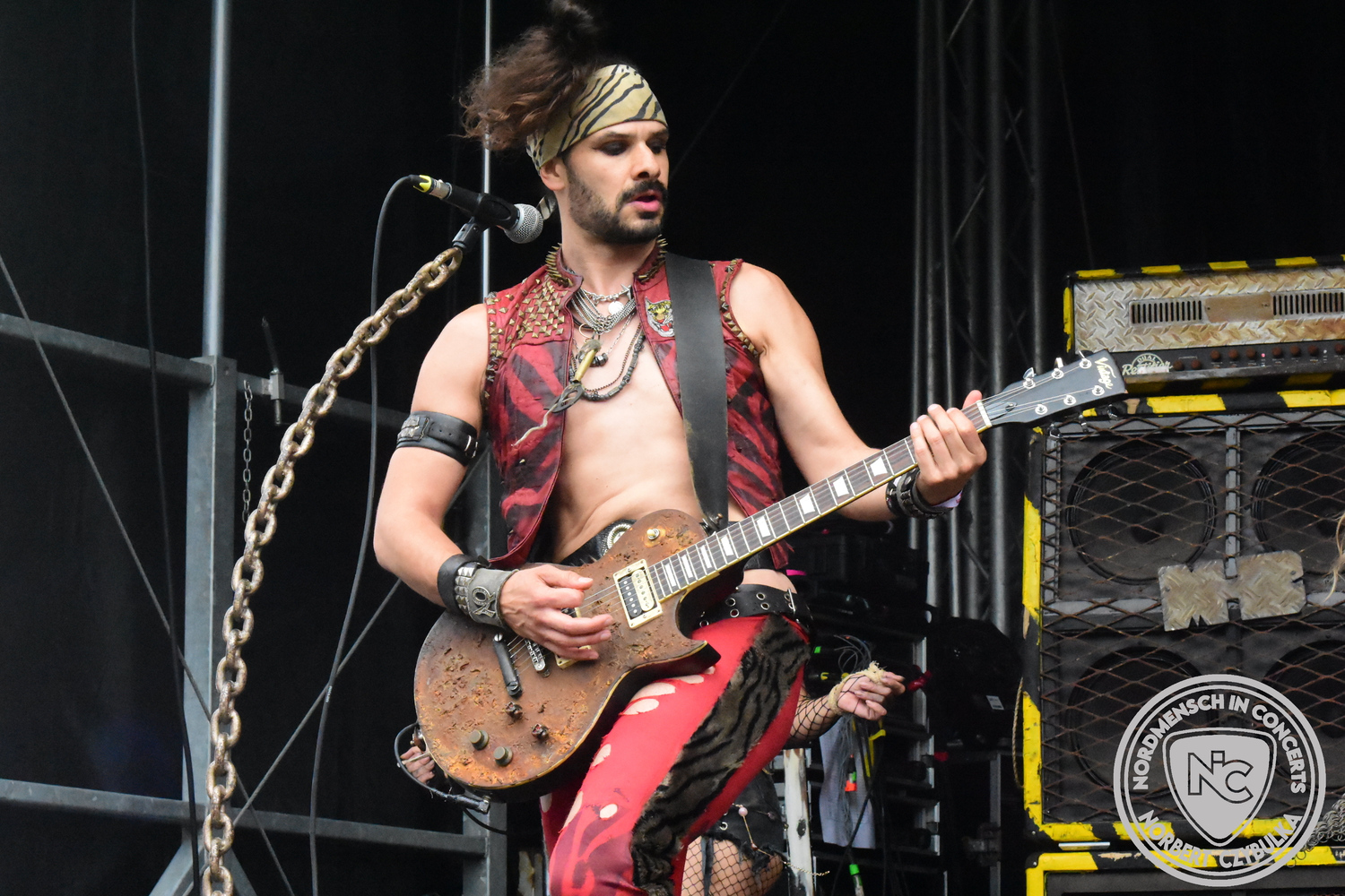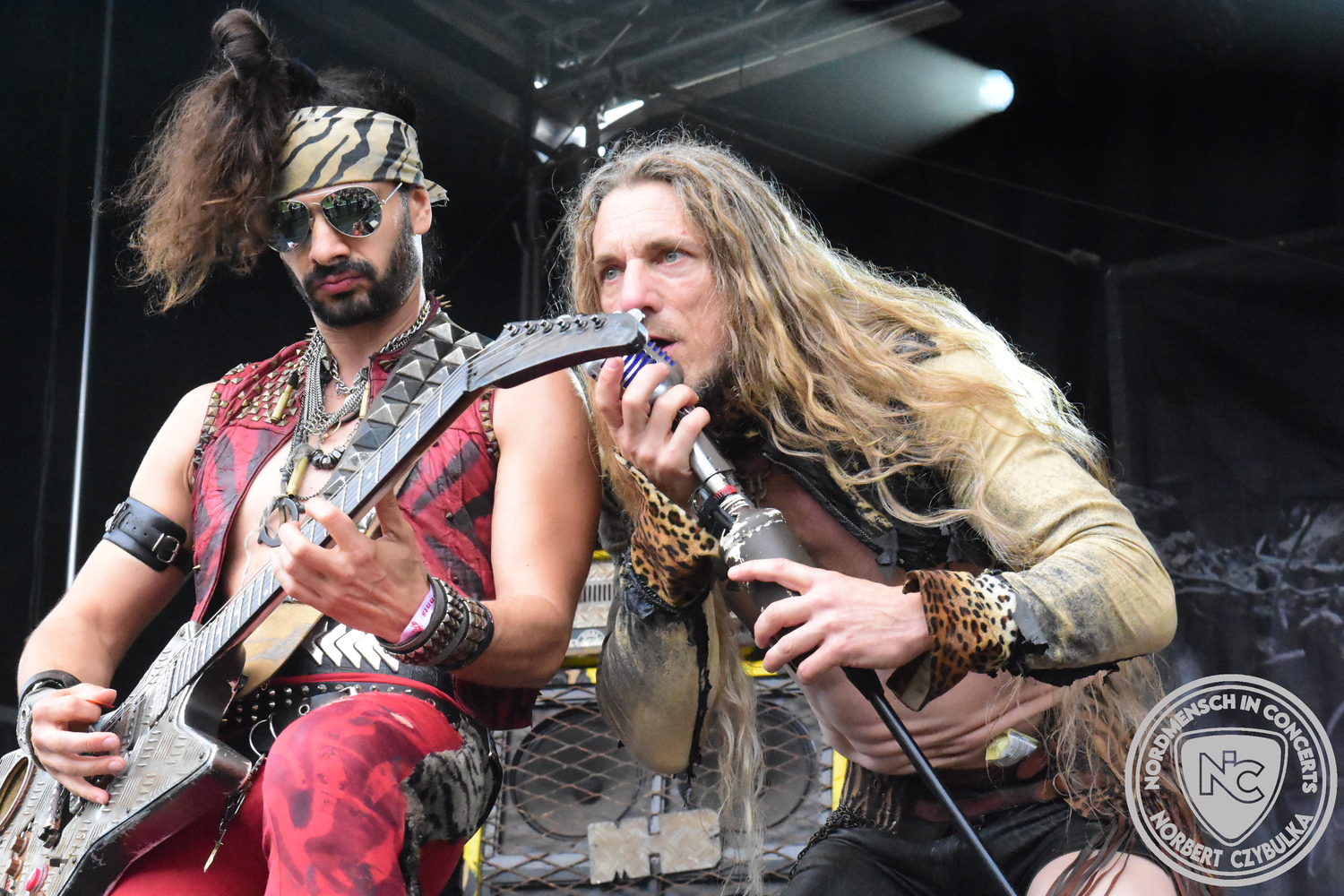 Es folgen die Essener Hardrocker von Formosa. Na gut, auch ihr Sänger ist manchmal ein Paradiesvogel, der Schlagzeuger ist gelernter Bierbrauermeister und ihre Platten sind ausgesprochen gut. Den 17 Uhr Slot füllen Mystigma aus. Düsterer Gothic Rock- und Metal aus Osnabrück statt Hardrock aus Heide. Sie sind kurzfristig für Pay Pandora eingesprungen, die sich vor zwei Wochen aufgelöst haben. Danach folgt meine persönliche Entdeckung des Festivals. Mit Motel Transylvania, aus dem nördlichen Italien, steht eine junge Band auf der Bühne, die gerade auf vielen europäischen Festivals ordentlich abräumt. Sie sind eine Industrial Metal Band und feiern mit ihren ersten beiden Scheiben große Erfolge in der Szene. Besonders abgefeiert hat die Menge den Song „Children Of The Dark“, den sie zu Ehren des morgigen Headliners Mono Inc. performen. Allerdings mussten sie auch ihren Hit „Generation Lost“ als Zugabe noch einmal wiederholen.