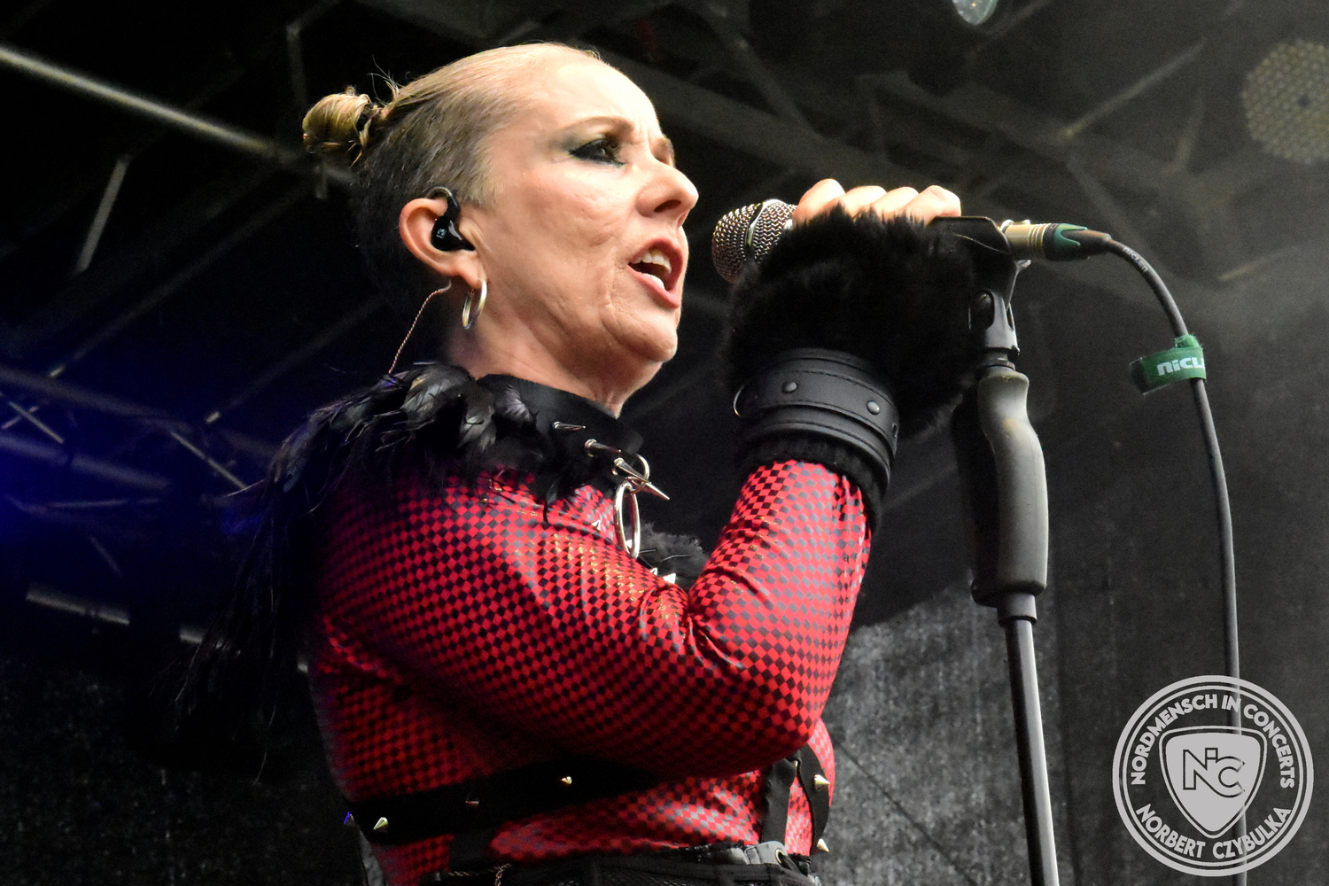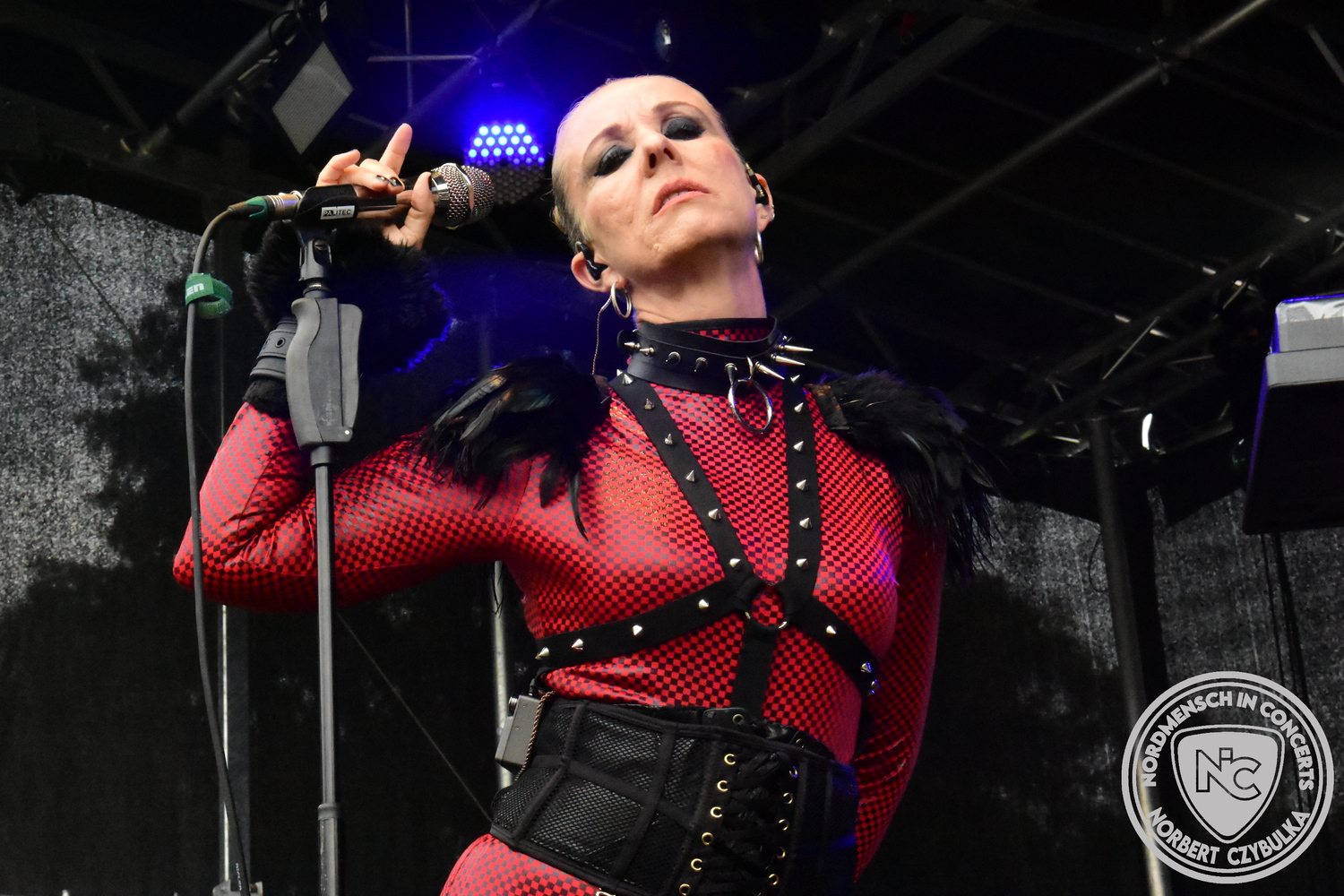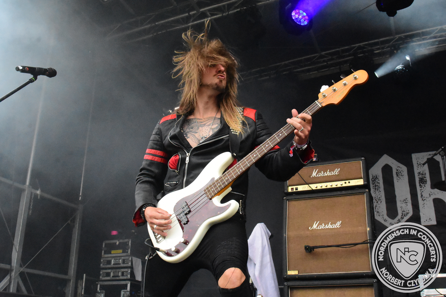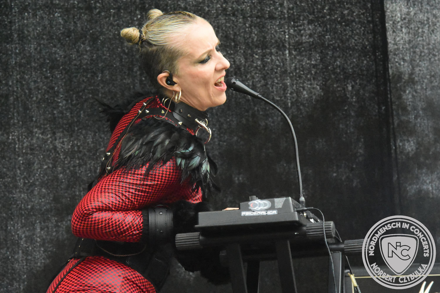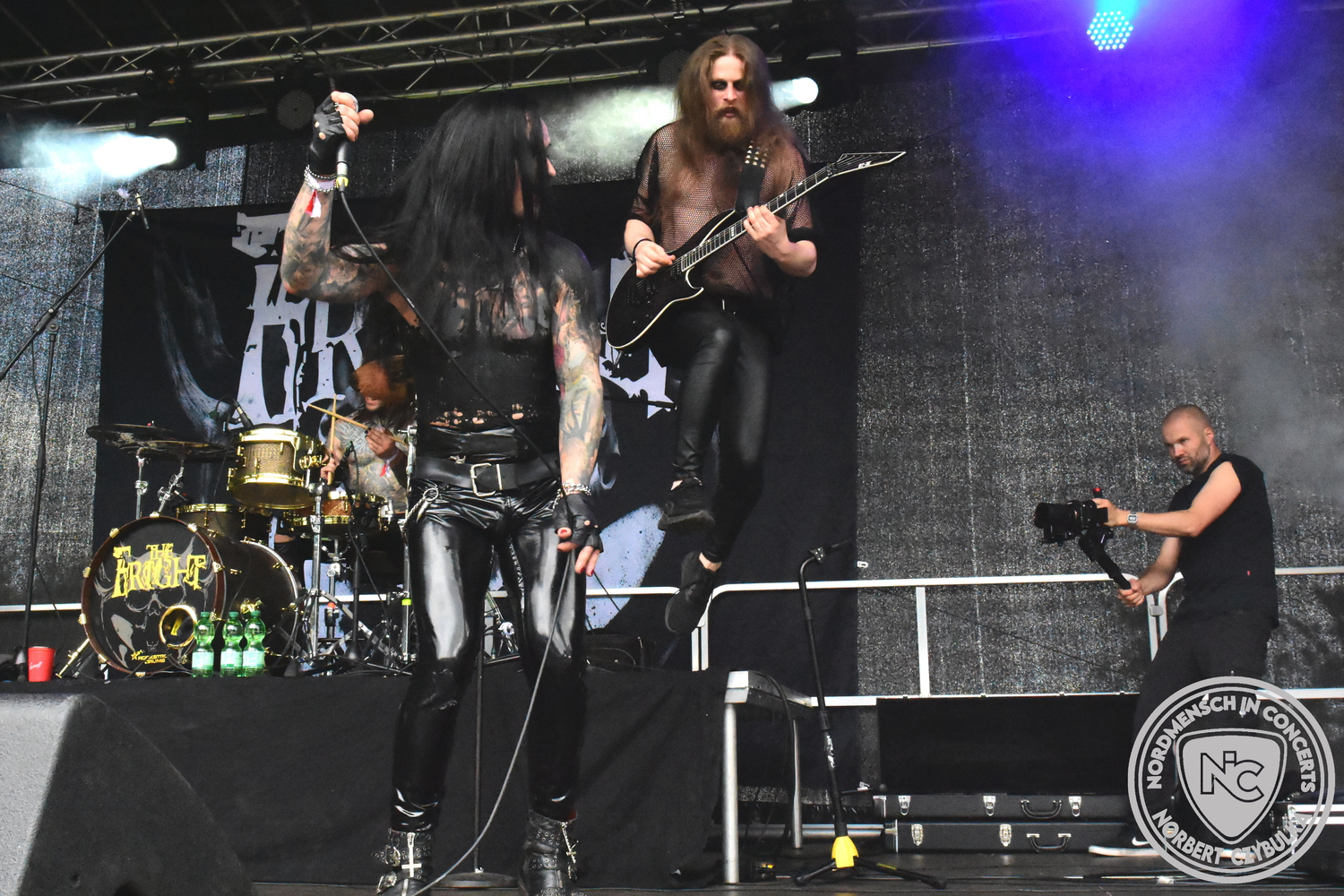 Es folgen die Essener Hardrocker von Formosa. Na gut, auch ihr Sänger ist manchmal ein Paradiesvogel, der Schlagzeuger ist gelernter Bierbrauermeister und ihre Platten sind ausgesprochen gut. Den 17 Uhr Slot füllen Mystigma aus. Düsterer Gothic Rock- und Metal aus Osnabrück statt Hardrock aus Heide. Sie sind kurzfristig für Pay Pandora eingesprungen, die sich vor zwei Wochen aufgelöst haben. Danach folgt meine persönliche Entdeckung des Festivals. Mit Motel Transylvania, aus dem nördlichen Italien, steht eine junge Band auf der Bühne, die gerade auf vielen europäischen Festivals ordentlich abräumt. Sie sind eine Industrial Metal Band und feiern mit ihren ersten beiden Scheiben große Erfolge in der Szene. Besonders abgefeiert hat die Menge den Song „Children Of The Dark“, den sie zu Ehren des morgigen Headliners Mono Inc. performen. Allerdings mussten sie auch ihren Hit „Generation Lost“ als Zugabe noch einmal wiederholen.