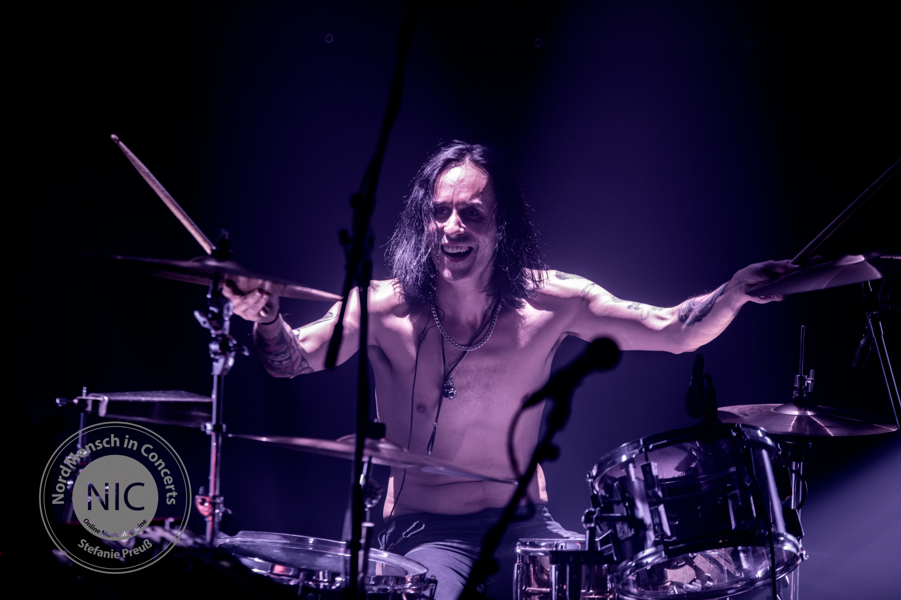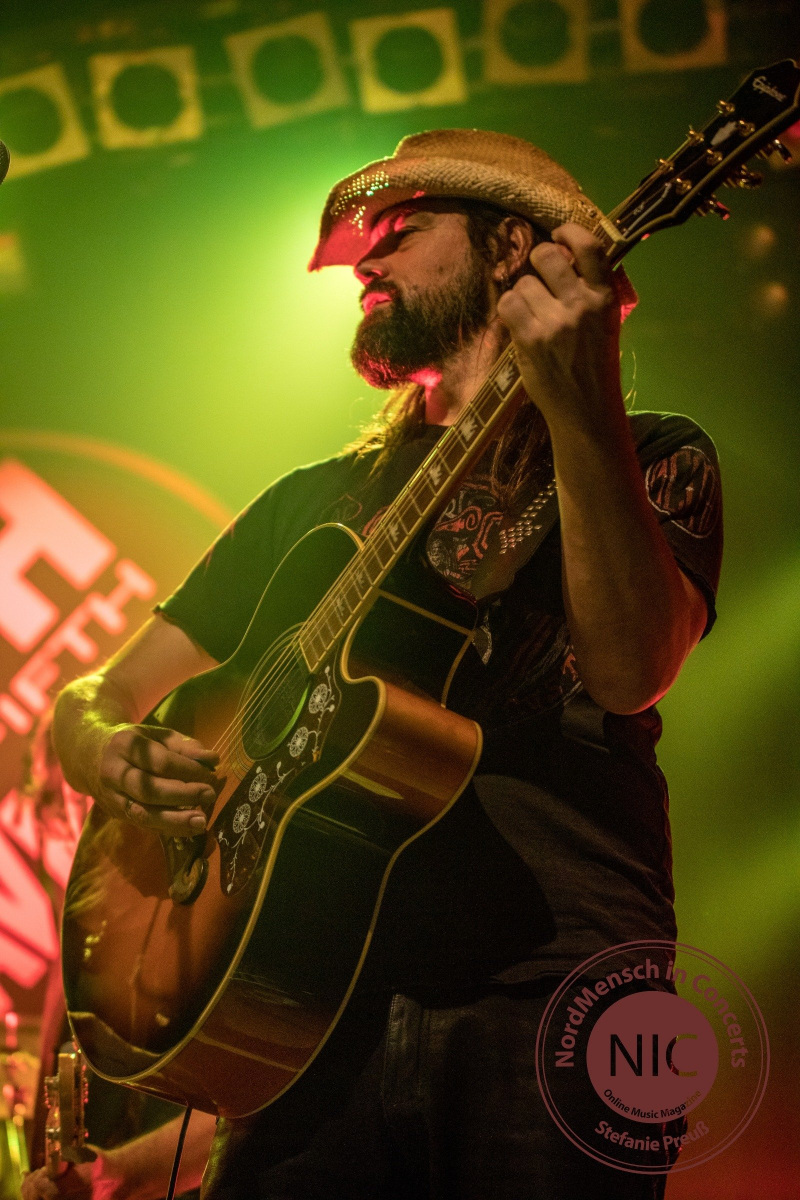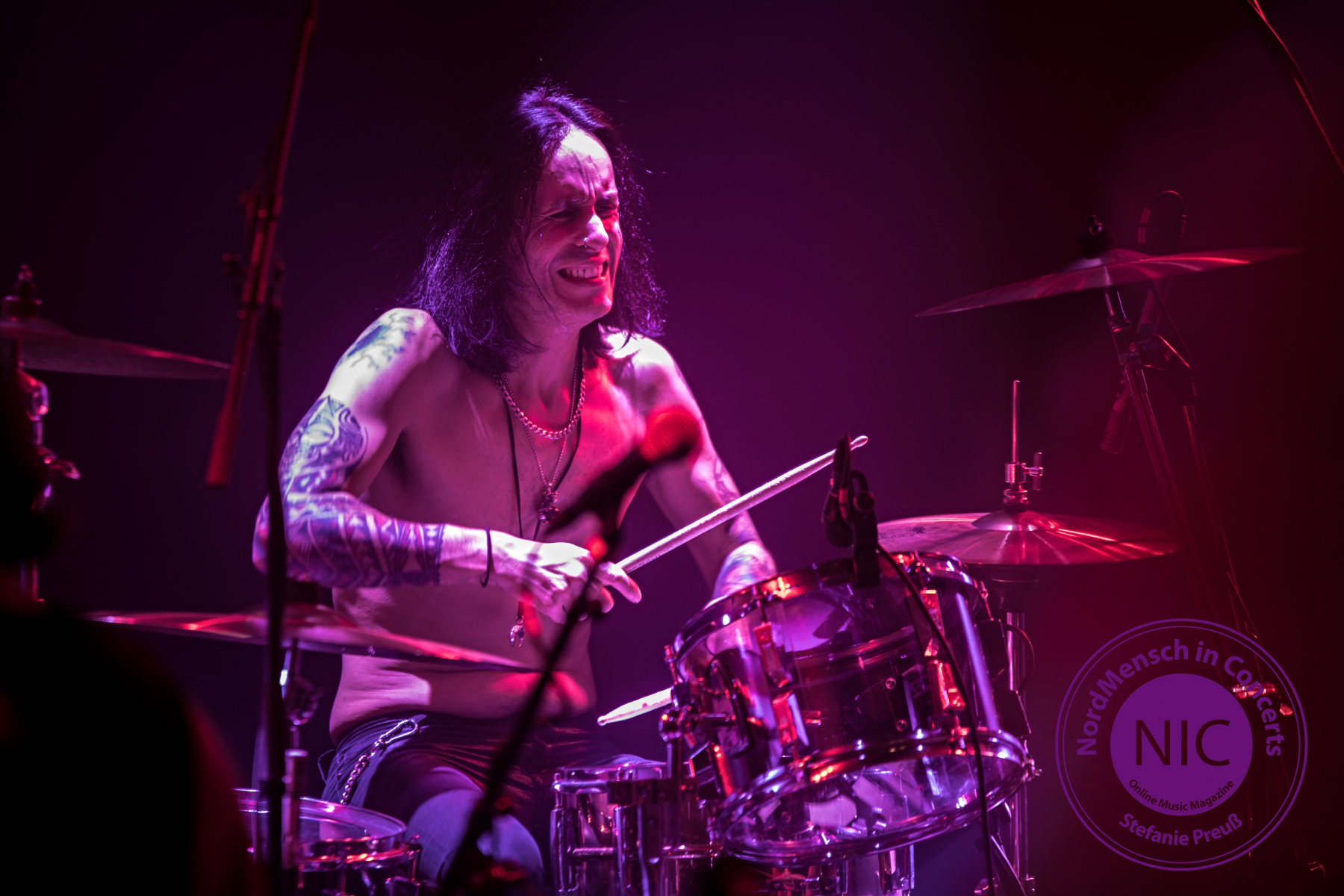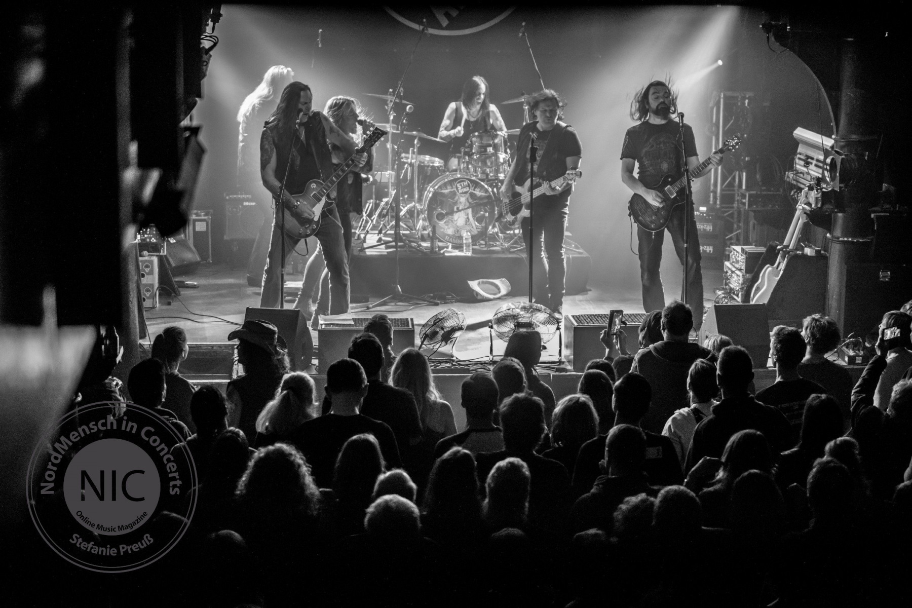 Um 21:15 Uhr war dann Stage-Time. Über 350 Besucher waren am vergangenen Freitag zugegen und man wartete schon sehnsüchtig auf die Jubilaren. Gegen 21:20 Uhr erklang dann ein kleines Intro und mit diesem erschienen Ansas, Konrad, Adrian, Moyano, Marc und Knobel auf der Bühne. Eine herzliche Begrüßung Richtung Publikum und die Show ging in die Vollen. Schon lange hatte ich nicht mehr solch eine Stimmung, solch eine Freude und solch eine Nähe zwischen Band und Publikum gespürt. Aber auch ein wenig Wehmut spielte in den Abend mit ein. Dieses Jubiläumskonzert sollte auch gleichzeitig das Abschiedskonzert des Gitarristen Konrad gewesen sein. Zwei Jahre unterstützte er die Hamburger Rockband. Umso mehr wurde er natürlich auch an diesem Abend – sowohl von Bandseite her als auch von den Gästen – ordentlich gefeiert. Hier und da spendierte er kleine schöne Solis und in den Pupillen der hübschen jungen Mädels vor der Bühne konnte man kleine Herzen erkennen.