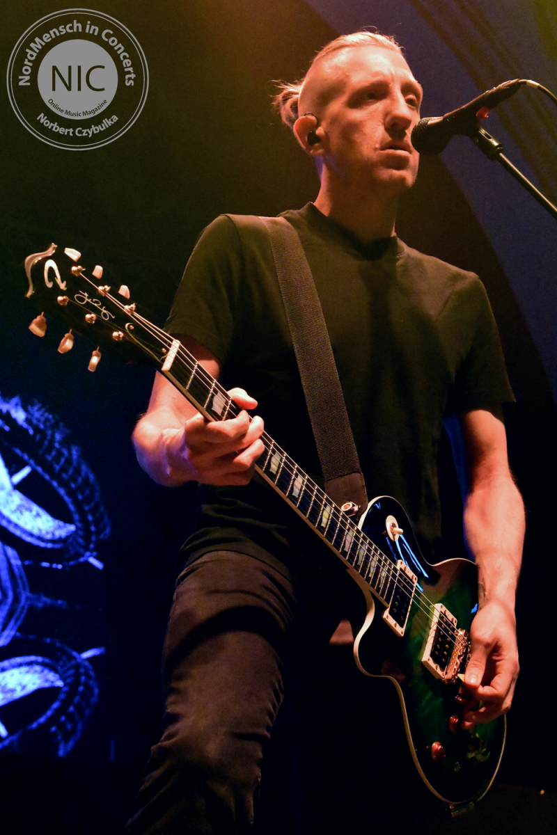 Epica ist eigentlich für ihre aufwändige Pyro-Show bekannt. Auf dieser gemeinsamen Tour verzichten sie jedoch darauf. Aufwändige Lichtprojektionen gleichen das jedoch aus. Promoted werden die Alben „Omega“ aus 2021 sowie ihr neuestes Werk „The Alchemy Project“ aus dem vergangenen Jahr. Die Niederländer überzeugen seit bald zwei Dekaden mit ihrem symphonischen Progressive- und Power-Metal. Wer die Band um Sängerin und Frontfrau Simone Simons schon einmal live erlebt hat, weiß, mit welcher Wucht Epica ihre überaus komplexen Kompositionen live auf die Bühne zaubern. Nach dem Intro „Alpha – Anteludium“ ist „Abyss Of Time – Countdown To Singularity der heutige Opener und kommt vom achten Studioalbum „Omega. Frontfrau Simone Simons ist stimmlich voll da. Die sechs Musiker räumen mächtig ab. Der Sound ist hervorragend. Das Programm beinhaltet einen Querschnitt aus dem bisherigen Schaffen. Simone kommuniziert größtenteils auf allerbestem Deutsch mit den Fans. Zu „Code Of Life ruft sie die Menge auf, ihr mit Feuerzeugen und Handylichtern zu leuchten. Beim folgenden „Cry For The Moon“ läuft der Text in Karaokemanier zum Mitsingen auf der Digiwall mit.