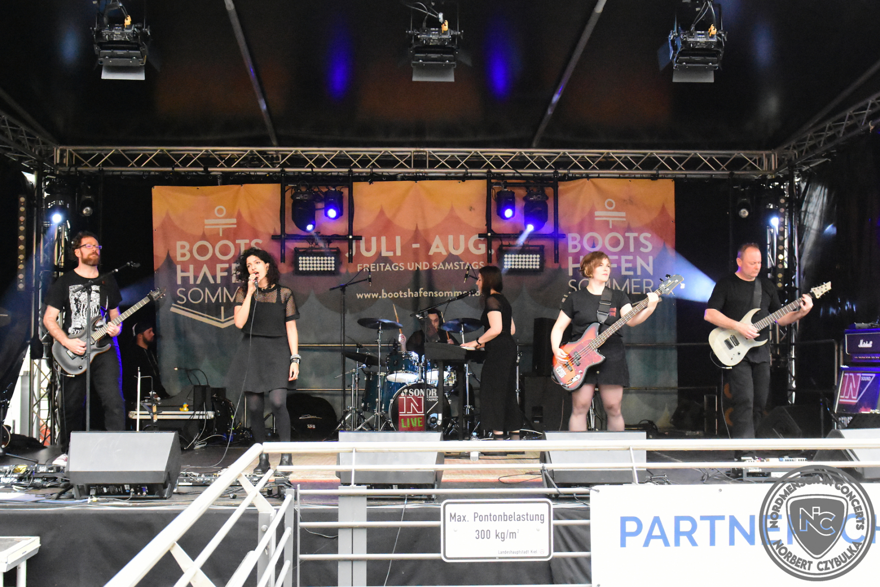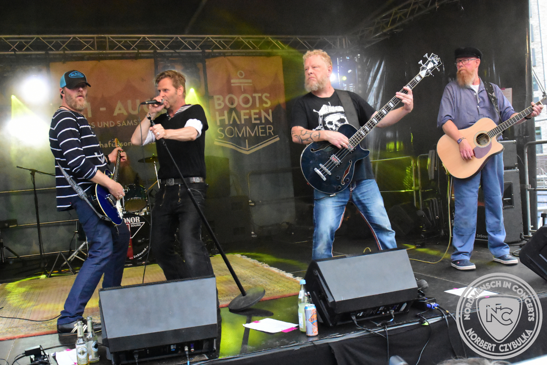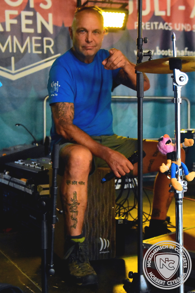 Dann wird es richtig voll am Bootshafen, denn die Kieler Urgesteine Wolf Barsch mit ihrem maritimen Rock stehen auf der Bühne. Konzerte über zwei Stunden sind bei ihnen keine Seltenheit, heute müssen sie sich auf 75 Minuten begrenzen. Natürlich fordern die Besucher Zugaben, aber der Timeslot ist vorgegeben.