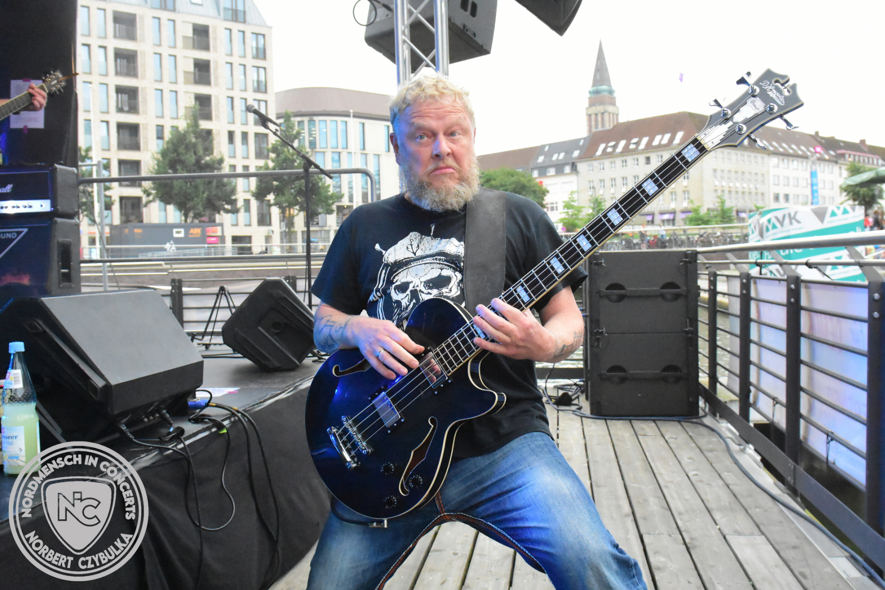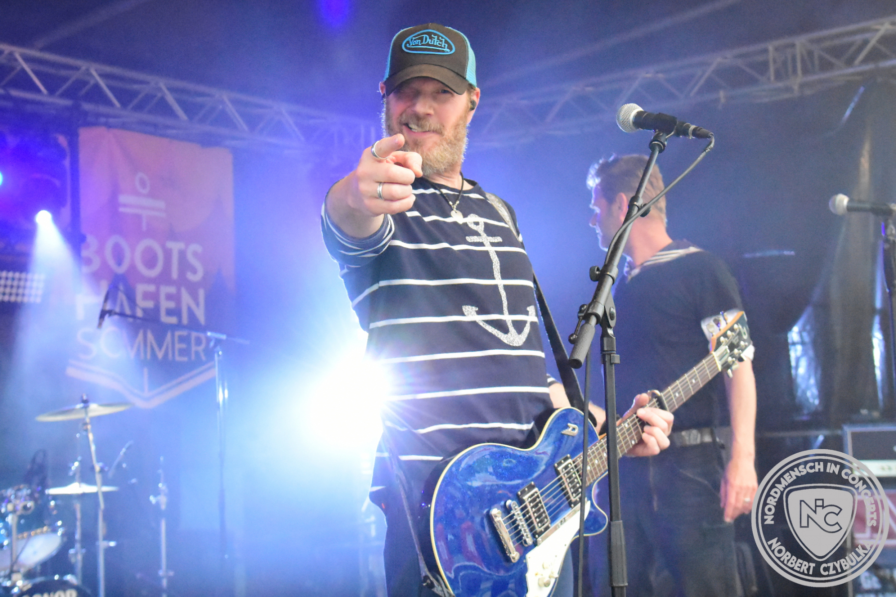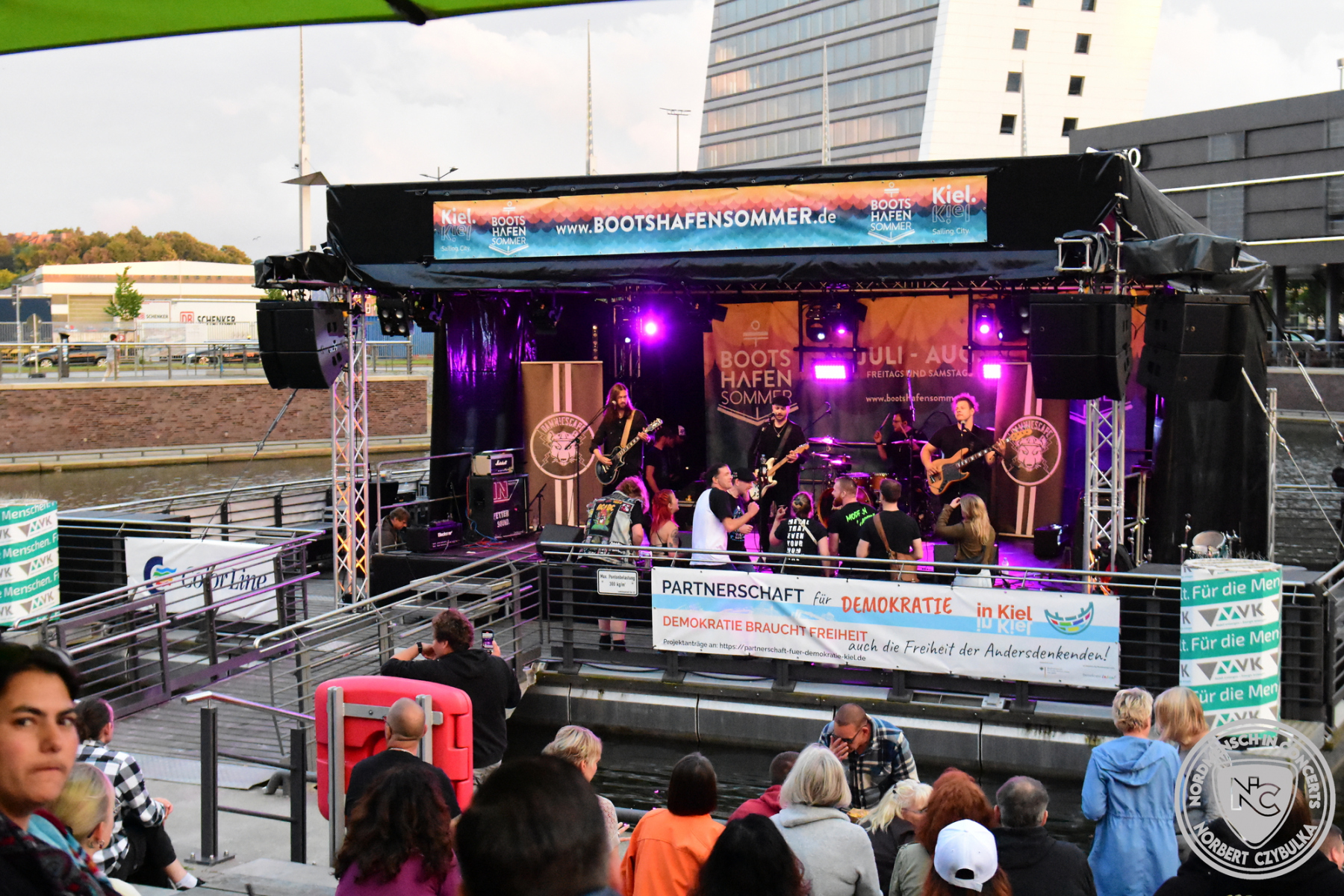 Dann wird es richtig voll am Bootshafen, denn die Kieler Urgesteine Wolf Barsch mit ihrem maritimen Rock stehen auf der Bühne. Konzerte über zwei Stunden sind bei ihnen keine Seltenheit, heute müssen sie sich auf 75 Minuten begrenzen. Natürlich fordern die Besucher Zugaben, aber der Timeslot ist vorgegeben.