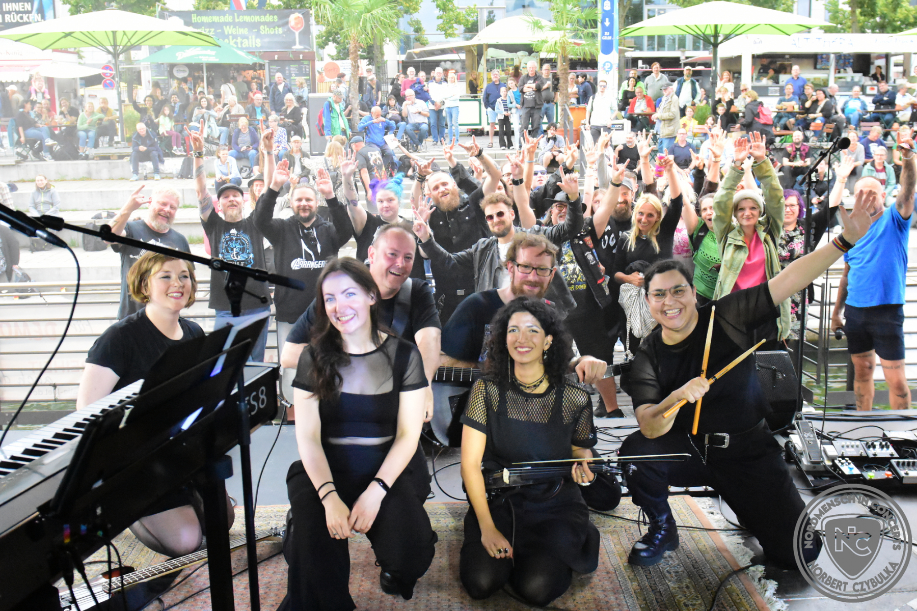 Dann wird es düster und lauter. Alleviated (Gothic/Alternative Metal), ebenfalls eine Band aus Kiel und Hamburg bewerben sich mit „Musik für Menschen, die sich zwischen Riffs und Melodien nicht entscheiden wollen. Mit zwei Sängerinnen, Geige und Klavier, Löchern in den Chucks, irgendwo zwischen Melancholie, Alles-kaputt-schlagen und auf dem Rückweg Pommes holen.“ nicht ganz ernst, aber im Grunde genommen trifft die Beschreibung zu. Sie spielen einen Metal zwischen Mainstream und Experiment.
