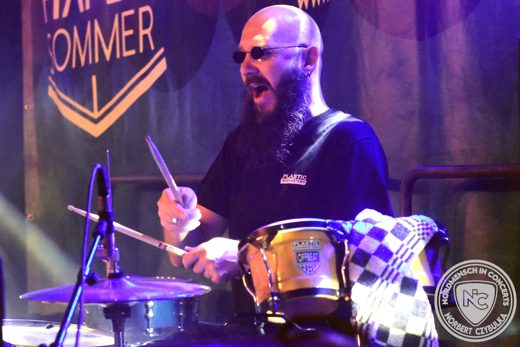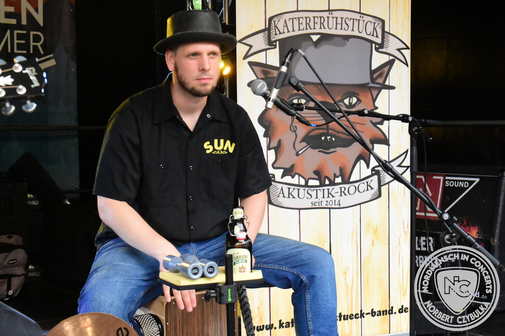 Moderator Maschine Nitrox tauscht nach der nächsten Ansage sein blaues Crew-Shirt gegen zivile Kleidung, denn nun sitzt er bei dem Kieler Trio Acoustic Guerillas am Schlagwerk.