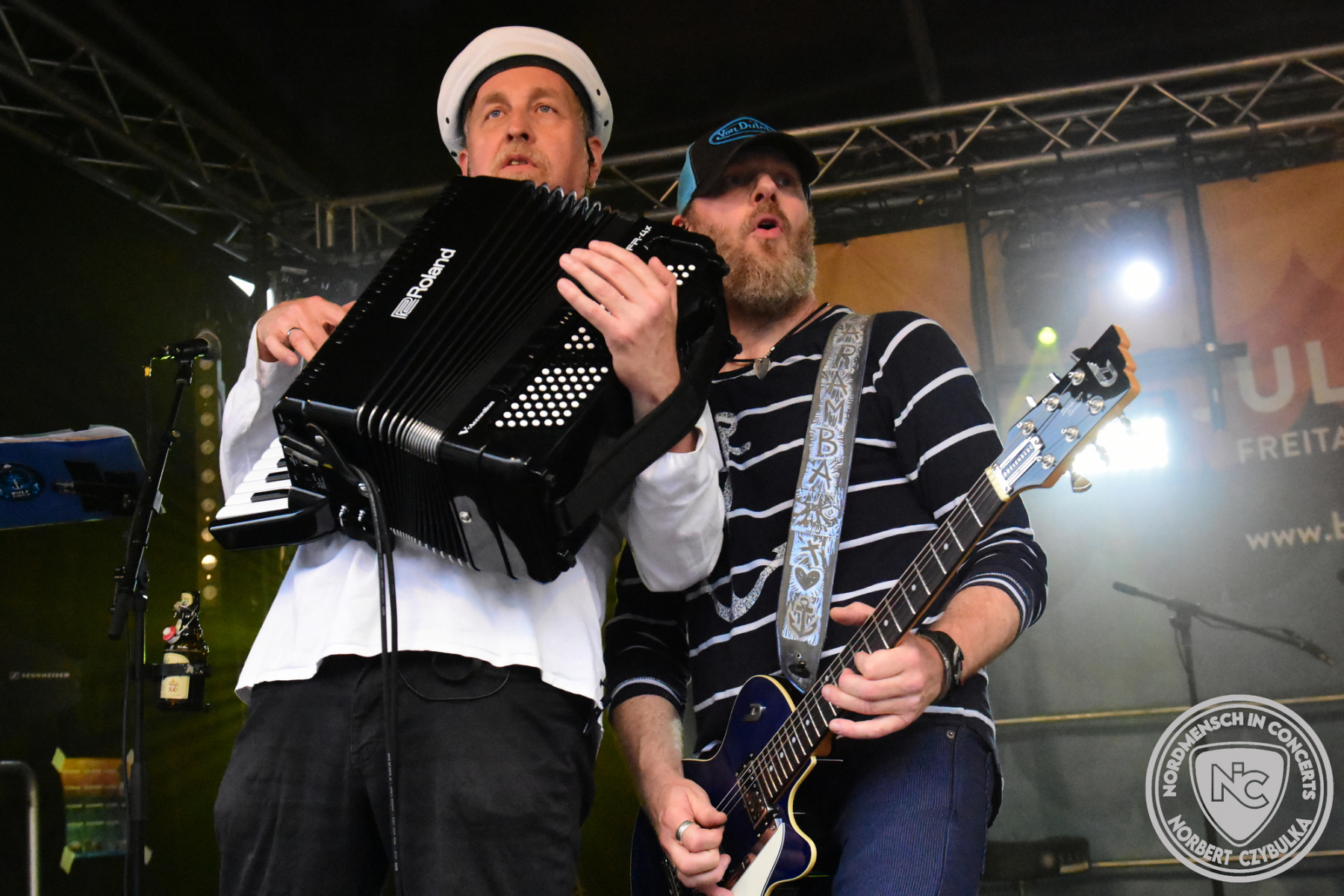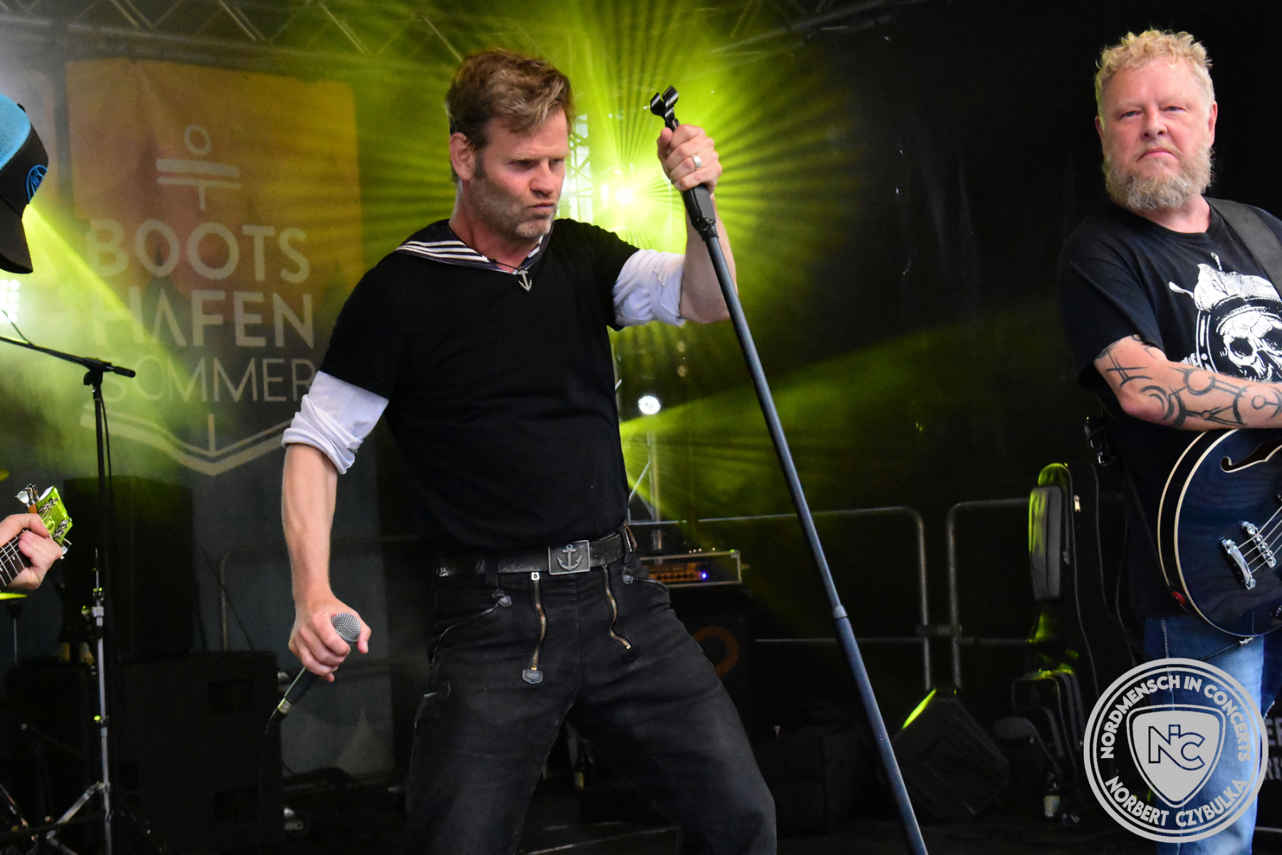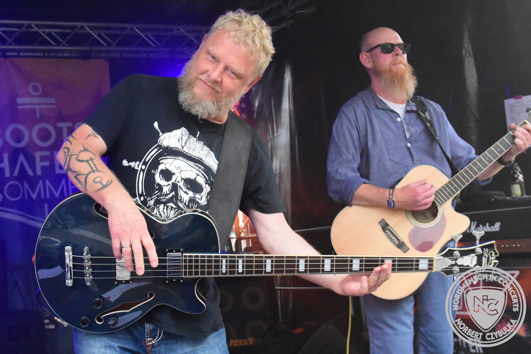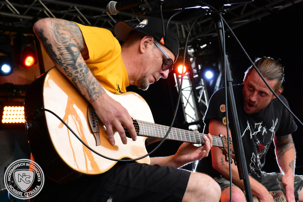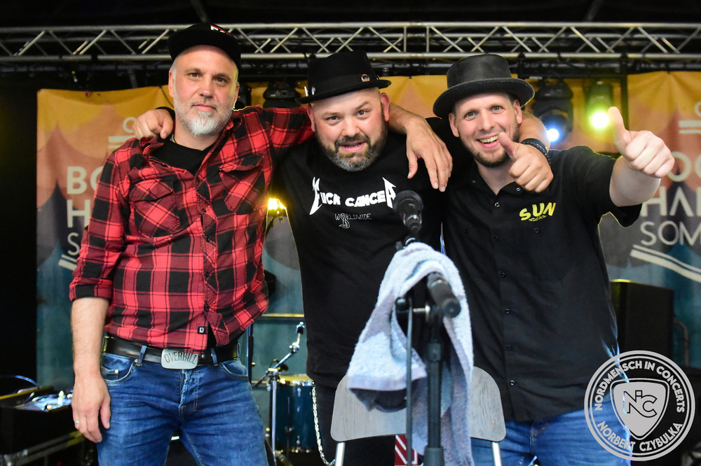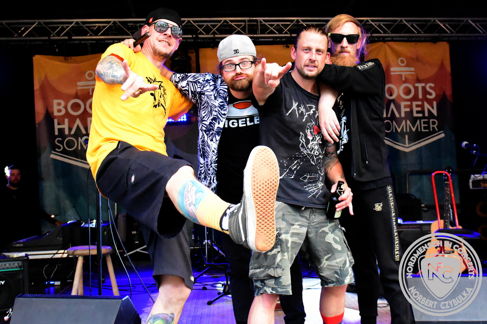 Nun wird es etwas lauter am Bootshafen. Mit den Ocean Criminals steht zuerst eine Pop-Punk Truppe auf der Bühne, die seit sechs Jahren sich eine eingeschworene Fangemeinde erspielt hat. Mit AK wird dann die „Äußerste Kraft“ in punkto Hard Rock zelebriert. Den Abriss des Abends jedoch liefern wie nahezu in jedem Jahr Das Beben ab. Die einen sagen Hard Rock, die anderen Punk. Begeistern tun sie auf jedem Fall. Auch hier muss Moderator Maschine Nitrox wieder das blaue Moderatorenshirt ausziehen, denn er ist hier der ungezähmte Frontmann der Band. Einen Personalwechsel vollziehen die vier direkt auf der Bühne. Arne „Razz Bazz“ übergibt nach zehn Jahren den Bass wieder an seinen Vorgänger Mad Jazz Morales zurück.
