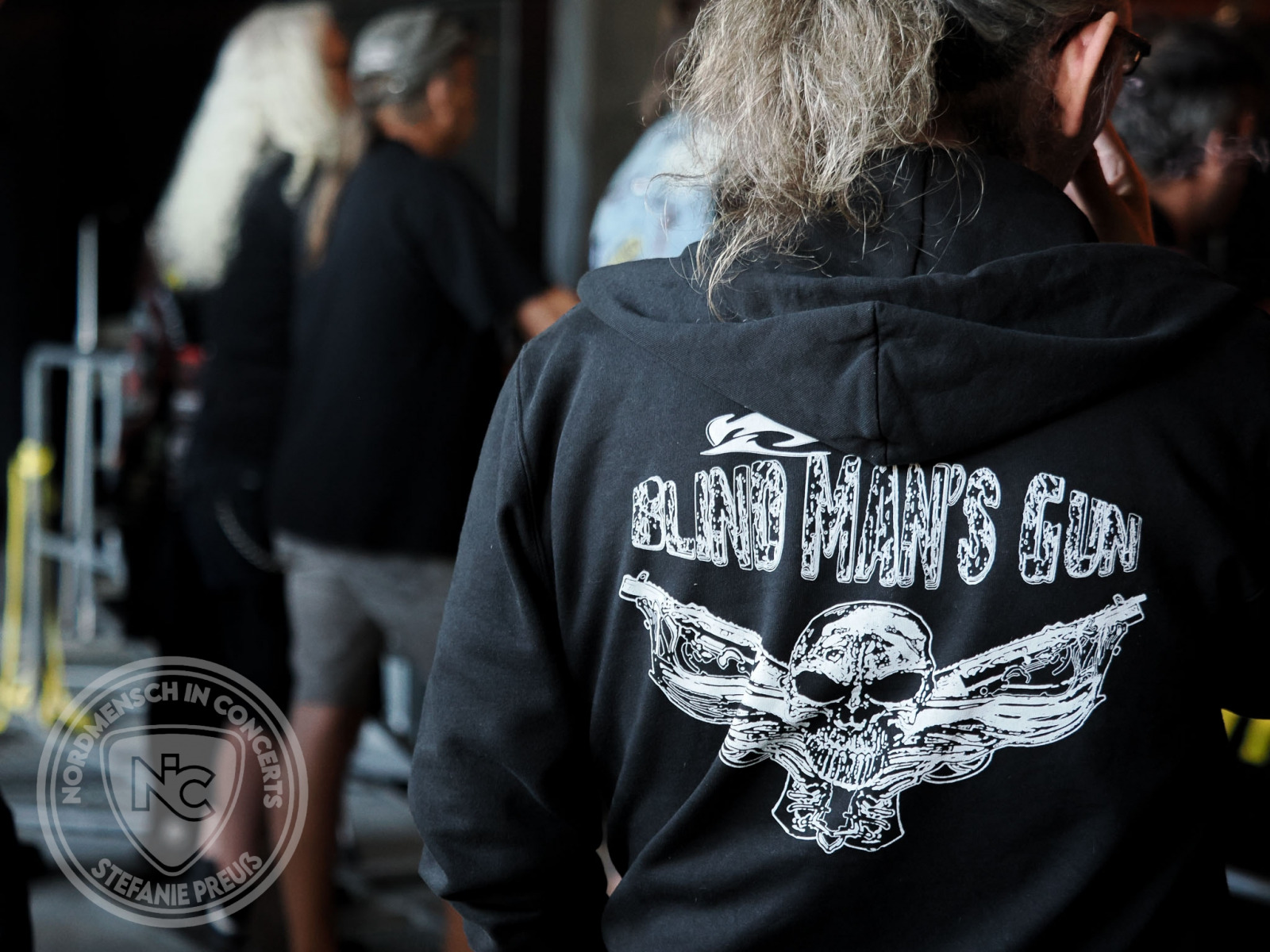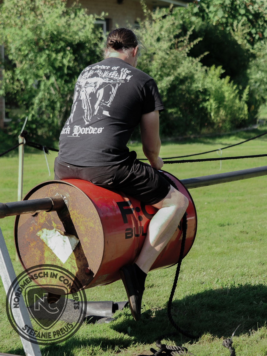 Während nun gut eine halbe Stunde Umbauzeit beginnt und der Auftritt für BLIND MAN’S GUN vorbereitet wird, schauen wir uns einmal auf dem kleinen Gelände um. Zwischen Campingwiese und Festivalbereich ist ein kleiner VIP-Bereich zu finden. Die räumige Gartenhütte des Eigentümers und seiner Familie, dient an diesem Tage dazu Bands, Crew und auch uns zu „beherbergen“ und köstlich und liebevoll zu bewirten. Der Außenbereich spendet Schatten und gemütliche Sitzecken und am Abend schenken die F:O:A Feuertonnen noch zusätzliche Hygge. Direkt gegenüber kann man seine Balance-Fähigkeiten unter Beweis stellen und probieren, ob man im Sattel der „Rodeo-Tonne“ bleibt. Ein netter Spaßktor für Groß und Klein.