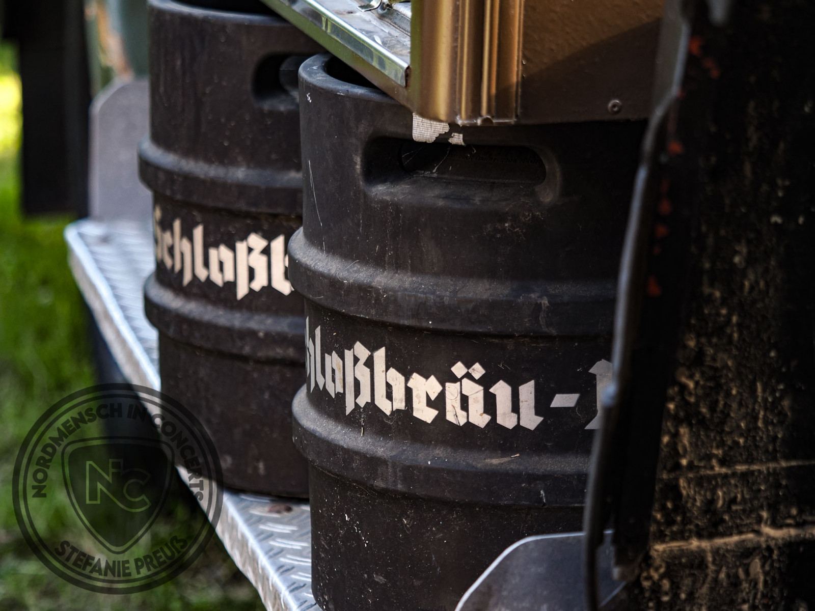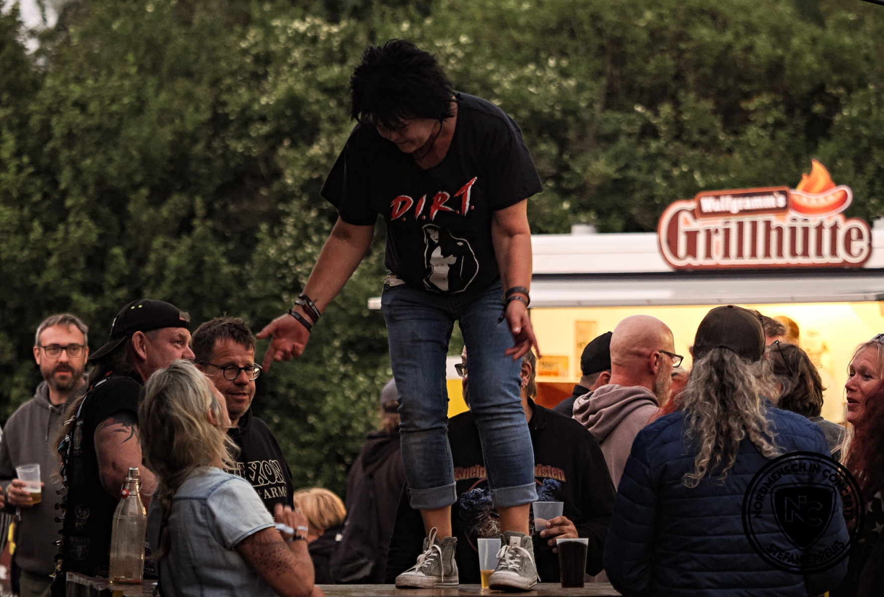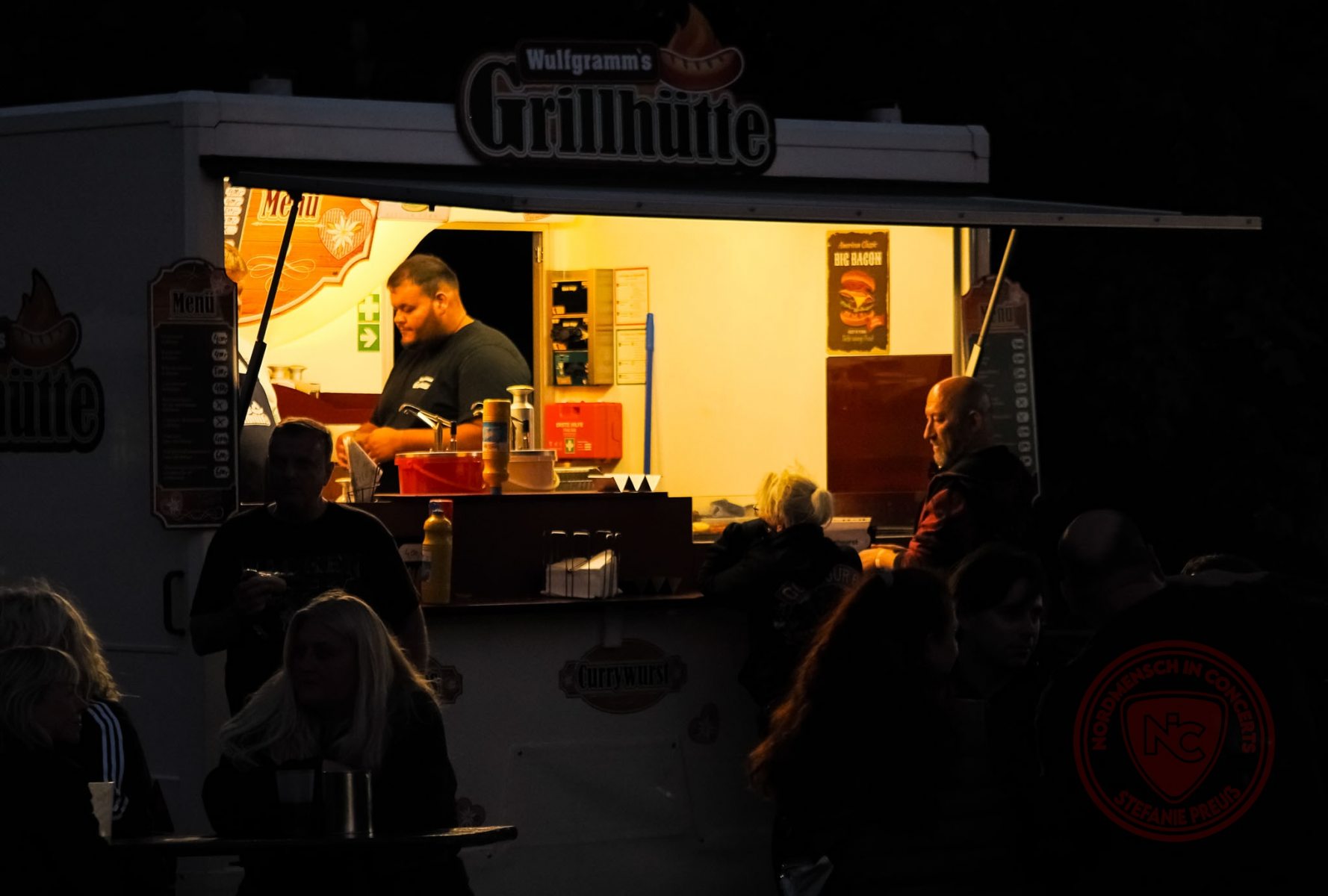 Weiter finden wir einen kleinen Merch-Stand, eine fahrbare Tätowierstube, einen Imbisswagen mit Wurst, Pommes, Champignons uvm. Dann haben wir da noch den Bierstand und auch unser Freund Pierre Bade von Poser667 Productions hat sich mit seinen Metal-Pins und Patches bestens platziert. Also: Alles da, was man braucht. Schon das herzliche Willkommen und die familiäre Aufnahme als auch die vielen bekannten Gesichter, die man Ewigkeiten nicht gesehen hatte, stimmten uns wohl und so fühlten wir uns auch. SAUWOHL!