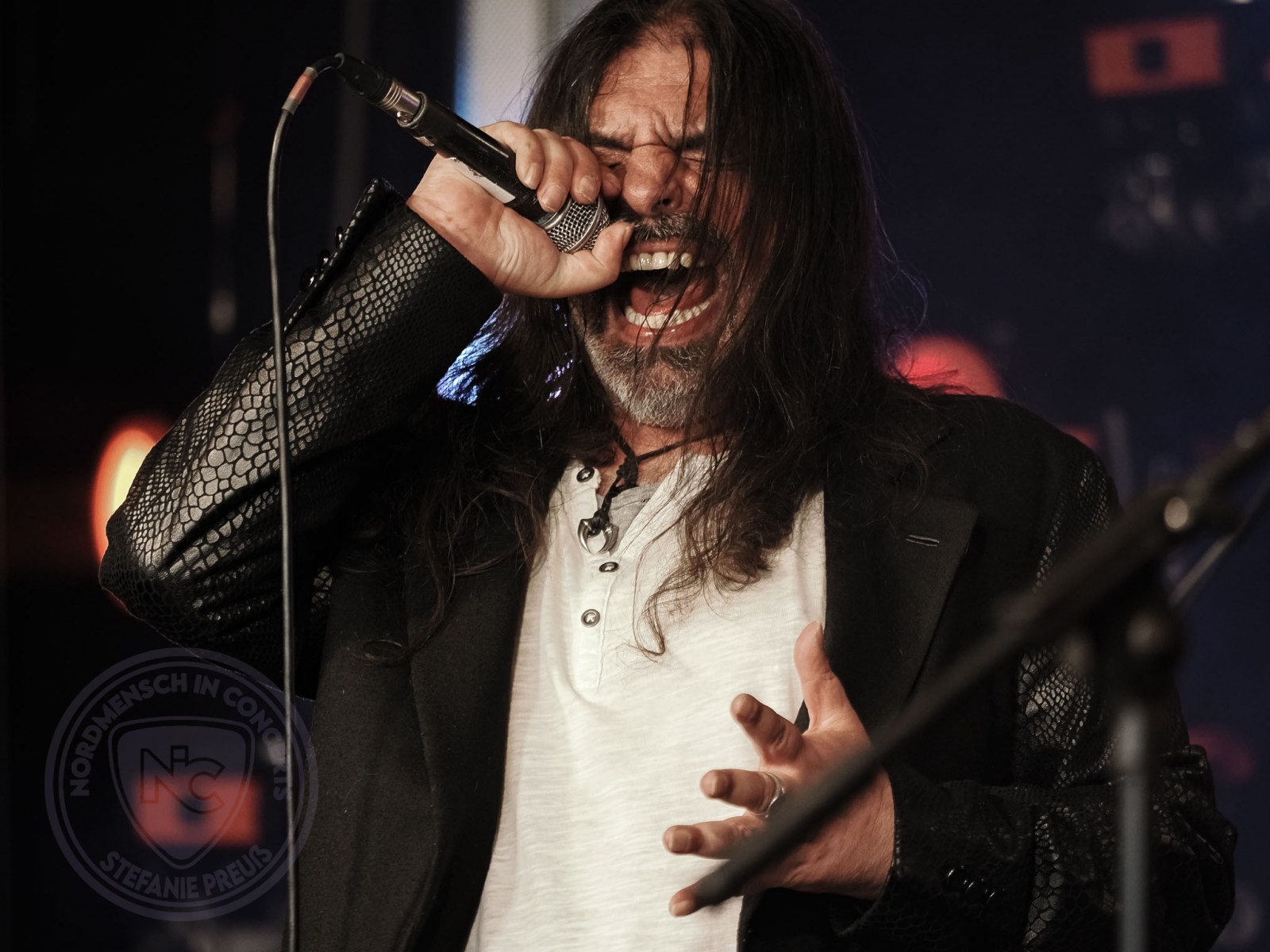 TYSON stehen somit erst mit einer Verzögerung von gut 45 Minuten „on stage“ und bitten das Publikum nach der Unterbrechung zurück zur Bühne. Beste Genesungswünsche gehen noch raus an die verunfallte Dame und dann kann das Moshen auch gleich wieder losgehen. Mal ehrlich, wer kennt die Kieler Thrasher bitte noch nicht – und wenn nicht, wird es Zeit! Vier talentierte Musiker, die jetzt die Regler wieder etwas aufdrehen und bei denen die Doublebase ordentlich durchgetreten wird und die Nackenmuskulatur schon einmal bei der Physio anruft. Frontmann Kochi lässt ebenfalls durchblicken, dass derzeit an einem neuen Album geschraubt wird und es da in naher Zukunft wieder etwas von den „Fäusten“ zu hören gibt. Da sind wir gespannt und bis dahin gibt es für die Besucher noch einige Helikopter-Haar-Runden und die Meute vor der Bühne ist für die weiteren beiden Acts ordentlich auf Temperatur.