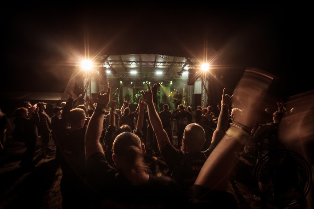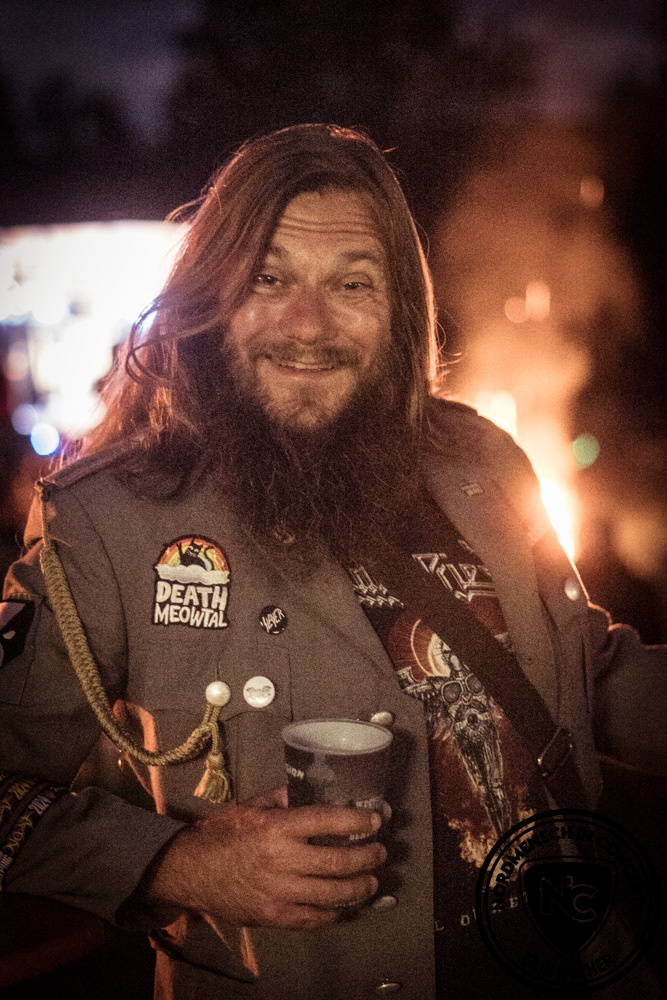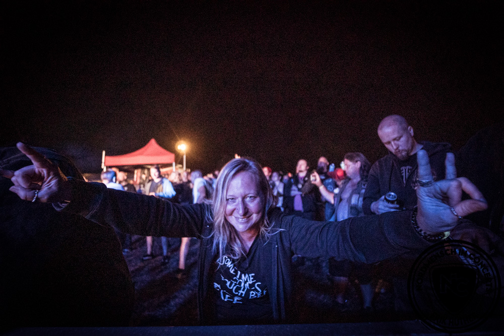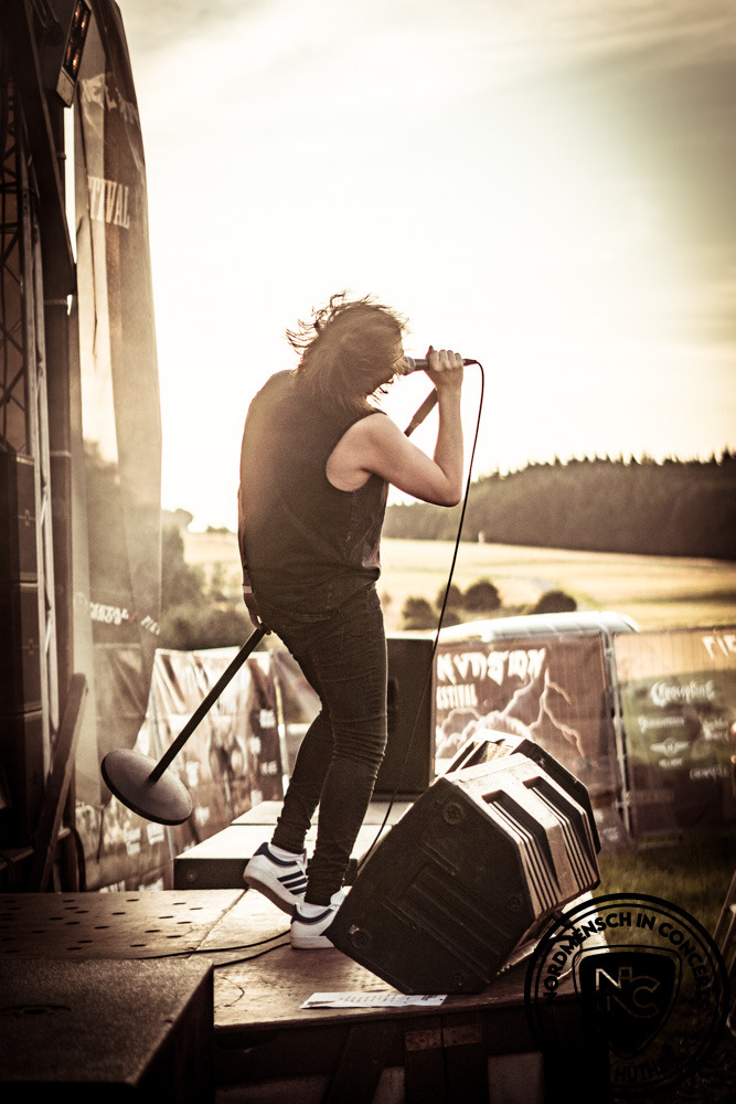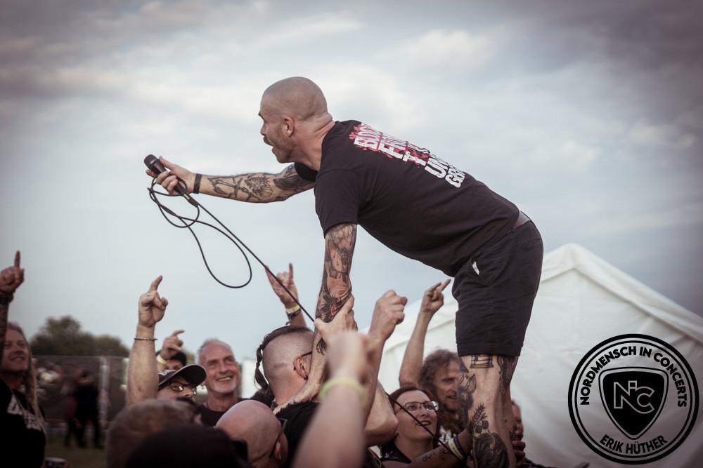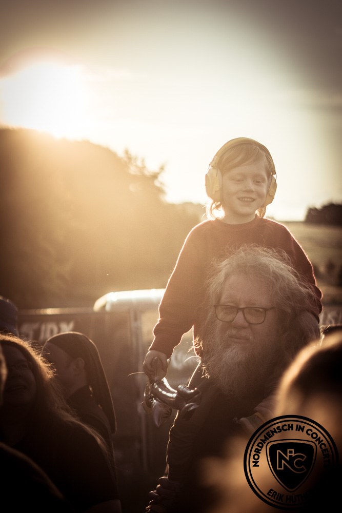 Inzwischen mit einem Kaltgetränk bewaffnet, traf ich tatsächlich auch die ersten Bekanntys und verbabbelte mich auf einer der mitten im Infield aufgestellten Bänke, rund um die Feuerstelle. Da das ganze auf einer leicht abschüssigen Wiese stattfindet und die Bühne am Fuße derselben steht, hat man wie in einem natürlichen Amphitheater von überall auf dem Gelände einen hervorragenden Blick auf die Bühne, auch wenn der Sound auf den Bereich direkt davor optimiert ist. Dort spielten inzwischen Hereafter aus Bielefeld, die mit ihrem New Metal-Sound und cleanen Frauenvocals und männlichem Geshoute bereits eine erkleckliche Crowd vor die Bühne zogen.