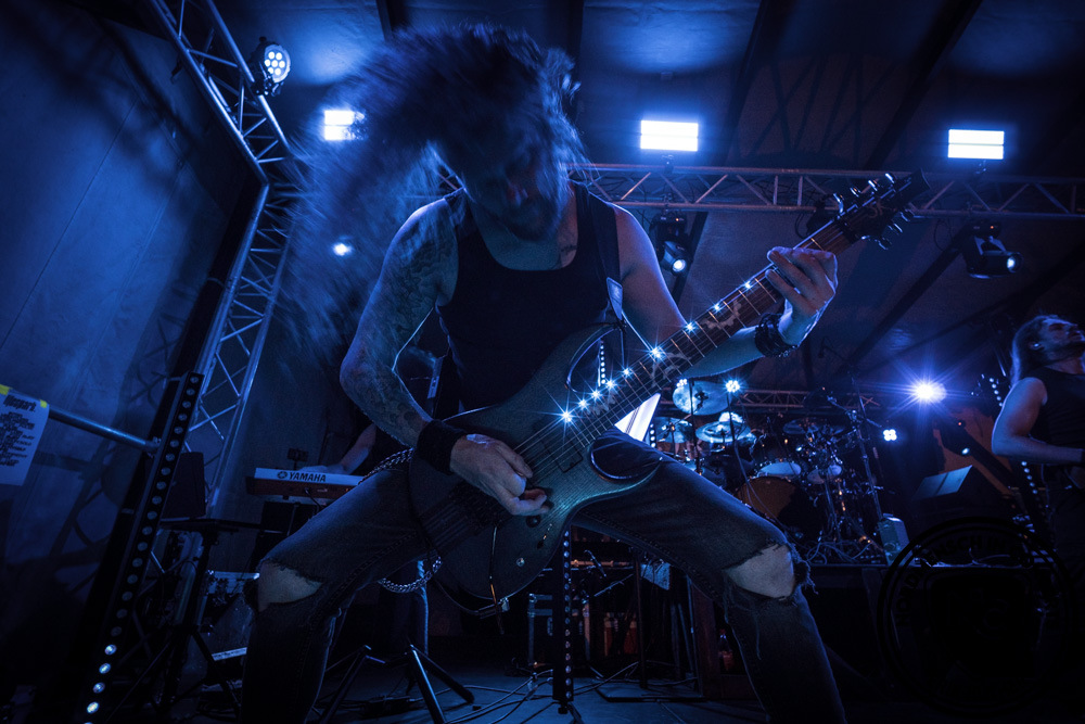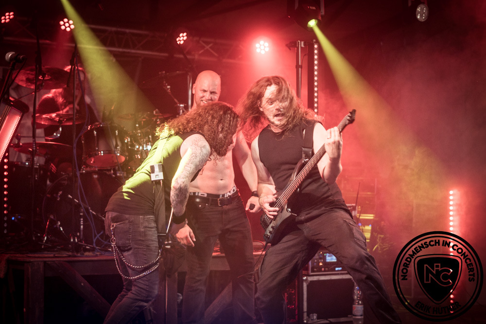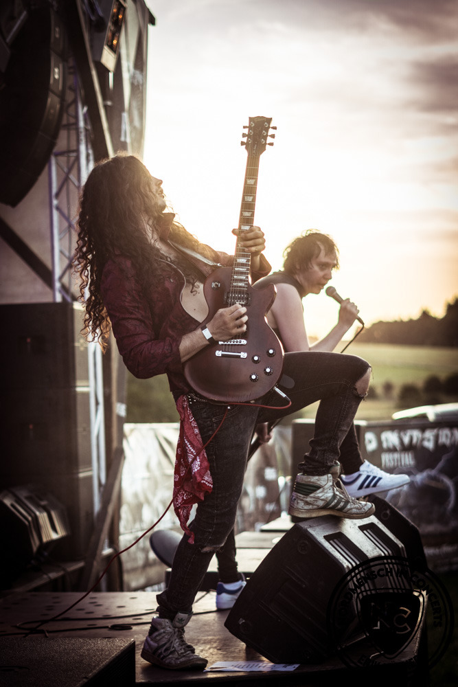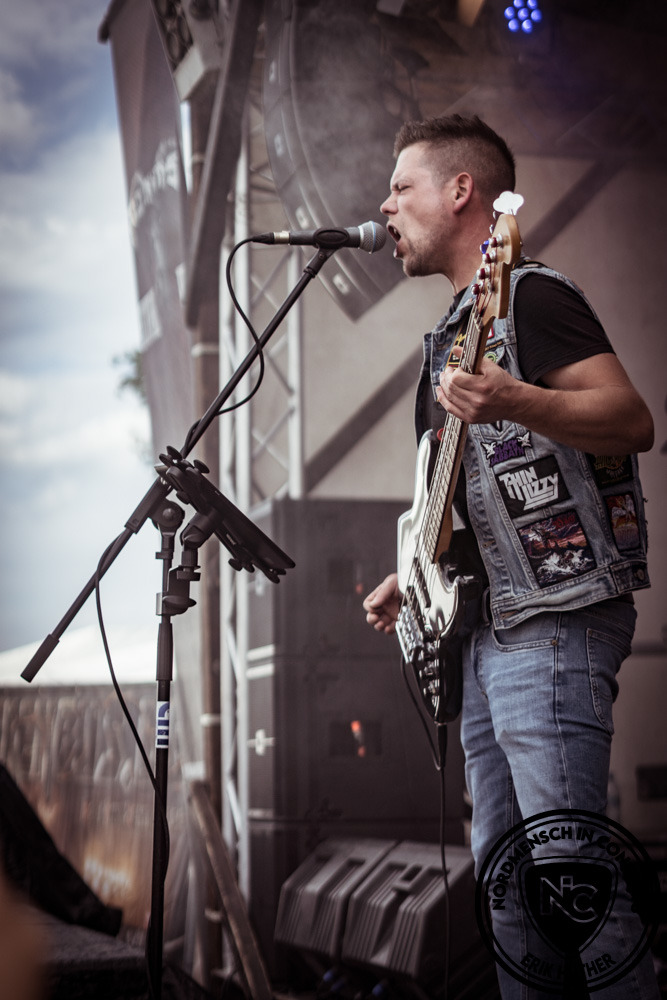 Ein relativ brachialer Stilwechsel kam mit Final Fortune aus Mayen, die sich selbst als „80’s Hard’n’Heavy“ bezeichnen, und das war im besten Sinne wahr, die Looks passten dazu, auch wenn sie ein wenig eklektisch zusammengewürfelt erschienen: Kutte und 80er-Badebux-Kombi beim Bassisten kontrastierten mit dem Sleaze Rock-Outfit des Gitarristen – insgesamt aber großer Spaß und definitv empfehlenswert! Dachte sich übrigens auch ein Nackedei, der sich nur mit Hut bekleidet auf die Bühne mogelte und mit der Band Party machte – leider war der Hut auf dem Kopf…