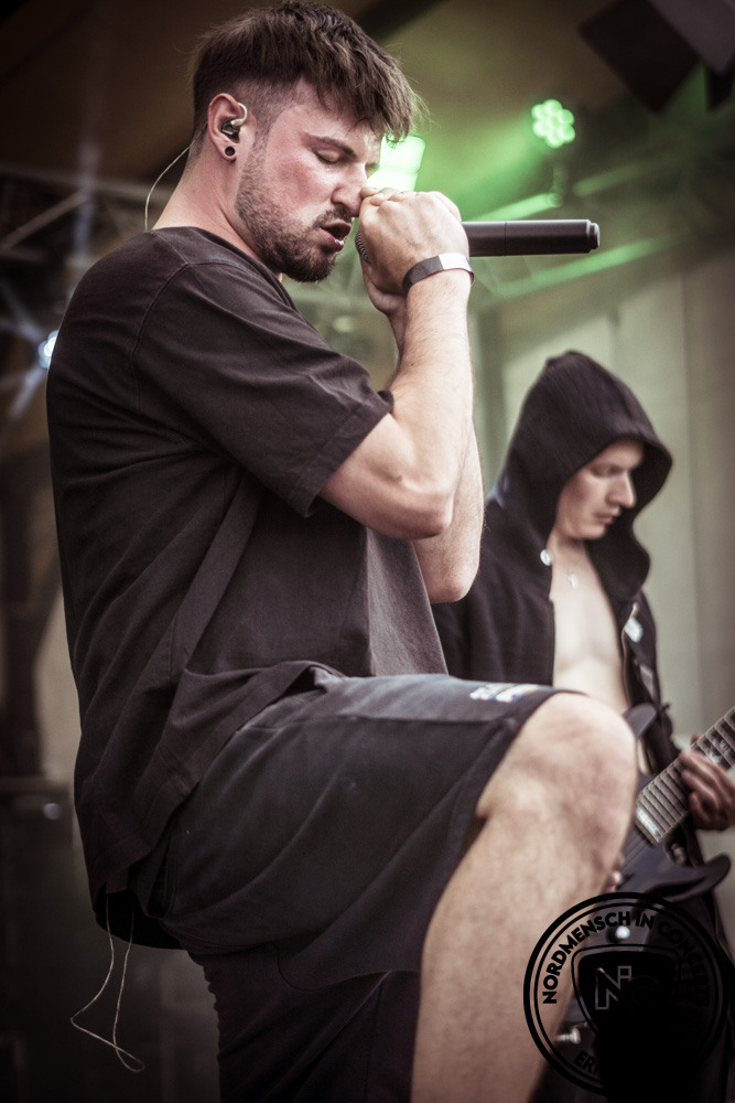 Anschließend ging’s wieder einen Stock tiefer, zumindest was die Stimmung der Gitarren betrifft: Deluminate aus Koblenz sind irgendwo zwischen Death Metal und Hardcore angesiedelt, nennen das ganze „Nucore“ und sorgten wieder für diverse Arten von Moshpits, inkl. einer Wall of Death.