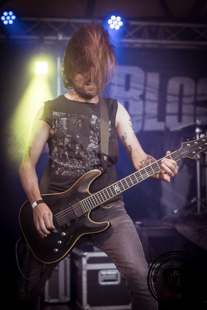 Den würdigen Abschluss des zweiten Tages bildeten Words of Farewell aus Münster in Westfalen. Sänger Alexander ist nicht nur optisch eine Maschine, auch stimmlich und stimmungsmäßig gab der muskelbepackte Hüne Vollgas. Außerdem bemerkenswert: Eine Death Metal-Band, bei der der Bass nicht nur gut beschäftigt, sondern tatsächlich auch zu hören war! Und das, obwohl sich neben der üblichen Besetzung (zwei Gitarren, Drums, Gesang und eben Bass) auch noch ein Keyboarder auf die dann doch gar nicht mehr so große Bühne quetschte. Der aber den Saitenartisten mal dringend benötigte Auszeiten vom beständigen Staccato-Riffing verschaffte, so dass diese mal die Hand ausschütteln konnten. Zur Zugabe zog Alexander dann auf vielfachen Wunsch vor allem des weiblichen Publikums dann doch noch sein Shirt aus, nicht ohne allerdings vorher noch das obligatorische „Band vor Publikum“-Bild als Teil des Deals machen zu lassen.