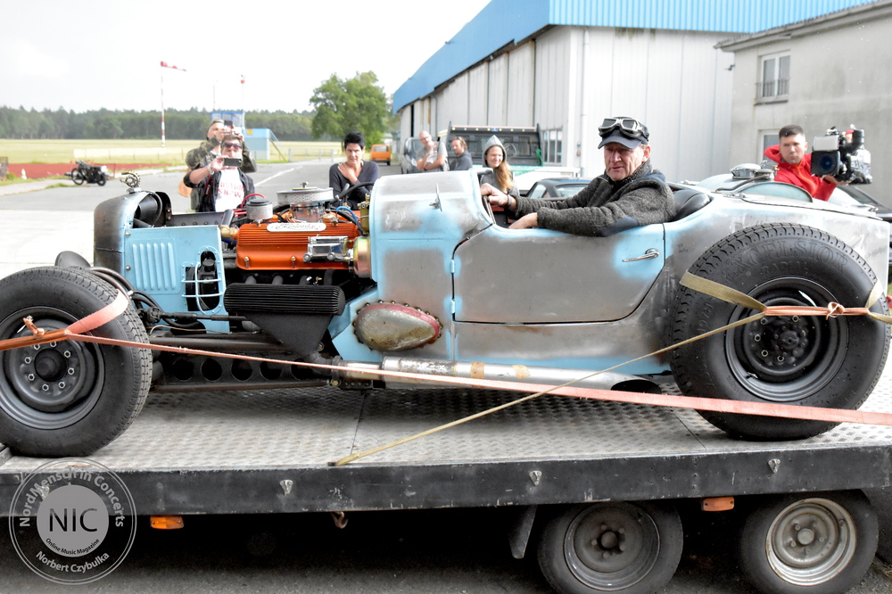 Noch im Juli, dem Zeitplan deutlich hinterher, sieht das Auto nach Vorlage des klassischen Renners total schmuck aus. Der Motor blubbert böse vor sich hin und in „babyblau“ wird das Auto auch noch niedlich aussehen. Werden die schmalen Reifen die unbändigen PS auf die Straße bekommen? Der original Koslowsky V8 8,2l Motor basiert auf einem Ford Motorblock mit eigens entwickeltem Kopf. Aus den originalen 300 PS dürften jetzt ca 450 geworden sein. Die heutige Probefahrt soll dazu dienen, das Getriebe auf die Renndistanz abzustimmen. Bis zum Rennen bekommt das Baby auch noch eine Frontscheibe und Motorhaube. Noch etwas aufgehübscht warten wir auf die Präsentation vor dem Rennen. Zugeständnisse an das Original mussten natürlich auch gemacht werden. Ich sag nur „Fack for TÜV“…
