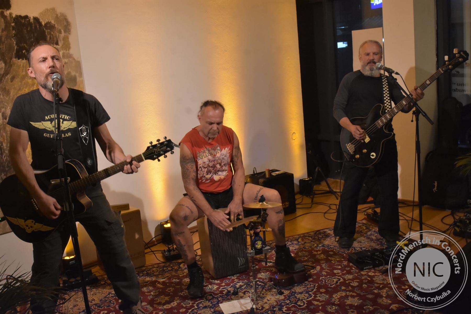 Die erste Band des Abends waren die Acoustic Guerillas. Eigentlich gibt es die Band schon seit etlichen Jahren. Ohne sich jemals aufzulösen, fanden jedoch nie wieder Proben, geschweige Konzerte statt. Seit dem Corona-Lockdown nun die Rolle rückwärts. Plötzlich ist wieder Akustische Musik gefragt und allen voran „Maschine Nitrox“ sorgt sich um Auftritte der Truppe. Gespielt wird ausschließlich Cover. Von den Ramones bis Motörhead ist alles dabei, was Spaß bringt.