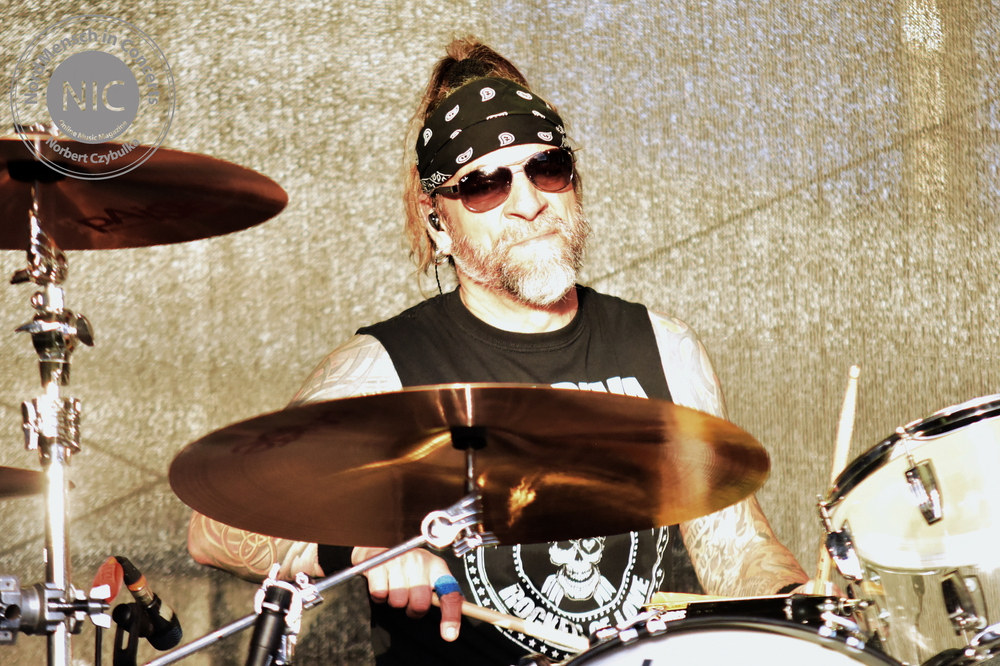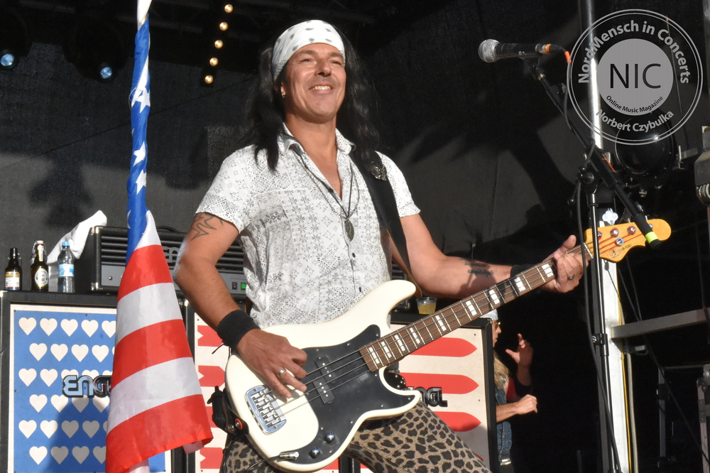 Heute jedoch ist der Start zur Festival-Tour. Eine komplett andere Setlist wurde uns dargeboten. Zurück in die Party-Cover-Zeit werden mit „Lolita“, „Wild Wild Life“ und im Zugabenblock „Rocket Of Love“ nur drei eigene Songs gespielt. Liegt es an der Tour oder am neuen Personal? Im November wurde mit Markus Kullmann ein neuer Drummer vorgestellt, denn Tim Husung hatte die Band verlassen, um eigene Projekte zu starten. Nun stand für den „durch eine Menge Trouble verhinderten“ Gitarristen J.J. Love ein als Nico McNelly vorgestellter neuer Gitarrist auf der linken Bühnenseite. Dabei handelt es sich jedoch um keinen Geringeren als Nico Schliemann. Der Ausnahmegitarrist spielt nicht nur auf diversen Alben bekannter Künstler als Studiomusiker mit, er ist unter anderem auch Mitglied der Liveband um das Electro-Synth-Pop-Duo Glasperlenspiel.
