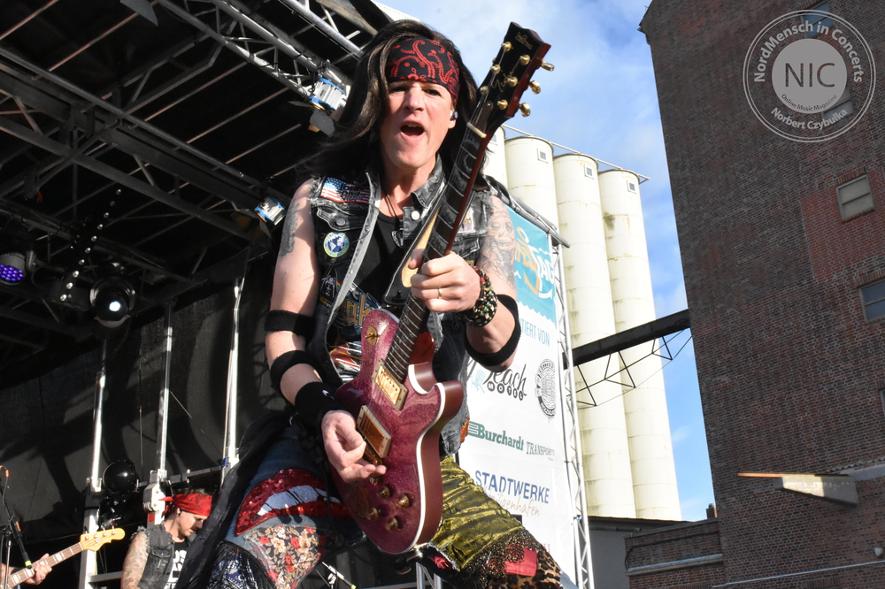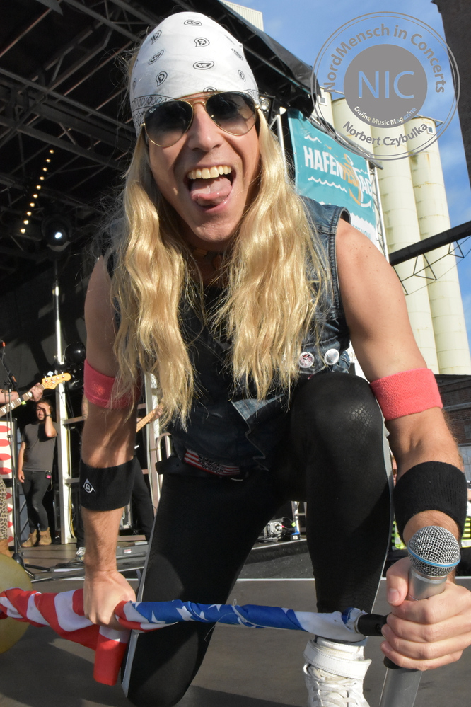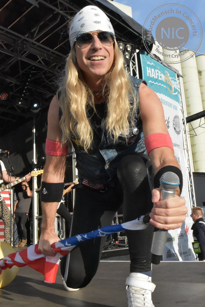 John Diva & the Rockets of Love beginnen heute ihre diesjährige Festival-Sommertour hier in Heiligenhafen. Die „Masters of Hairmetal“ begeistern immer mehr Publikum aller Generationen, und so ist es auch heute. Jung und Alt findet sich gleichermaßen vor der großen Mainstage mitten im Industriebereich des Hafens, vor der Kulisse der großen Getreidesilos. Auch die dort vertäuten Schiffe, ob Fischkutter oder historischer Segler, sind als Tribünen missbraucht und gut gefüllt.