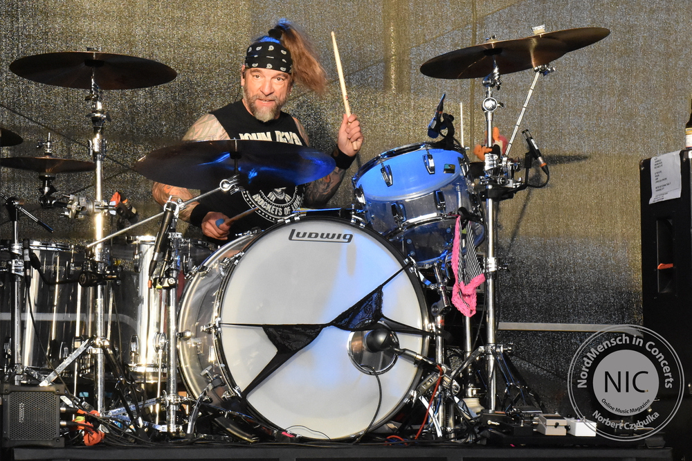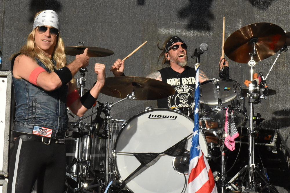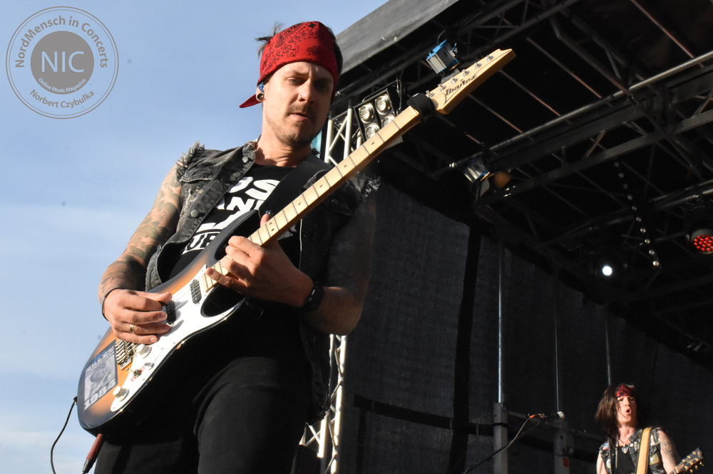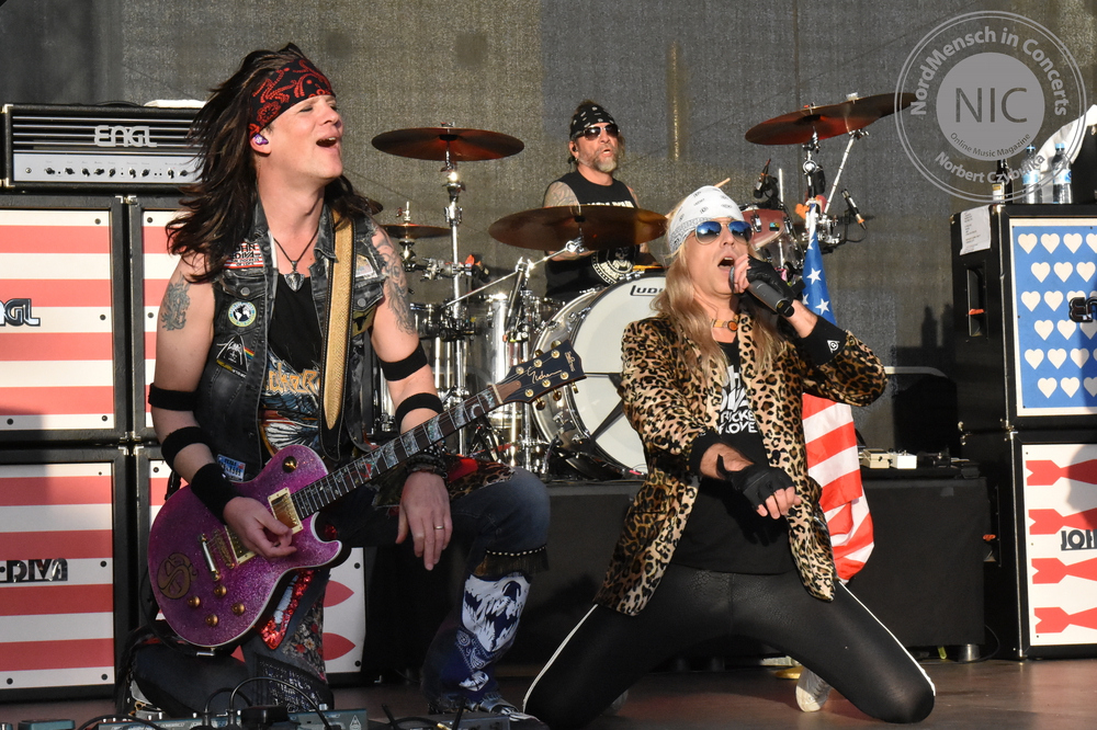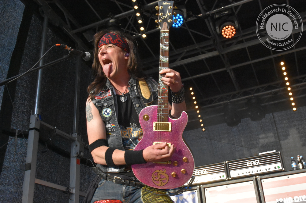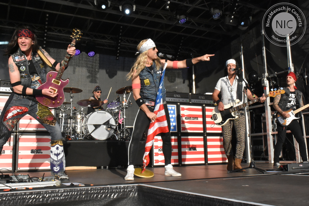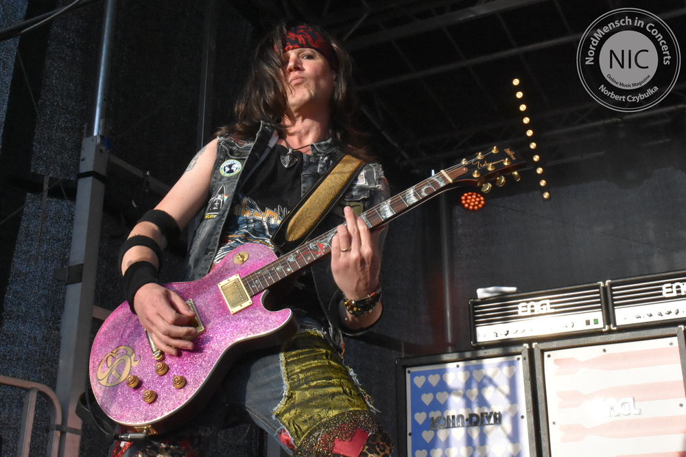 Ich stehe allein und exklusiv im Fotograben. Kein anderer Kollege lässt sich bei diesem Highlight blicken. 20:00 Uhr, die Band kommt pünktlich auf die Bühne. Nach einem instrumentalen Intro folgt nun auch der Frontmann. John Diva, wie immer mit Bandana, blonder Mähne, Glitzerjacke und Sonnenbrille, geht sofort auf die Zuschauer über einen vorgezogenen Steg zu. Bassist Remmie Martin hat ein Dauergrinsen im Gesicht und sichtlich Freude an der ausrastenden Menge. Im Blickpunkt des heutigen zweistündigen Auftritts standen die Werke um die großen Vorbilder Bon Jovi, Twisted Sister und Guns N´Roses. Aber auch die Nebenschauplätze von Deep Purple erfreuten sich großer Beliebtheit. Außergewöhnlich gute Interpretationen des von Deep Purple gecoverten und bekannt gemachten „Hush“, im Original von Joe South, sowie Journeys „Don’t Stop Believin'“ zählten zu den Highlights des Konzertes im gleißenden Sonnenschein. Ein Wetter, wie es sich für „Californier“ gehört, möchte man meinen. Viermal wechselte John Diva sein Bühnenoutfit. Die sehr bunte Mischung an Songs sprach so ziemlich jeden Gast an. Die Bühnenshow kam allerdings erst mit Einbruch der Dämmerung so richtig gut zur Geltung.