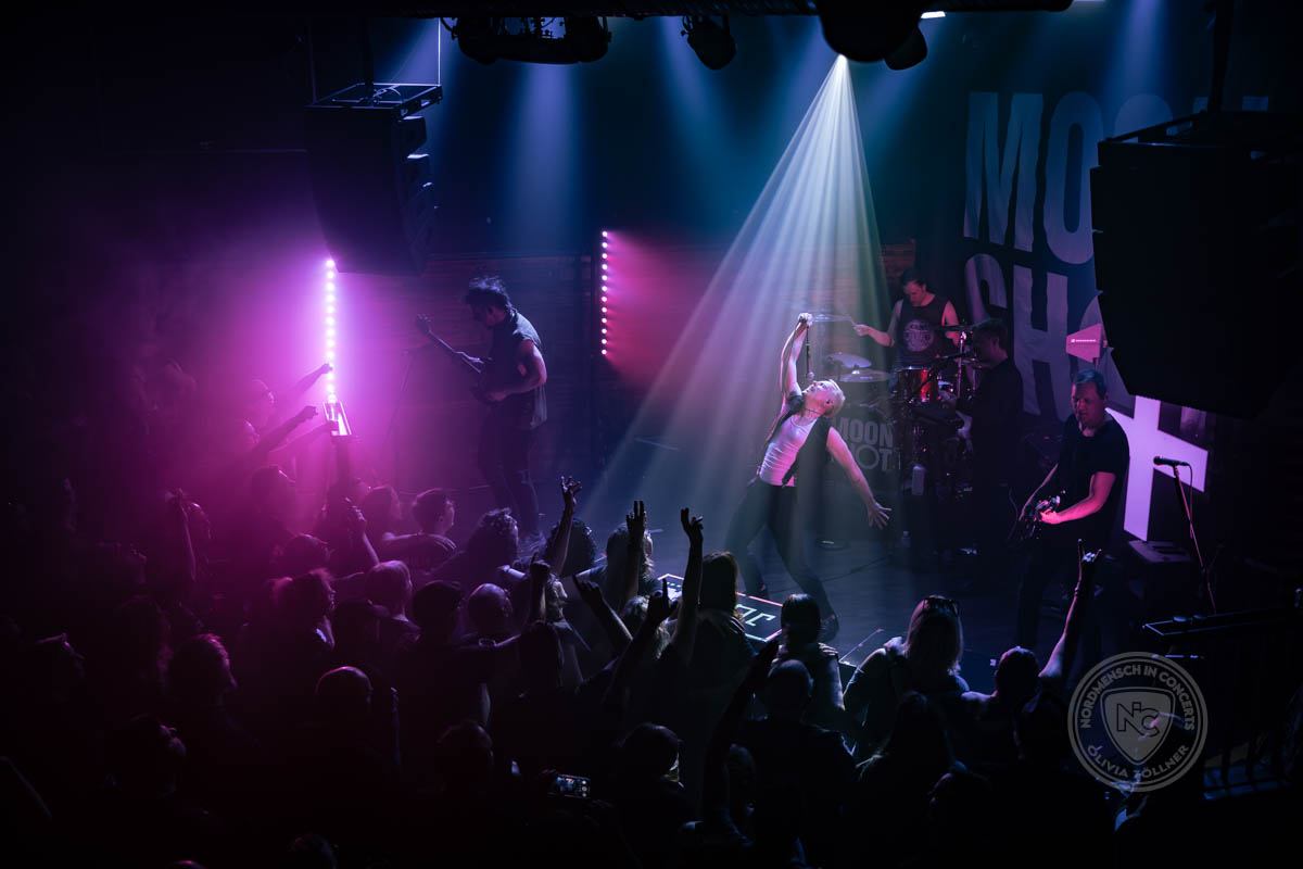 Es ist Mittwochabend, einen Tag vor dem Maifeiertag, und im Rockpalast in Bochum ist richtig was los. Die Show ist nicht ausverkauft, trotzdem ist der Club ordentlich gefüllt und die Stimmung ist gut. Act des Abends: die finnische Supergroup Moon Shot, die unter anderem aus (ehemaligen) Mitgliedern von Children of Bodom und Disco Ensemble besteht. Moon Shot spielen powervollen Alternative Rock – und wer sie schon einmal live gesehen hat, weiß, dass sie grandiose Entertainer-Qualitäten auf die Bühne bringen. Bei Gesprächen im Publikum wird deutlich: viele der anwesenden Fans kennen die Band durch ihre Support Tour mit The New Roses, sie wissen also recht genau, was sie heute Abend erwartet. Vor allem die Front Row setzt sich zusammen aus einigen Hardlinern, von denen einzelne sogar bis aus Finnland angereist sind, um Moon Shot auf ihrer Deutschlandtour zu begleiten. In der Luft liegen Vorfreude und Begeisterung und eine allgemein entspannte Atmosphäre.