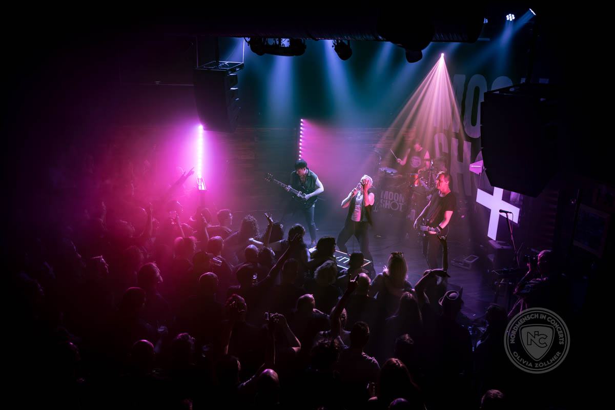 Anstelle eines Support Acts für die gesamte Tour haben die Finnen sich für jede Show auf die Suche nach lokalen Bands begeben, die den Abend eröffnen. So betritt um 19:00 Uhr die Dortmunder Band Markk 13 die Bühne, um dem Publikum einzuheizen. Mit ihrem Sound in Richtung Heavy / Glam Metal passen die Routiniers gut ins Programm. Trotzdem ist es erst einmal ein gegenseitiges Beschnuppern, denn den meisten dürfte der Support Act nicht unbedingt bekannt sein, wurde er von Moon Shot erst kurz vor der Show bekanntgegeben.