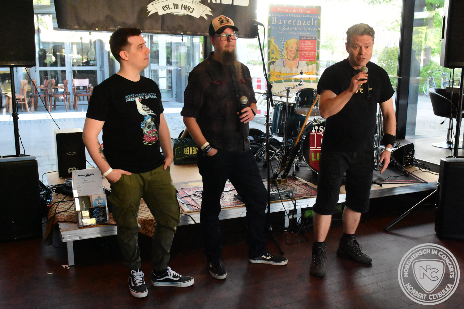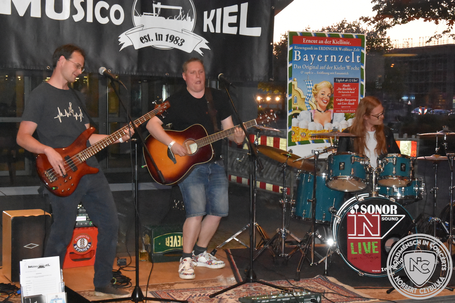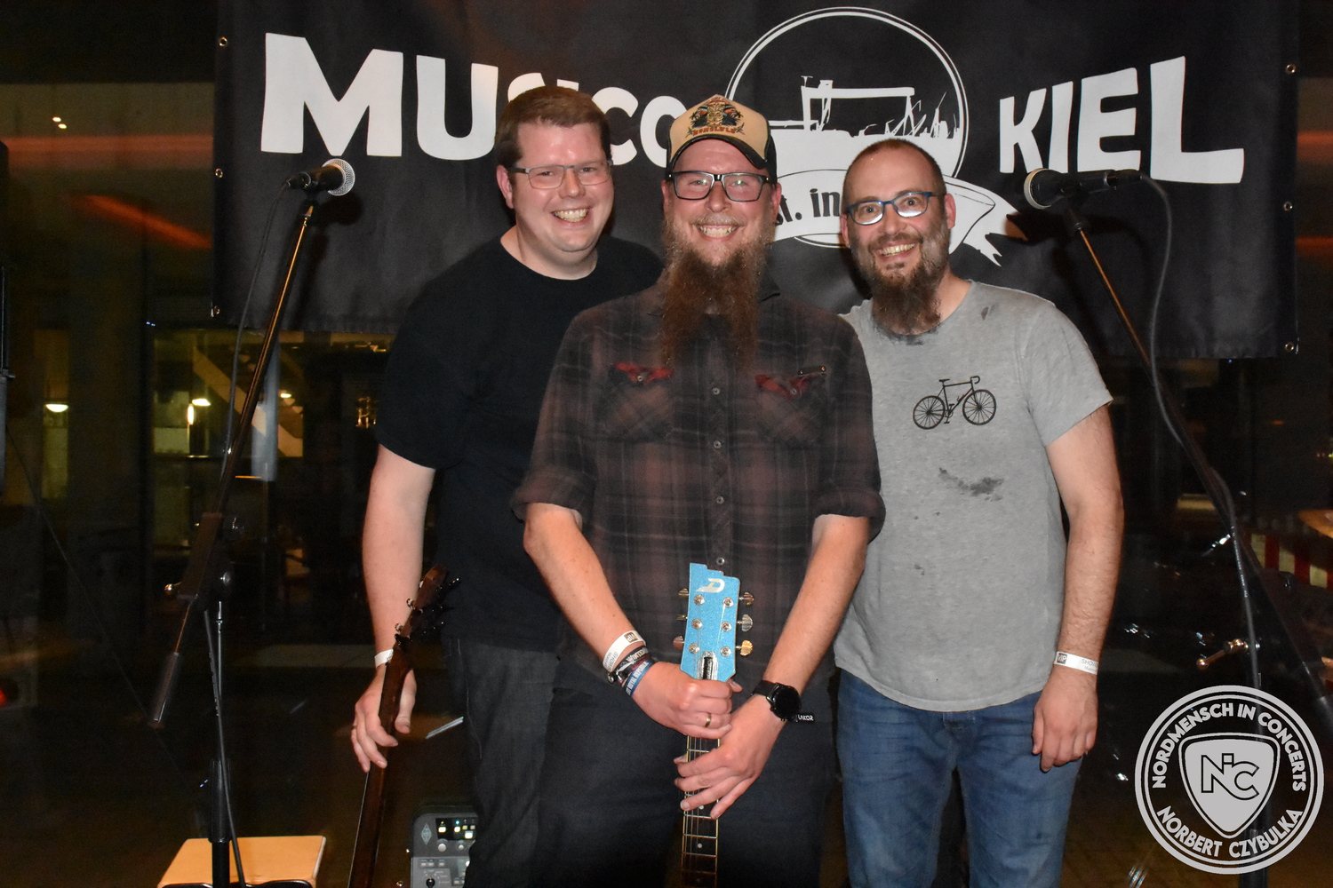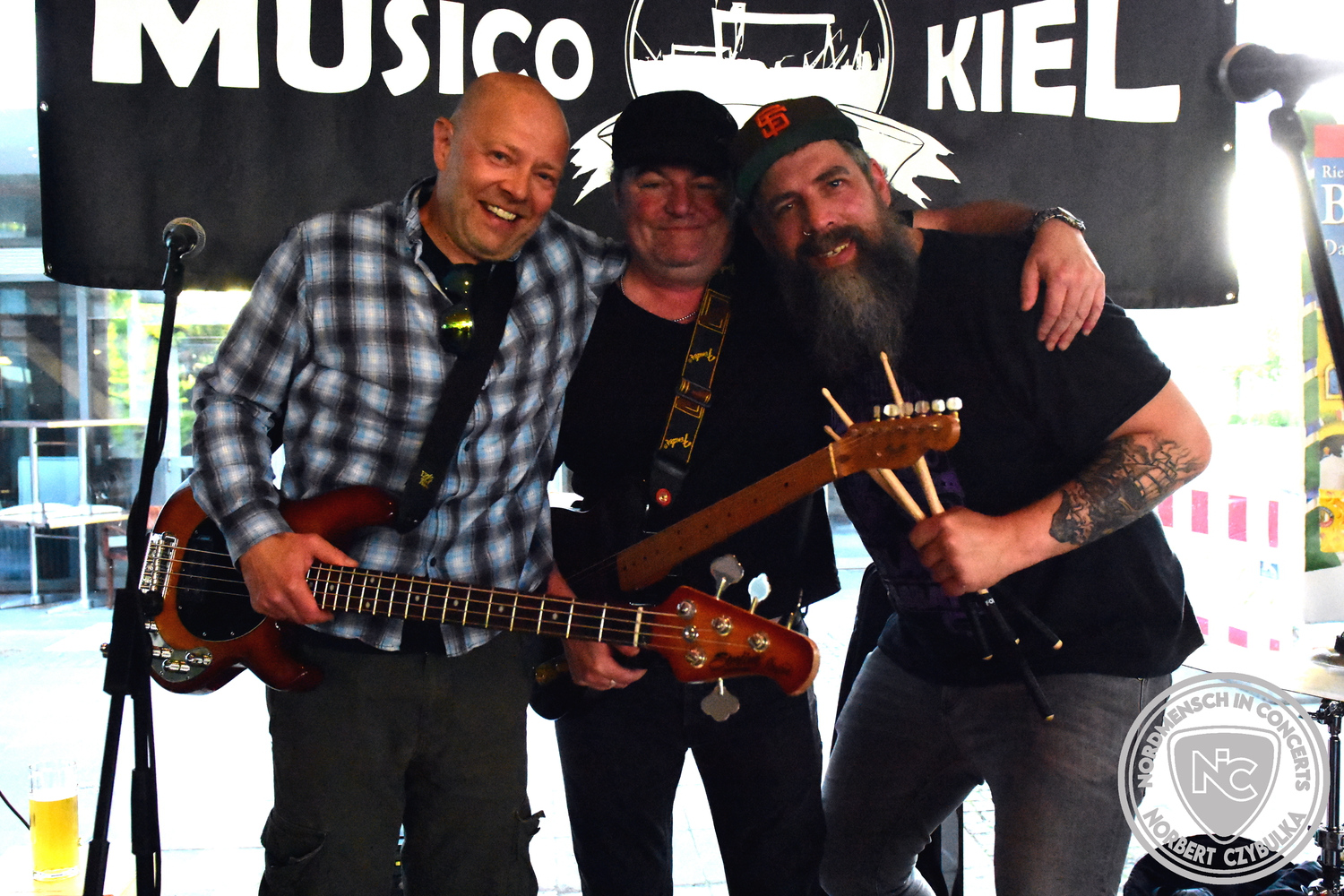 Den Anfang machten The Jones´s. Das Rock-Cover-Trio entstand vor vier Monaten aus Zufall. Bei einem Konzert der Acoustic Guerillas in der Kieler Innenstadt nutzen Ritchie und Ritchie, die als Gäste anwesend waren, die Setpause, um sich die Instrumente zu schnappen und zwei Titel zu jammen. Nick setzte sich an seine Drums und stieg mit ein. Die Band war geboren. Erst zwei Stunden vor dem heutigen Auftritt gab es die erste Bandprobe. Trotzdem rissen die drei mit ihren Covern von AC-DC (Back in Black), Temple of the Dog (Hunger Strike), Stone Temple Pilots (Plush) und den Foo Fighters (Times Like These) sofort die Gäste von den Sitzen.