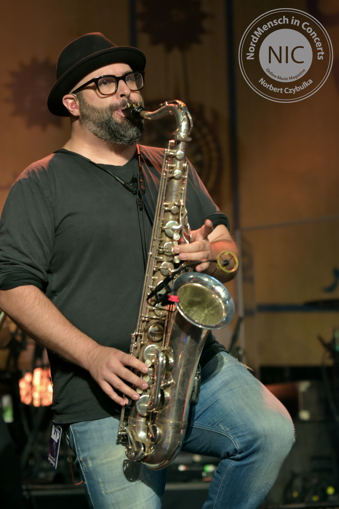 Pünktlich auf die Sekunde erscheint die Band auf der Bühne. Die frühe Anfangszeit 18:00 Uhr verwirrt, nicht nur den Meister selbst. „Vielleicht schafft man es ja noch zum Tatort nach Hause?“, fragt Wolfgang Niedecken das Publikum. Da für mich nur Fotos bei den ersten drei Titeln erlaubt sind, arbeite ich wie im Tunnel. „Drei Wünsch frei“, der erste Titel ist ratzfatz weg. „Waschsalon“ (im Unterbewusstsein singe ich ein paar Zeilen mit). „Psycho-Rodeo“ – Memo an mich > Du musst noch Bilder mit dem Weitwinkel machen und zack – Fotozeit vorbei. Es wurde mir freigestellt, ob ich die Kamera nur wegpacke oder das Haus verlasse. Das ist natürlich keine Option und so belohne ich mich bei „Widderlich“ erst einmal mit einem Hopfen-Smoothie. Kurz durchatmen und wieder rein in das Getümmel. Ich bin von der Bläsersektion total begeistert. Die drei Herren sehen aus, als ob sie bei der Bandgründung noch nicht geboren waren und bringen einen frischen Wind in die alten Titel. Als wenn alles gerade erst neu nur für diese neunköpfige Band auf der Bühne geschrieben wurde. „Nix wie bessher“ halt. Zum „Jebootsdaachspogo“ meldet sich tatsächlich jemand, der heute Geburtstag hat. Dann kommt der Moment, für den ich mir doch den Holstein-Kiel Schal von meinem Kollegen hätte leihen sollen. Wolfgang Niedecken fragt sogar nach einem solchen, während er „Ruut-wieß-blau quergestriefte Frau“ ankündigt. Er betont, dass sich die ersten zwei drei Strophen tatsächlich so zugetragen haben. Während die Band auf der Bühne loslegt, wandert die Bläsersektion einmal durch das Innenfeld und spielt dort. Beim nächsten Titel „Et ess, wie´t ess“, steht die Multiinstrumentalistin mit einem Waschbrett vor dem Bauch auf der Bühne. Anne De Wolff steht eh ständig mit neuen Instrumenten auf der Bühne. Ob nun mit Geige, E-Gitarre, Saxophon, Akustik-Klampfe, Percussion- und Schlagzeuginstrumenten oder einer Slide-Gitarre auf den Knien – diese Frau ist niemals langweilig.