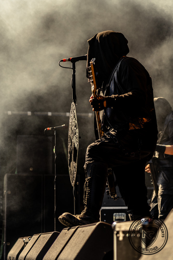 Als Kontrastprogramm folgt für uns als nächstes die deutsche Black-Metal-Band GROZA. In der Mittagssonne muten die Roben und schwarzen Schleier über den Gesichtern zugegeben etwas deplatziert an, aber man bekommt musikalisch zumindest genau das geboten, was man erwartet.