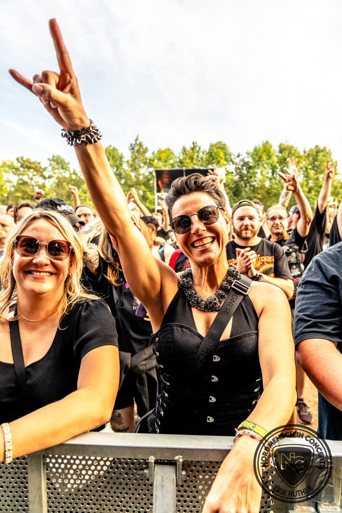 Einzig und allein getoppt wird dies nun von der sich anschließenden Hardcore-Formation WALLS OF JERICHO, deren Pits das Infield eher wie einen neuen Teil der Dune-Reihe anmuten lassen und einen guten Teil der Crowd dazu bringen, ihre Atemwege mit Masken oder Bandanas zu schützen. Staubalarm! Sängerin Candace bringt trotz Erkältung eine Energie rüber, die sich auch auf’s Publikum überträgt.